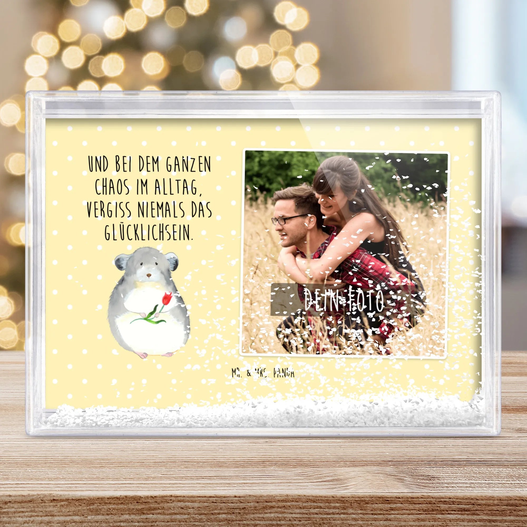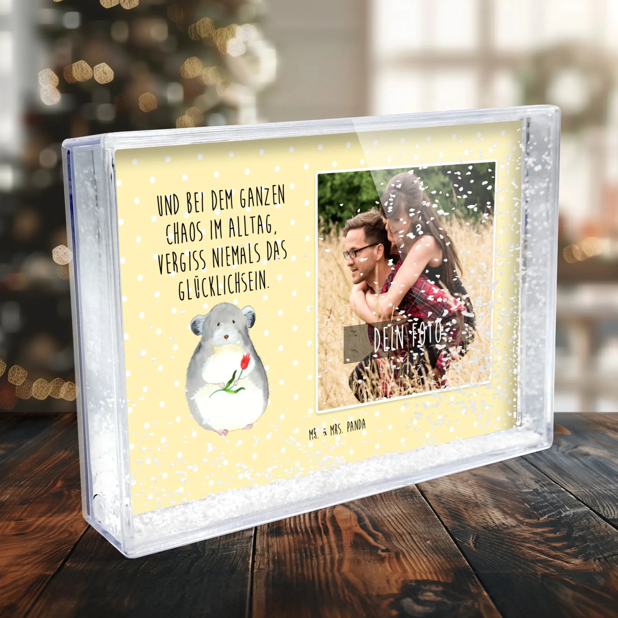 Der Schüttelrahmen mit Foto von Mr. & Mrs. Panda ist das perfekte Geschenk, um deine schönsten Erinnerungen festzuhalten. Mit einer Breite von 160 mm, einer Höhe von 110 mm und einer Tiefe von 28 mm bringt dieser Rahmen deine persönlichen Fotos zum Strahlen. Die Schnee-Füllung sorgt für eine besondere Tiefenwirkung, die dein Bild lebendig erscheinen lässt. Durch den brillanten Farbdruck wird jedes Detail deines Fotos zum Highlight. Das Acrylglas schützt dein Bild und sorgt dafür, dass es lange Freude bereitet. Personalisiere den Schüttelrahmen mit deinem eigenen Wunschfoto und bring ein Stück Heimat in jedes Zuhause. Ob für dich selbst oder als liebevolles Geschenk für Familie und Freunde, dieser Schüttelrahmen ist ein echter Hingucker. Verleihe deinen Wänden Persönlichkeit und schaffe einen kreativen Akzent in deinem Wohnraum mit diesem einzigartigen Produkt von Mr. & Mrs. Panda.