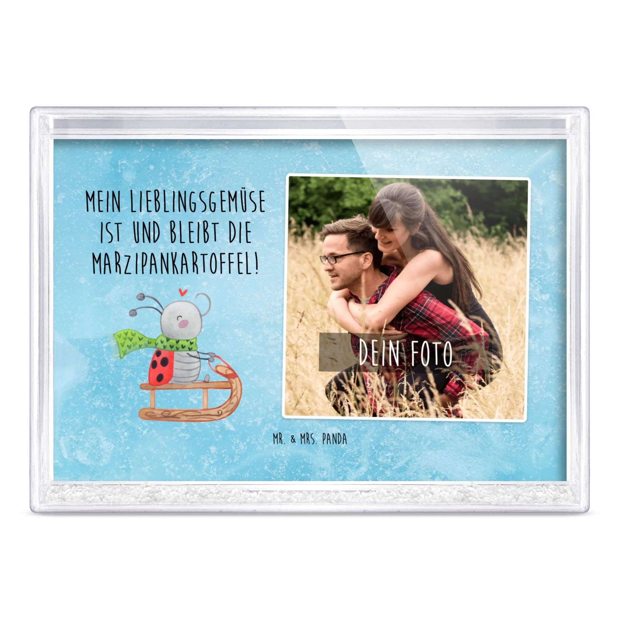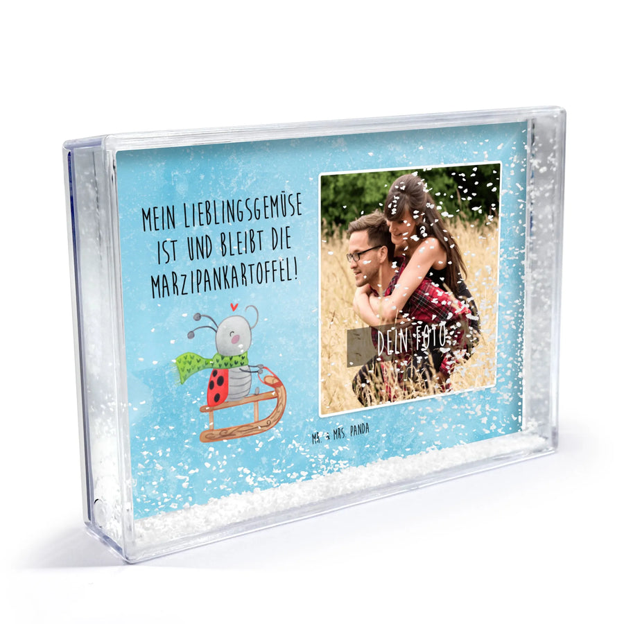 Der Schüttelrahmen mit Foto Smörle Rodeln von Mr. & Mrs. Panda ist das perfekte Geschenk für die kalte Jahreszeit! Egal, ob du nach einer originellen Geschenkidee für Weihnachten, Nikolaus oder einfach nur für ein Winterfest suchst, dieser Bilderrahmen ist ein echter Hingucker. Das fröhliche Design zeigt unseren kleinen Marienkäfer Smörle, der glücklich auf einem Schlitten durch den Schnee saust. Mit seinem grünen Schal, verziert mit kleinen Herzchen, und dem strahlenden Lächeln, wirkt der Rahmen wie ein warmherziger Gruß aus der Winterwelt.