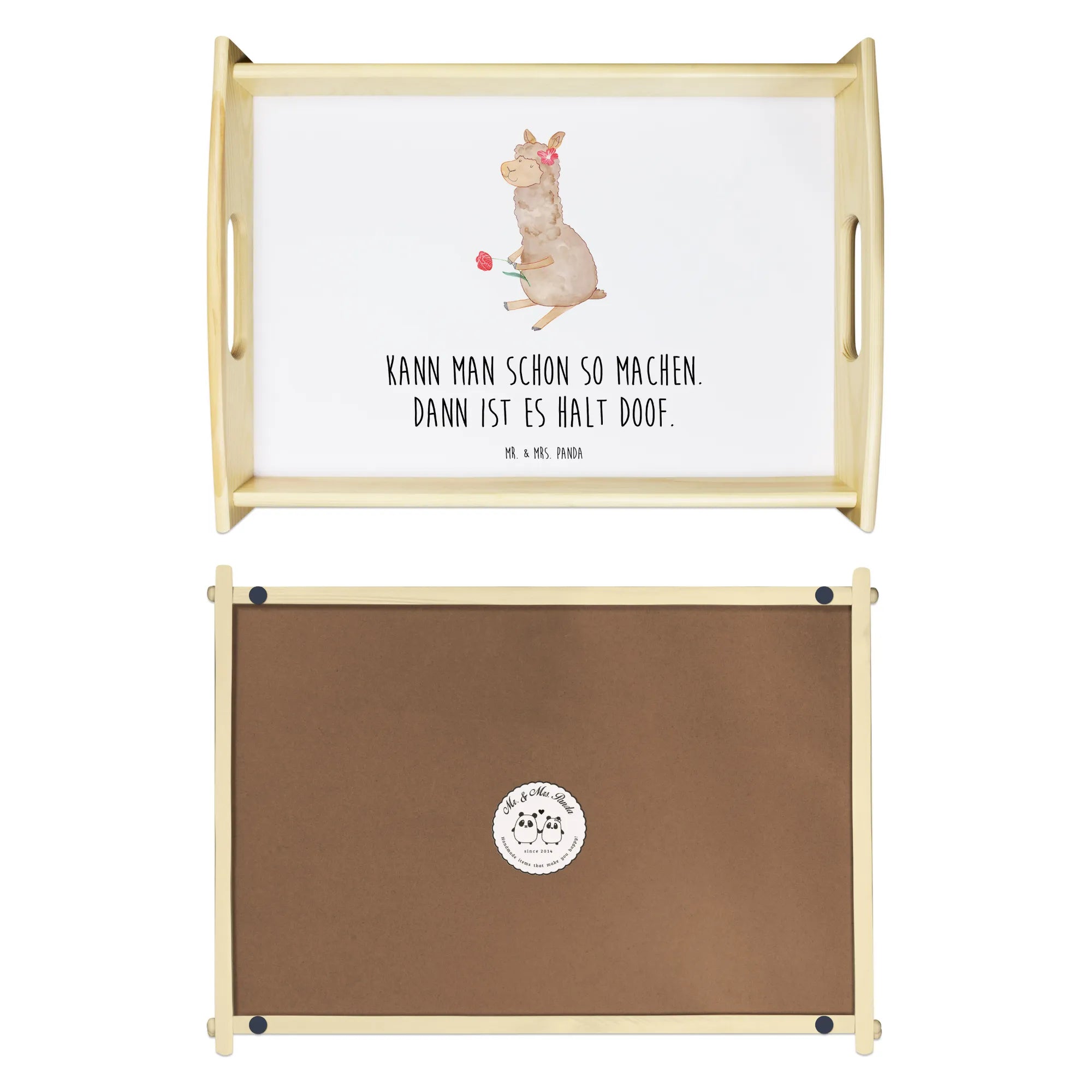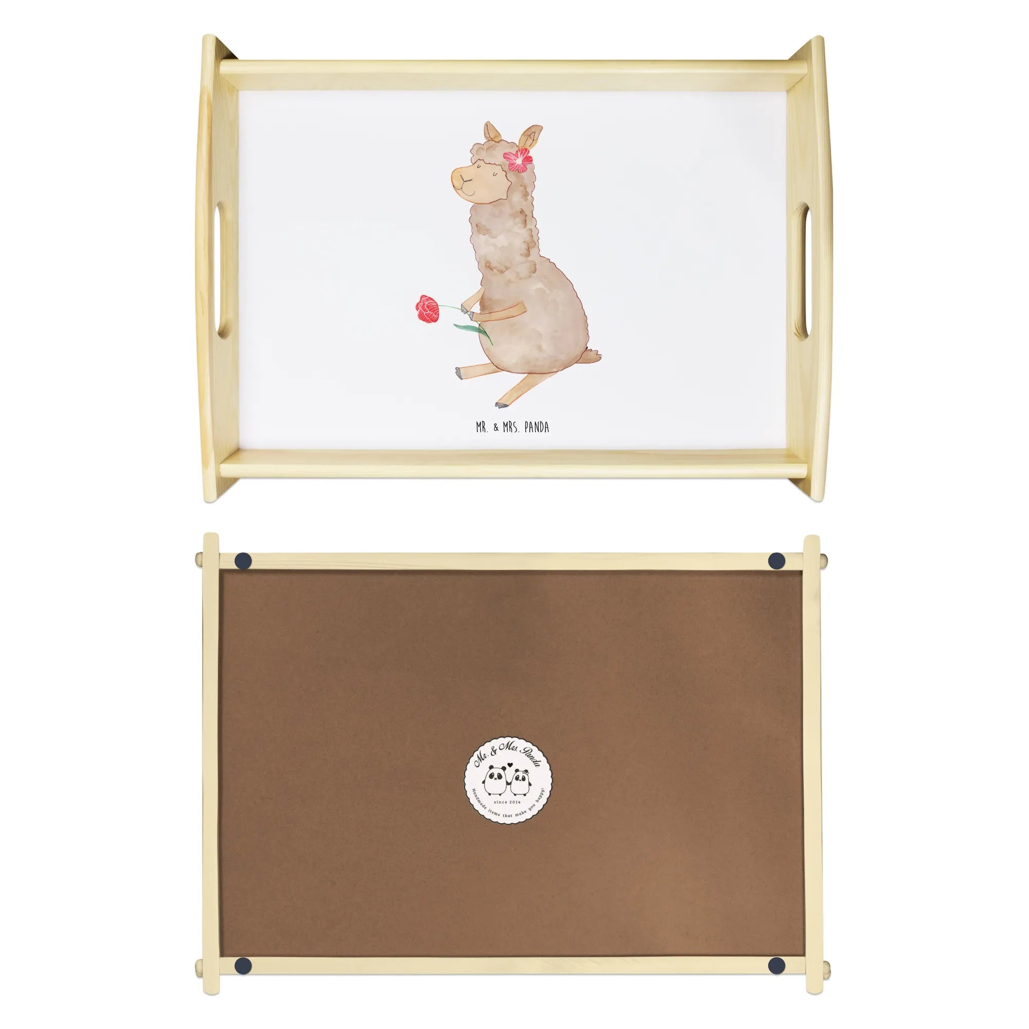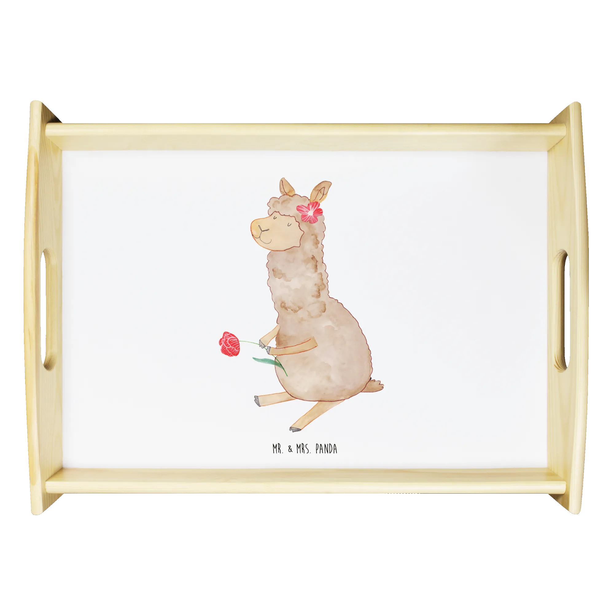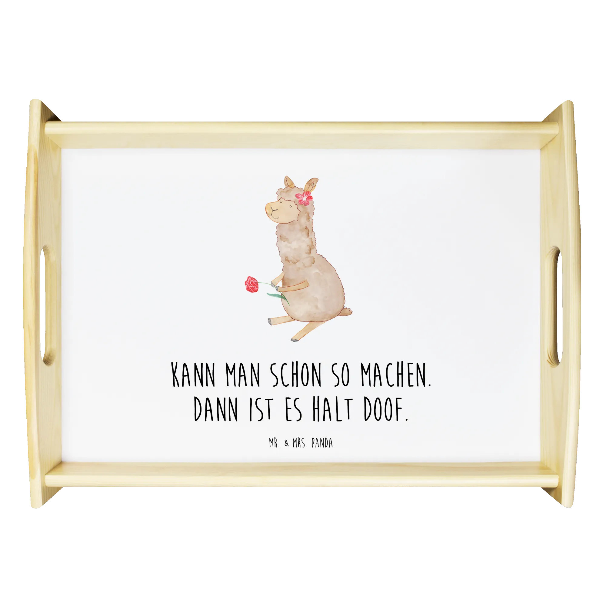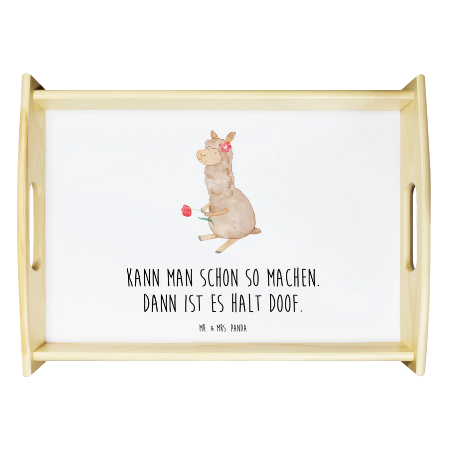 Ein zauberhaftes Serviertablett von Mr. & Mrs. Panda – das Alpaka Blume Tablett vereint funktionale Qualität mit liebevoller Illustration. Das handgezeichnete Alpaka mit Blume im Haar bringt fröhliche Leichtigkeit in dein Zuhause und ist ideal als Frühstückstablett, Küchentablett oder Dekotablett.