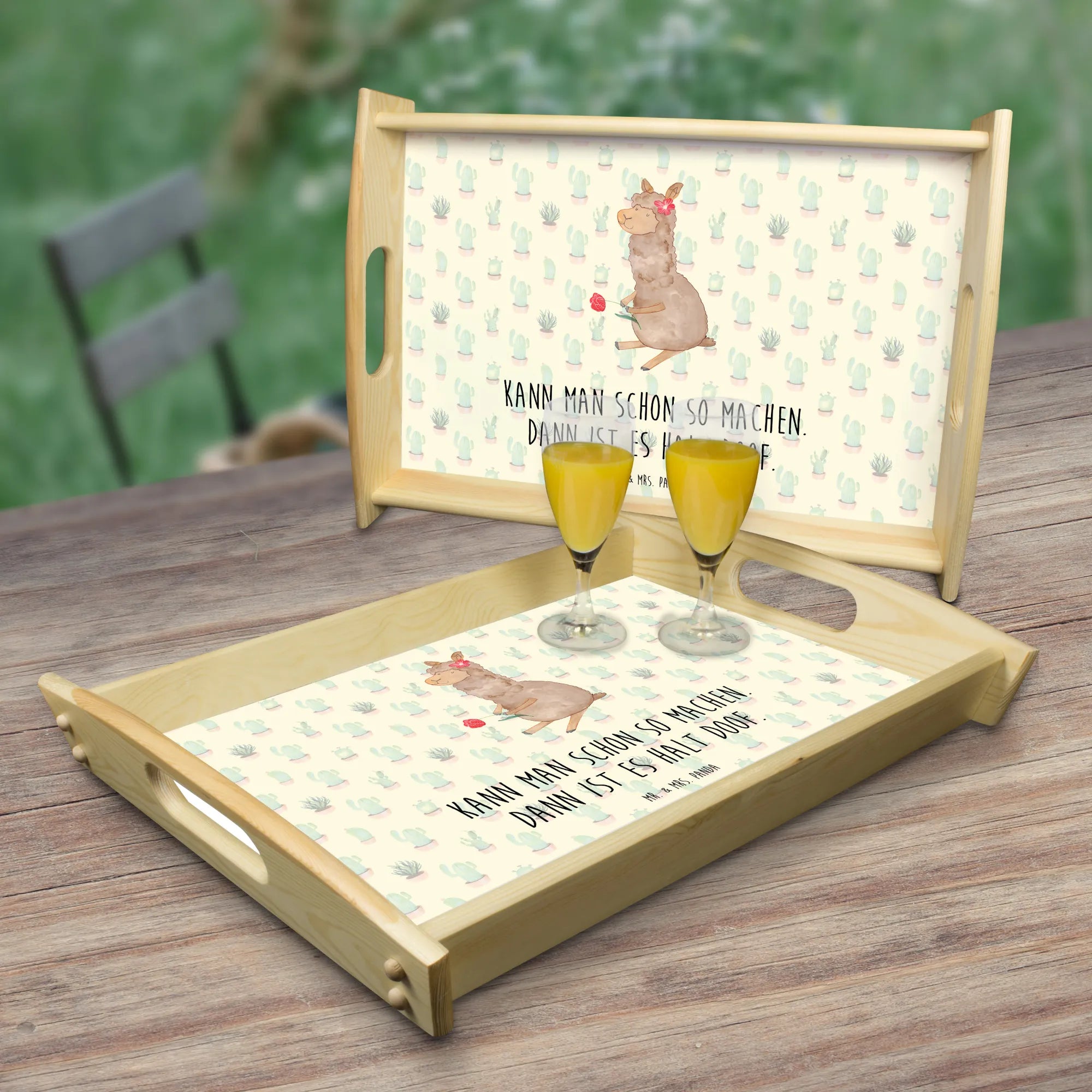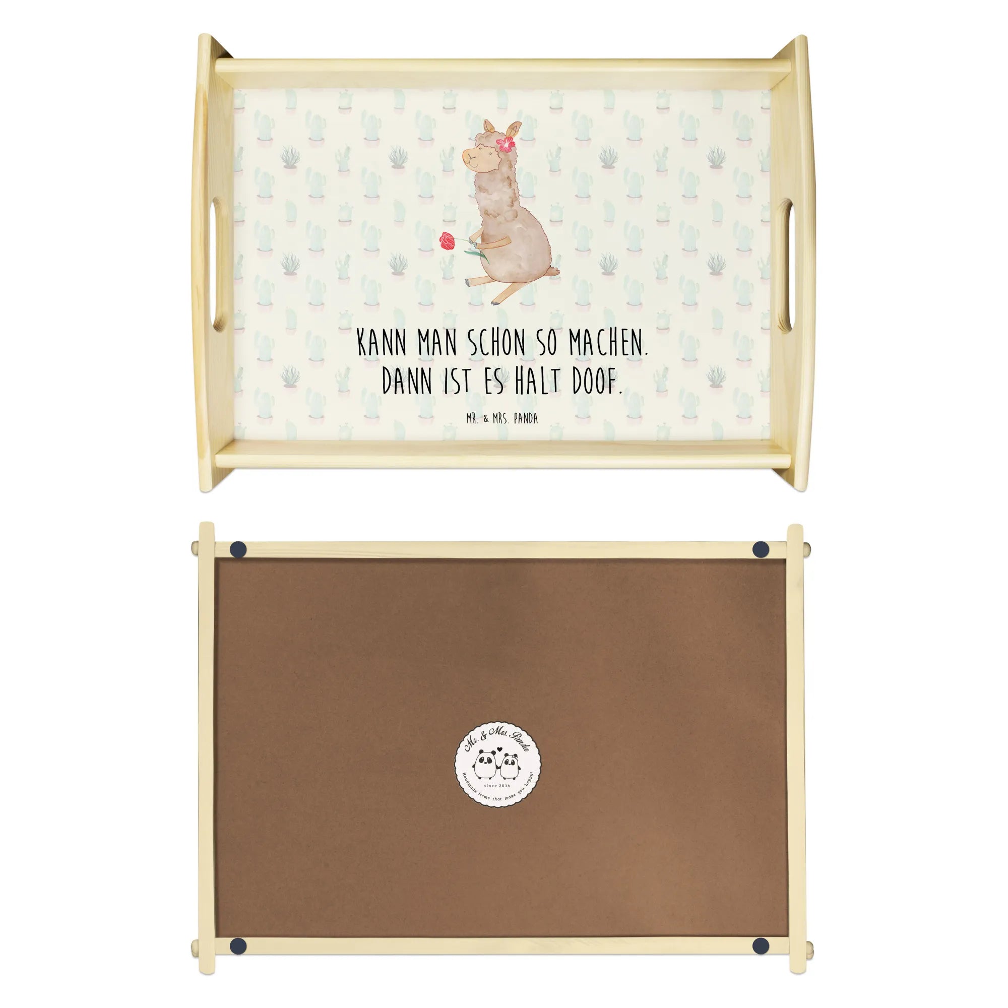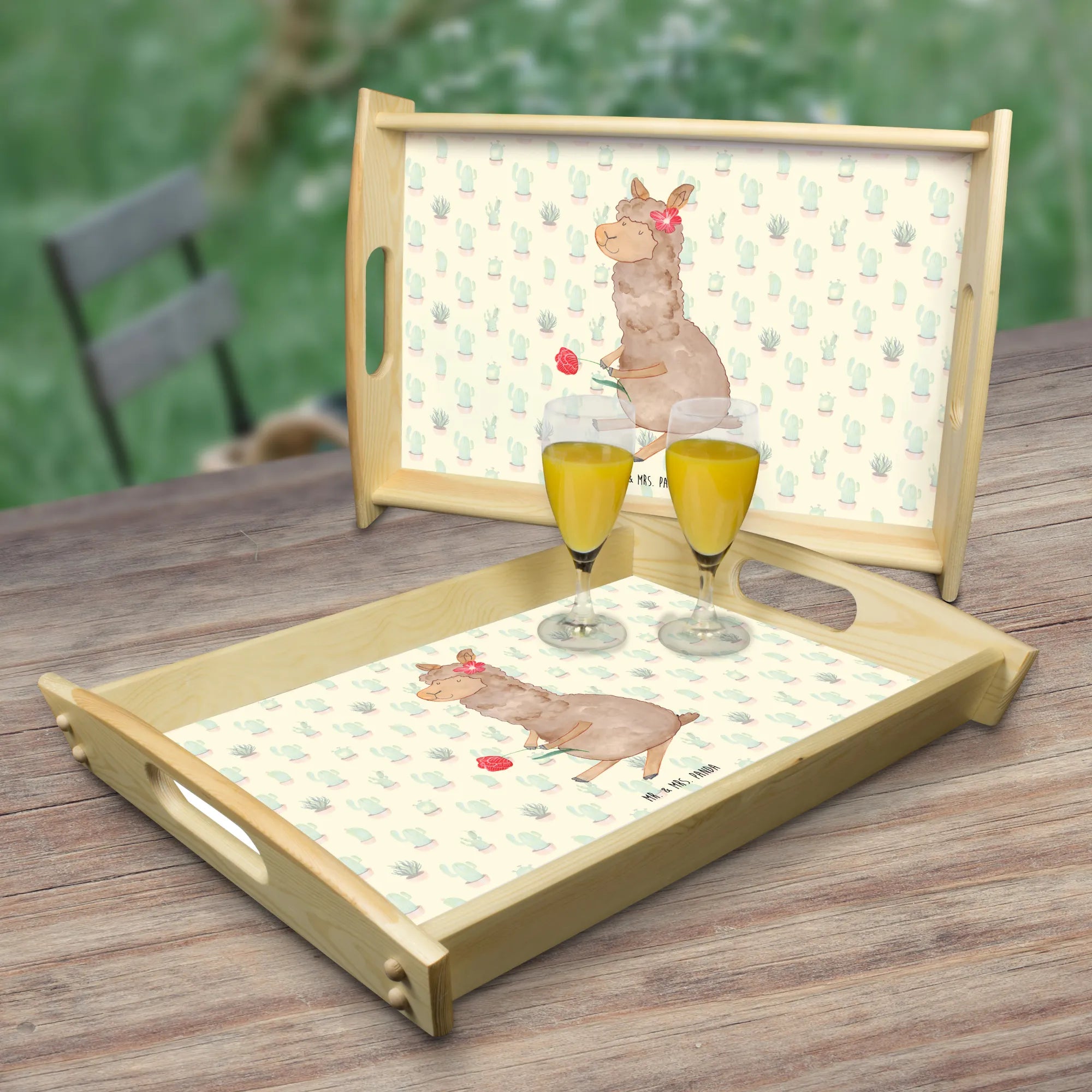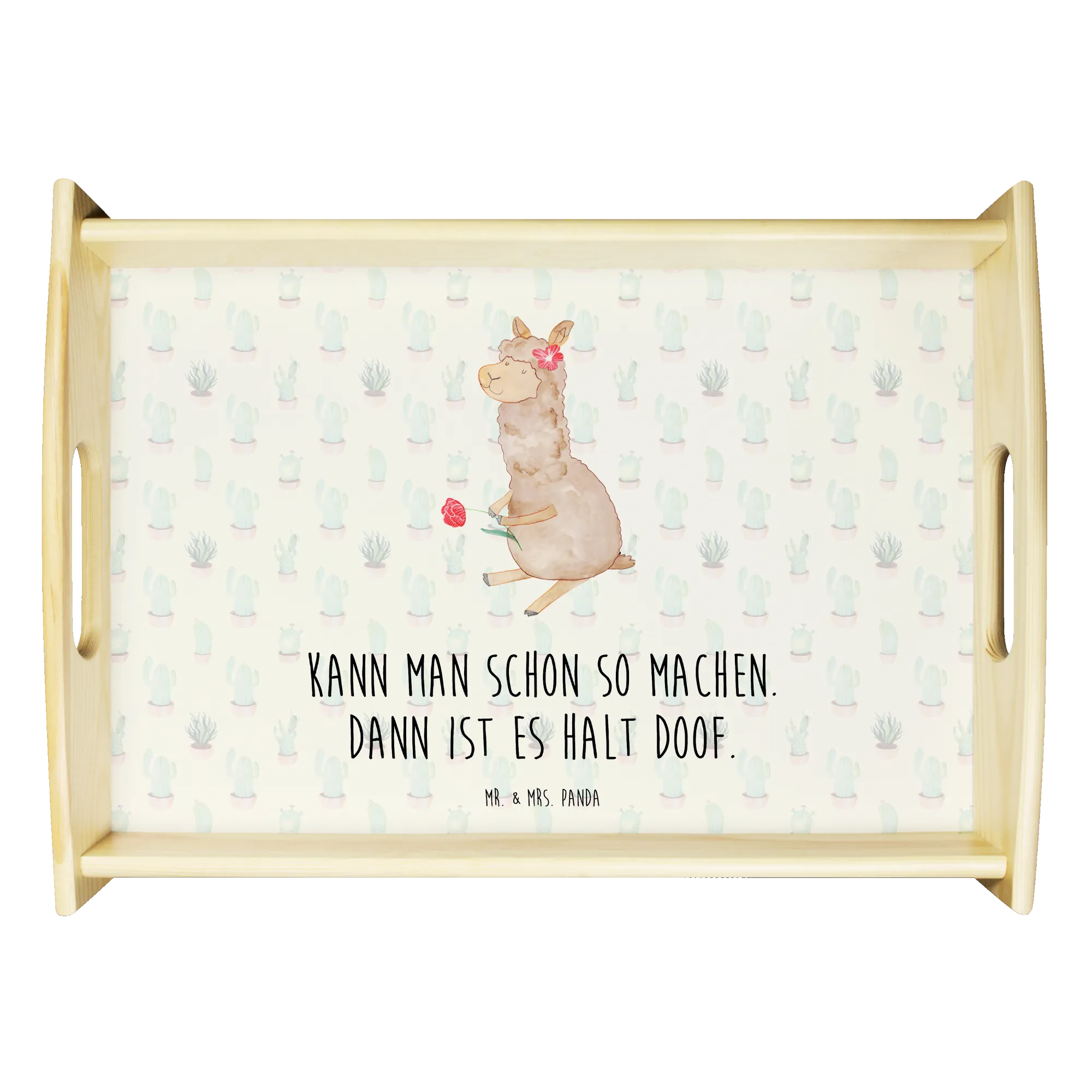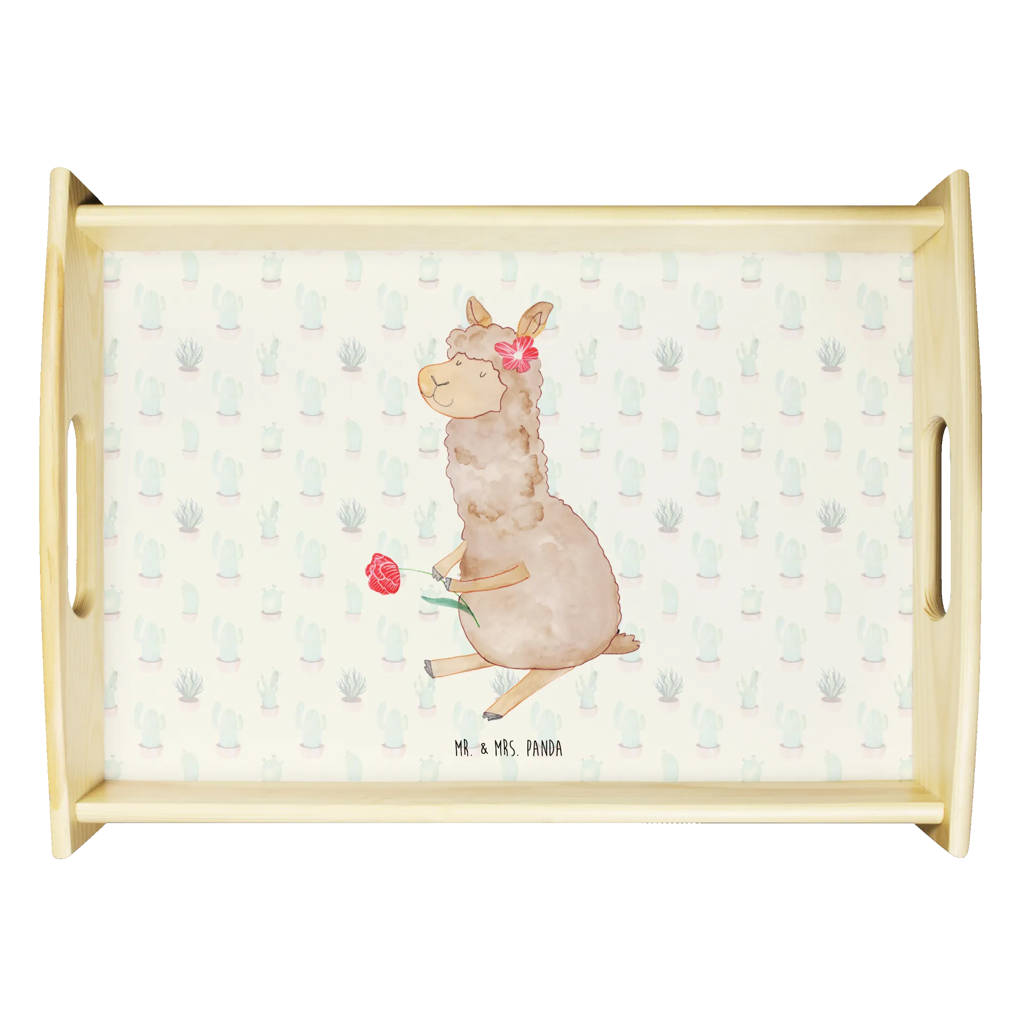 Ein zauberhaftes Serviertablett von Mr. & Mrs. Panda – das Alpaka Blume Tablett vereint funktionale Qualität mit liebevoller Illustration. Das handgezeichnete Alpaka mit Blume im Haar bringt fröhliche Leichtigkeit in dein Zuhause und ist ideal als Frühstückstablett, Küchentablett oder Dekotablett.