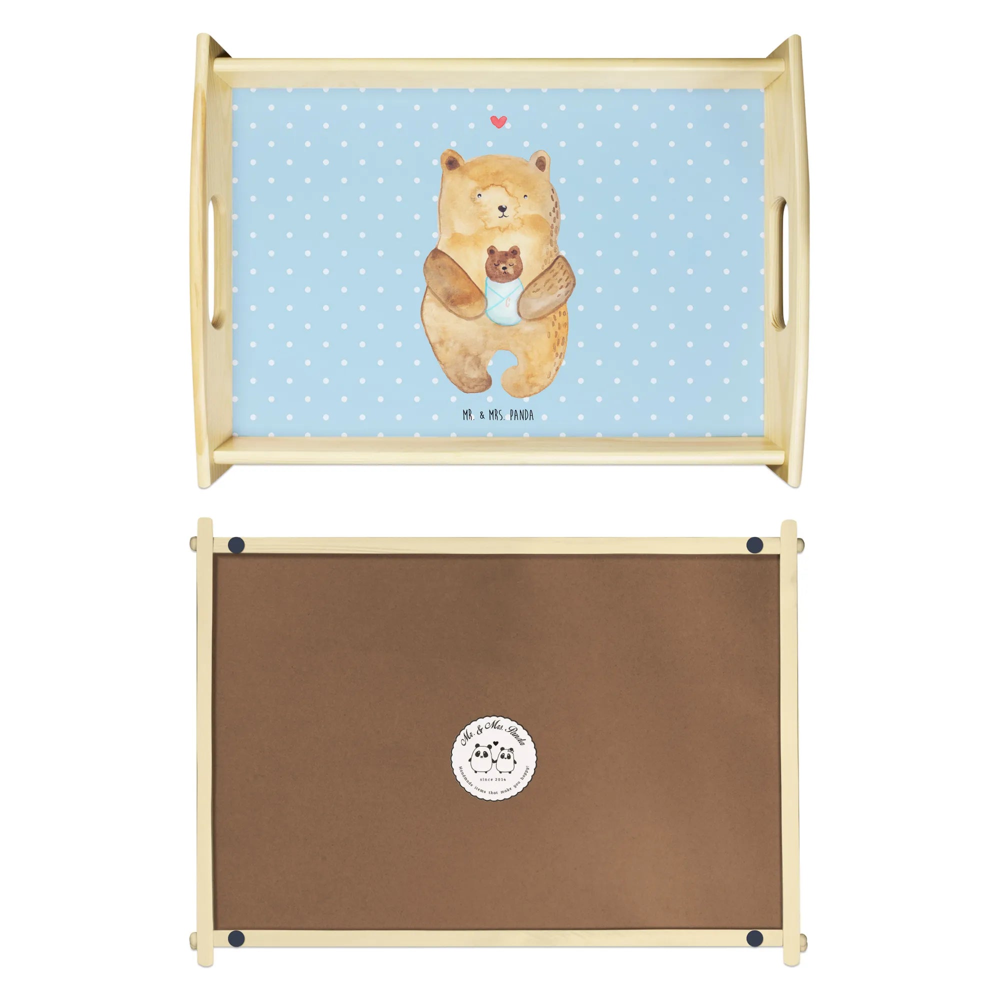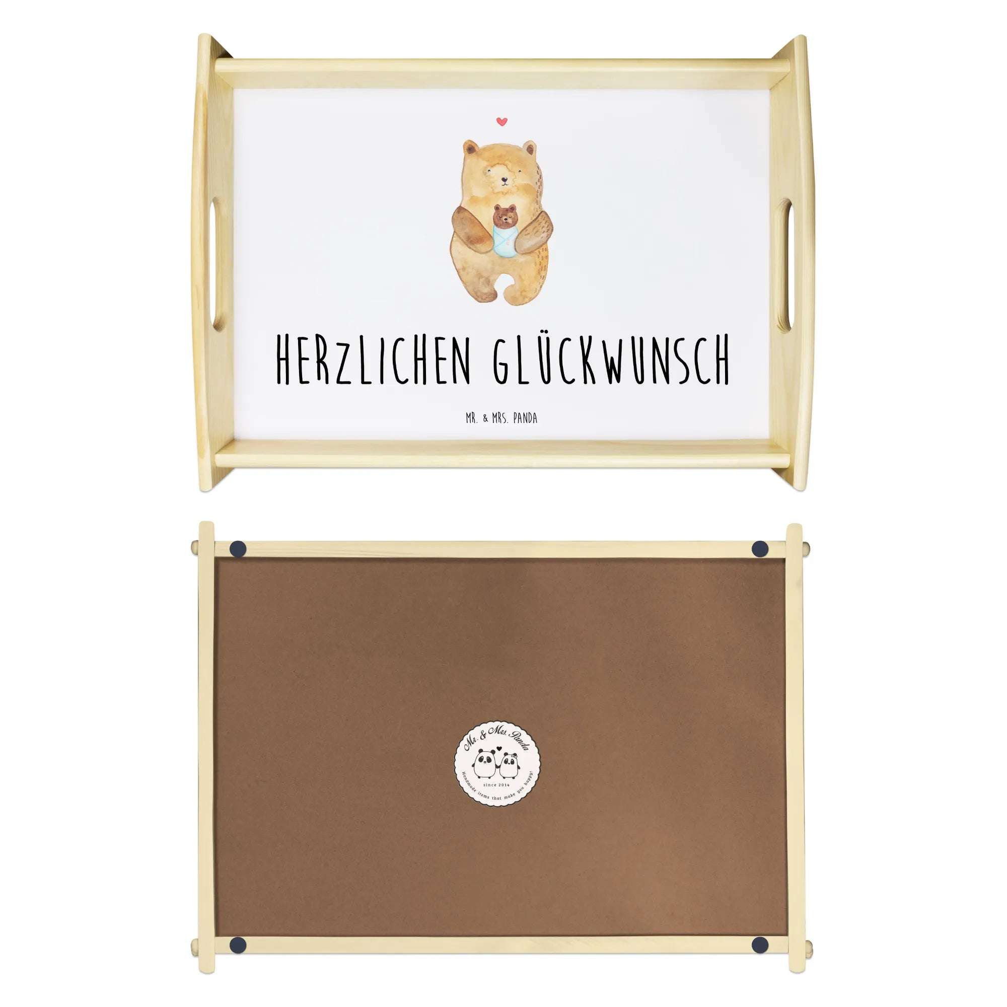 Verwöhne Deine Liebsten mit unserem bezaubernden Serviertablett von Mr. & Mrs. Panda! Mit den Maßen von 480 mm x 480 mm x 65 mm und einem gewicht von 925 g ist es nicht nur hübsch, sondern auch praktisch. Aus lasiertem Echtholz gefertigt, begeistert es mit einem lebendigen Druck, der gute Stimmung verbreitet. Egal ob beim Frühstück im Bett oder beim gemütlichen Abendessen auf dem Sofa – die seitlichen Griffmulden ermöglichen ein einfaches Tragen. Die Anti-Rutsch Pads auf der Unterseite sorgen dafür, dass alles sicher an seinem Platz bleibt. Dank der kratzfesten Oberfläche bleibt dein Tablett nach jeder Benutzung in bestem Zustand – einfach mit einem feuchten Tuch und Spülmittel abwischen, aber nicht einweichen! Beachte bitte die längere Anfertigungszeit aufgrund der besonderen Verarbeitung.