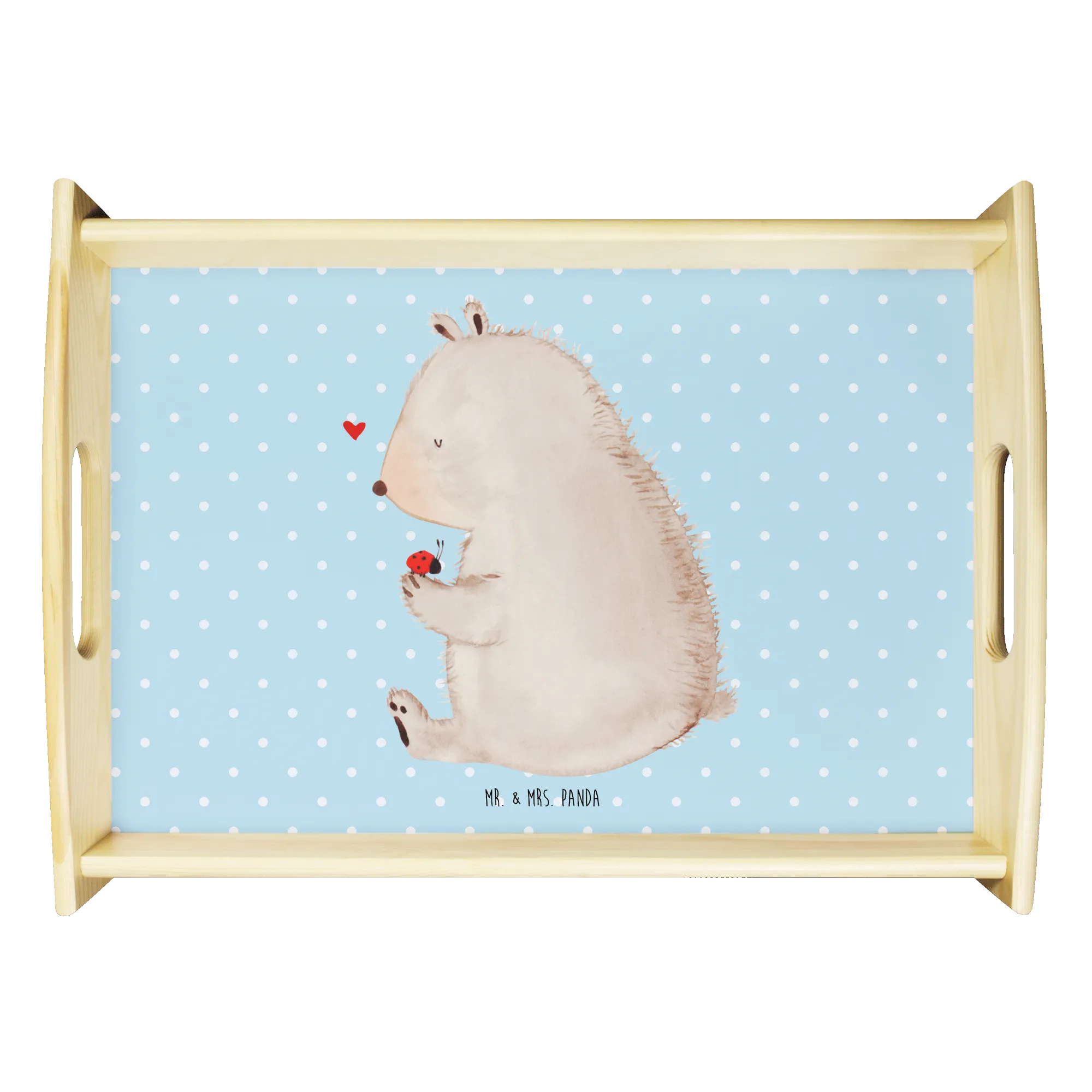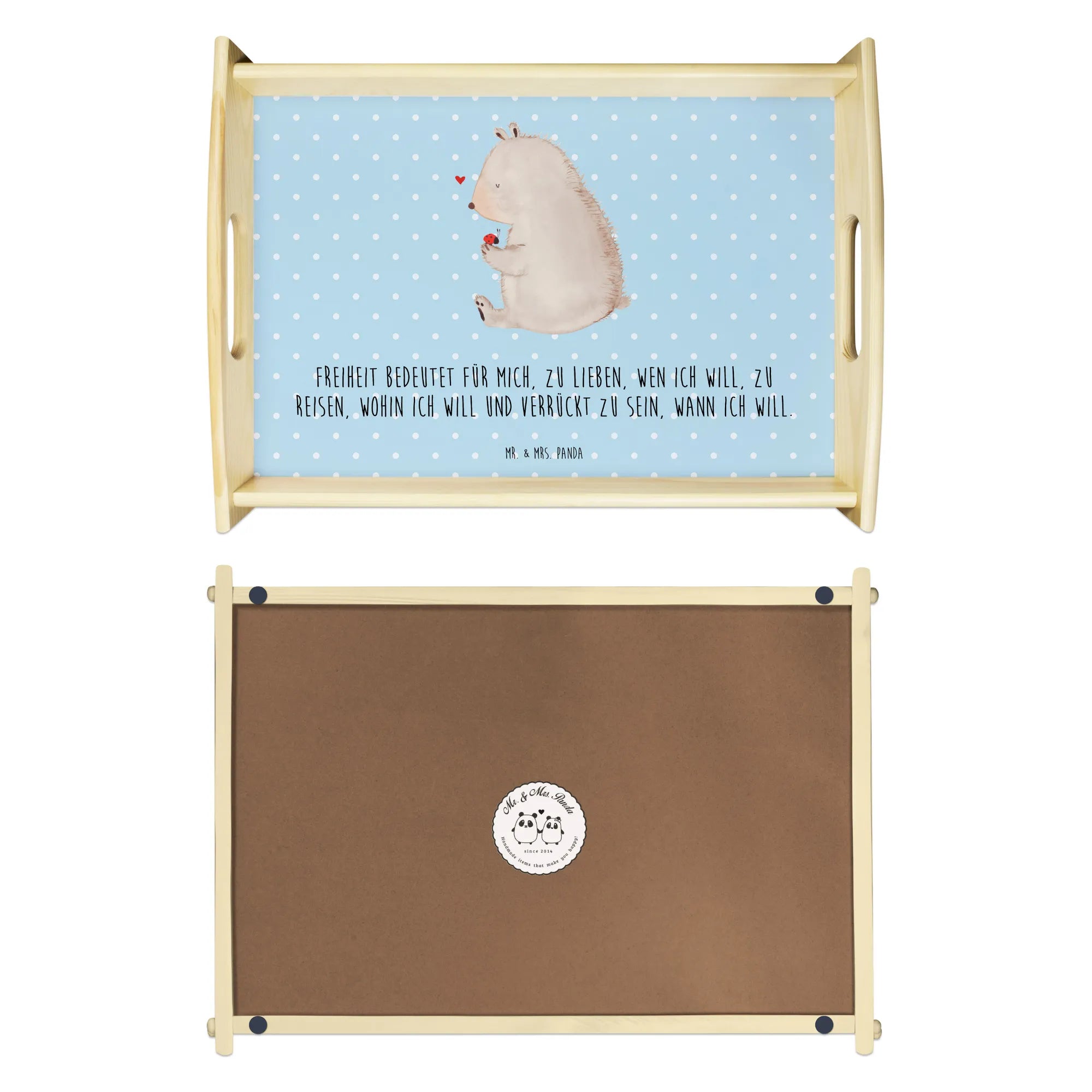 Verwöhne Deine Liebsten mit unserem bezaubernden Serviertablett von Mr. & Mrs. Panda! Mit den Maßen von 480 mm x 480 mm x 65 mm und einem gewicht von 925 g ist es nicht nur hübsch, sondern auch praktisch. Aus lasiertem Echtholz gefertigt, begeistert es mit einem lebendigen Druck, der gute Stimmung verbreitet. Egal ob beim Frühstück im Bett oder beim gemütlichen Abendessen auf dem Sofa – die seitlichen Griffmulden ermöglichen ein einfaches Tragen. Die Anti-Rutsch Pads auf der Unterseite sorgen dafür, dass alles sicher an seinem Platz bleibt. Dank der kratzfesten Oberfläche bleibt dein Tablett nach jeder Benutzung in bestem Zustand – einfach mit einem feuchten Tuch und Spülmittel abwischen, aber nicht einweichen! Beachte bitte die längere Anfertigungszeit aufgrund der besonderen Verarbeitung.