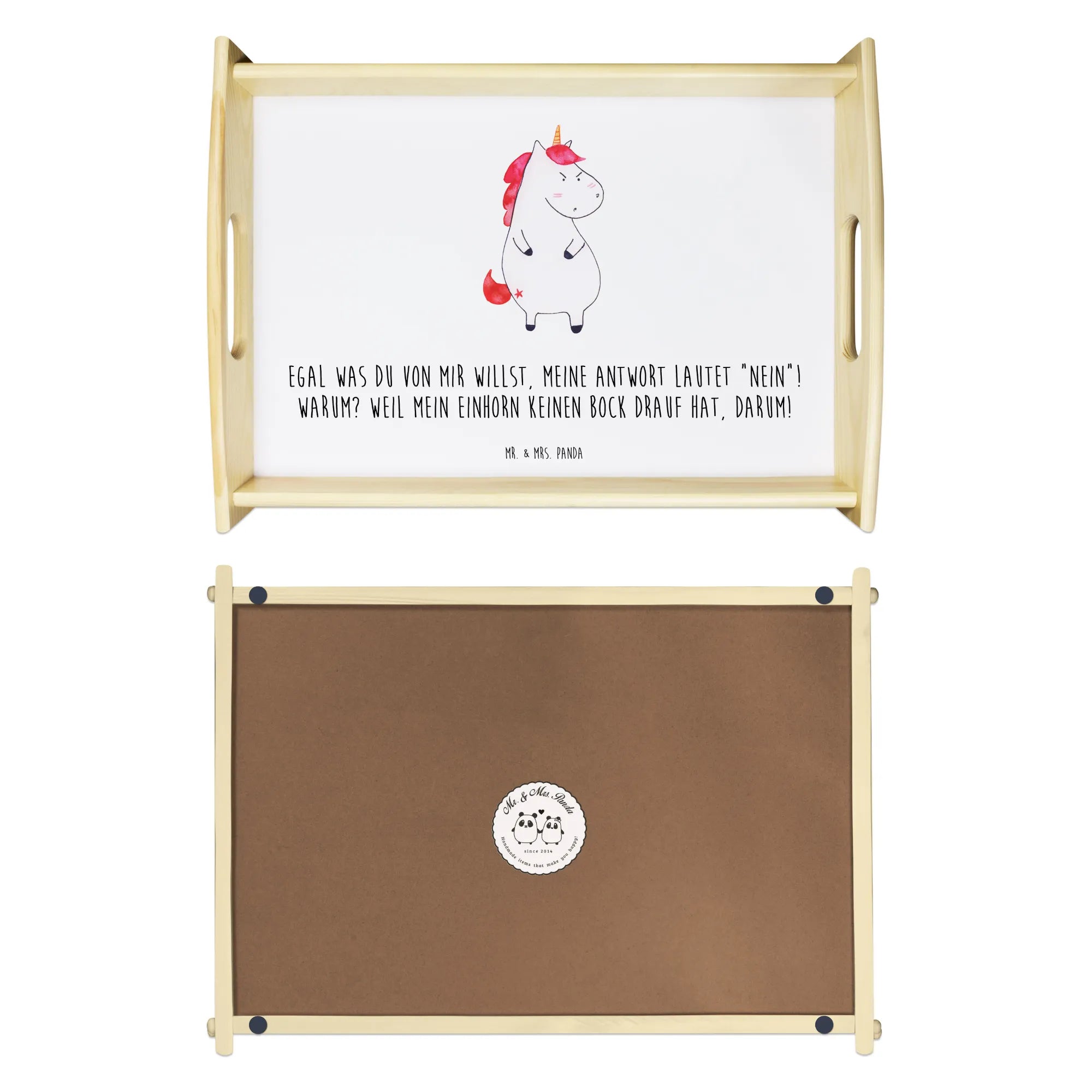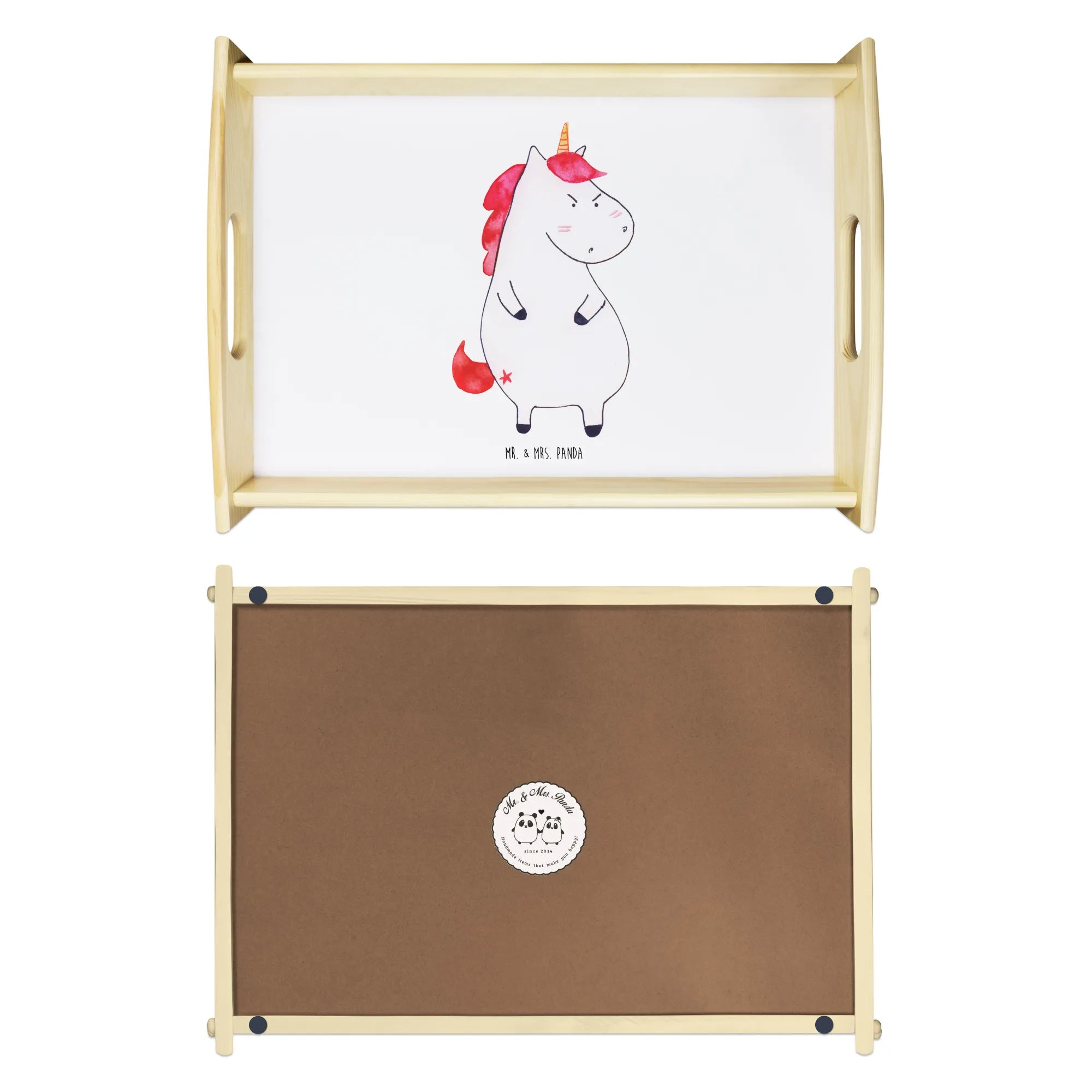 Das einzigartige Serviertablett von Mr. & Mrs. Panda wird dein Frühstücksbuffet zum Erlebnis machen! Mit seinen großzügigen Maßen von 480 mm x 480 mm x 65 mm und einem Gewicht von 925 g ist es die perfekte Kombination aus Funktionalität und Stil. Aus hochwertigem, lasiertem Echtholz gefertigt, verzückt das Tablett mit einem strahlenden Druck, der für gute Laune sorgt. Ob im Bett oder auf dem Sofa, die seitlichen Griffmulden garantieren ein angenehmes Handling. Die spezielle Anti-Rutsch Beschichtung sorgt dafür, dass alles sicher an seinem Platz bleibt. Dank der kratzfesten Oberfläche ist das Tablett sehr pflegeleicht – einfach mit einem feuchten Tuch und etwas Spülmittel abwischen. Bitte nicht einweichen! Denke daran, dass die Anfertigung wegen der hohen Qualität etwas Zeit in Anspruch nimmt.