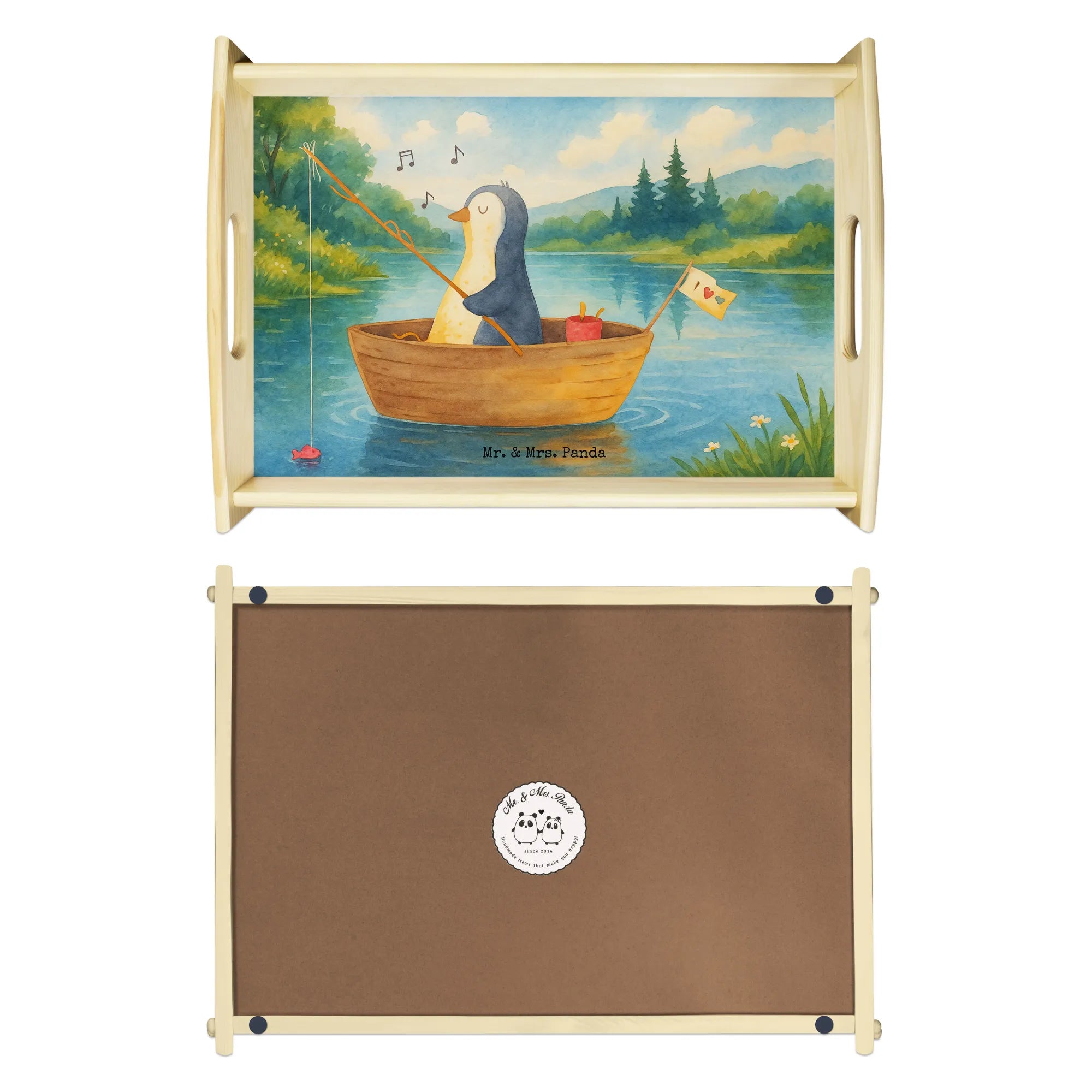Verwöhne Deine Liebsten mit unserem bezaubernden Serviertablett von Mr. & Mrs. Panda! Mit den Maßen von 480 mm x 480 mm x 65 mm und einem gewicht von 925 g ist es nicht nur hübsch, sondern auch praktisch. Aus lasiertem Echtholz gefertigt, begeistert es mit einem lebendigen Druck, der gute Stimmung verbreitet. Egal ob beim Frühstück im Bett oder beim gemütlichen Abendessen auf dem Sofa – die seitlichen Griffmulden ermöglichen ein einfaches Tragen. Die Anti-Rutsch Pads auf der Unterseite sorgen dafür, dass alles sicher an seinem Platz bleibt. Dank der kratzfesten Oberfläche bleibt dein Tablett nach jeder Benutzung in bestem Zustand – einfach mit einem feuchten Tuch und Spülmittel abwischen, aber nicht einweichen! Beachte bitte die längere Anfertigungszeit aufgrund der besonderen Verarbeitung.