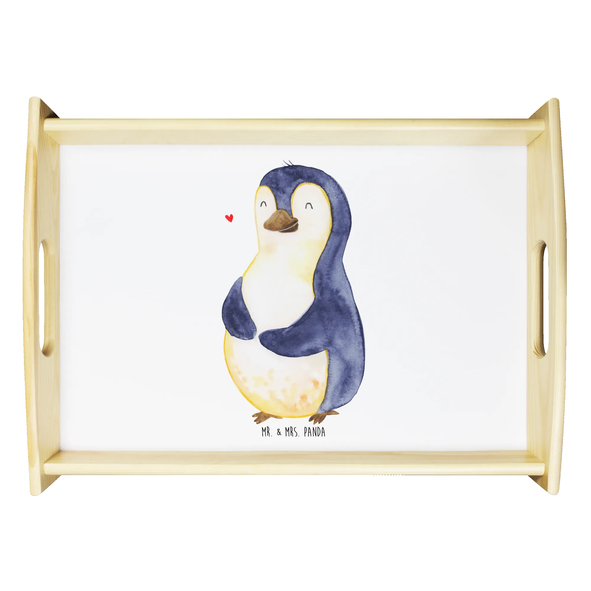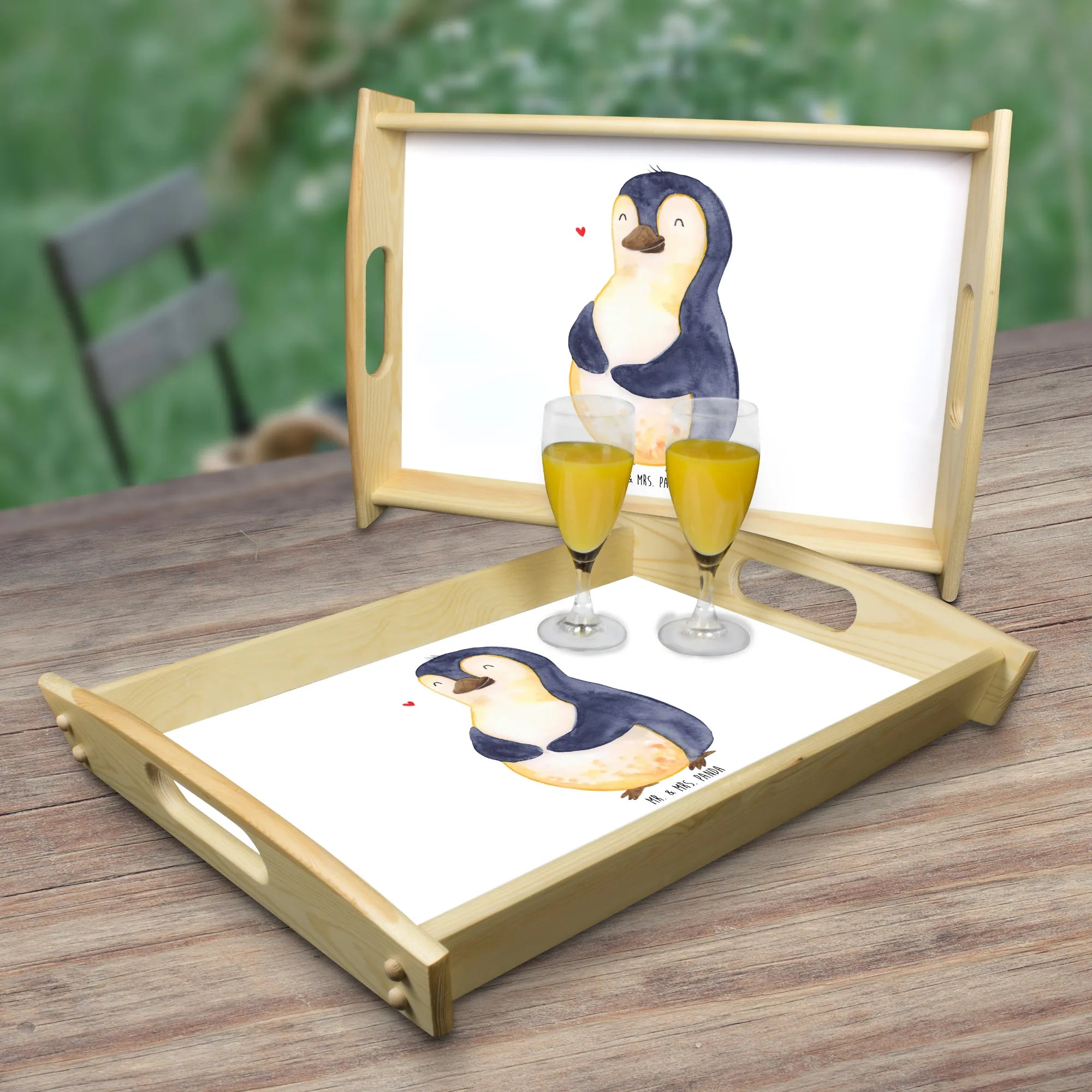 Das einzigartige Serviertablett von Mr. & Mrs. Panda wird dein Frühstücksbuffet zum Erlebnis machen! Mit seinen großzügigen Maßen von 480 mm x 480 mm x 65 mm und einem Gewicht von 925 g ist es die perfekte Kombination aus Funktionalität und Stil. Aus hochwertigem, lasiertem Echtholz gefertigt, verzückt das Tablett mit einem strahlenden Druck, der für gute Laune sorgt. Ob im Bett oder auf dem Sofa, die seitlichen Griffmulden garantieren ein angenehmes Handling. Die spezielle Anti-Rutsch Beschichtung sorgt dafür, dass alles sicher an seinem Platz bleibt. Dank der kratzfesten Oberfläche ist das Tablett sehr pflegeleicht – einfach mit einem feuchten Tuch und etwas Spülmittel abwischen. Bitte nicht einweichen! Denke daran, dass die Anfertigung wegen der hohen Qualität etwas Zeit in Anspruch nimmt.