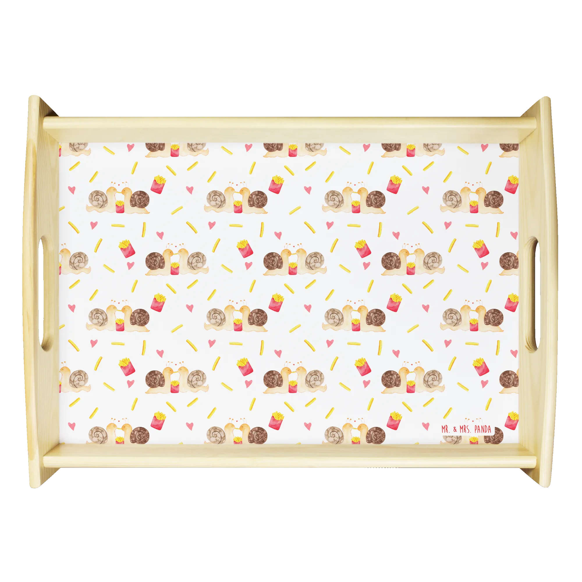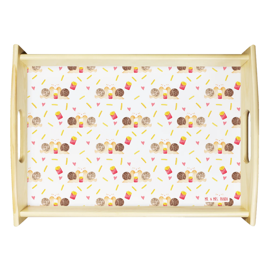 Verwöhne Deine Liebsten mit unserem bezaubernden Serviertablett von Mr. & Mrs. Panda! Mit den Maßen von 480 mm x 480 mm x 65 mm und einem gewicht von 925 g ist es nicht nur hübsch, sondern auch praktisch. Aus lasiertem Echtholz gefertigt, begeistert es mit einem lebendigen Druck, der gute Stimmung verbreitet. Egal ob beim Frühstück im Bett oder beim gemütlichen Abendessen auf dem Sofa – die seitlichen Griffmulden ermöglichen ein einfaches Tragen. Die Anti-Rutsch Pads auf der Unterseite sorgen dafür, dass alles sicher an seinem Platz bleibt. Dank der kratzfesten Oberfläche bleibt dein Tablett nach jeder Benutzung in bestem Zustand – einfach mit einem feuchten Tuch und Spülmittel abwischen, aber nicht einweichen! Beachte bitte die längere Anfertigungszeit aufgrund der besonderen Verarbeitung.