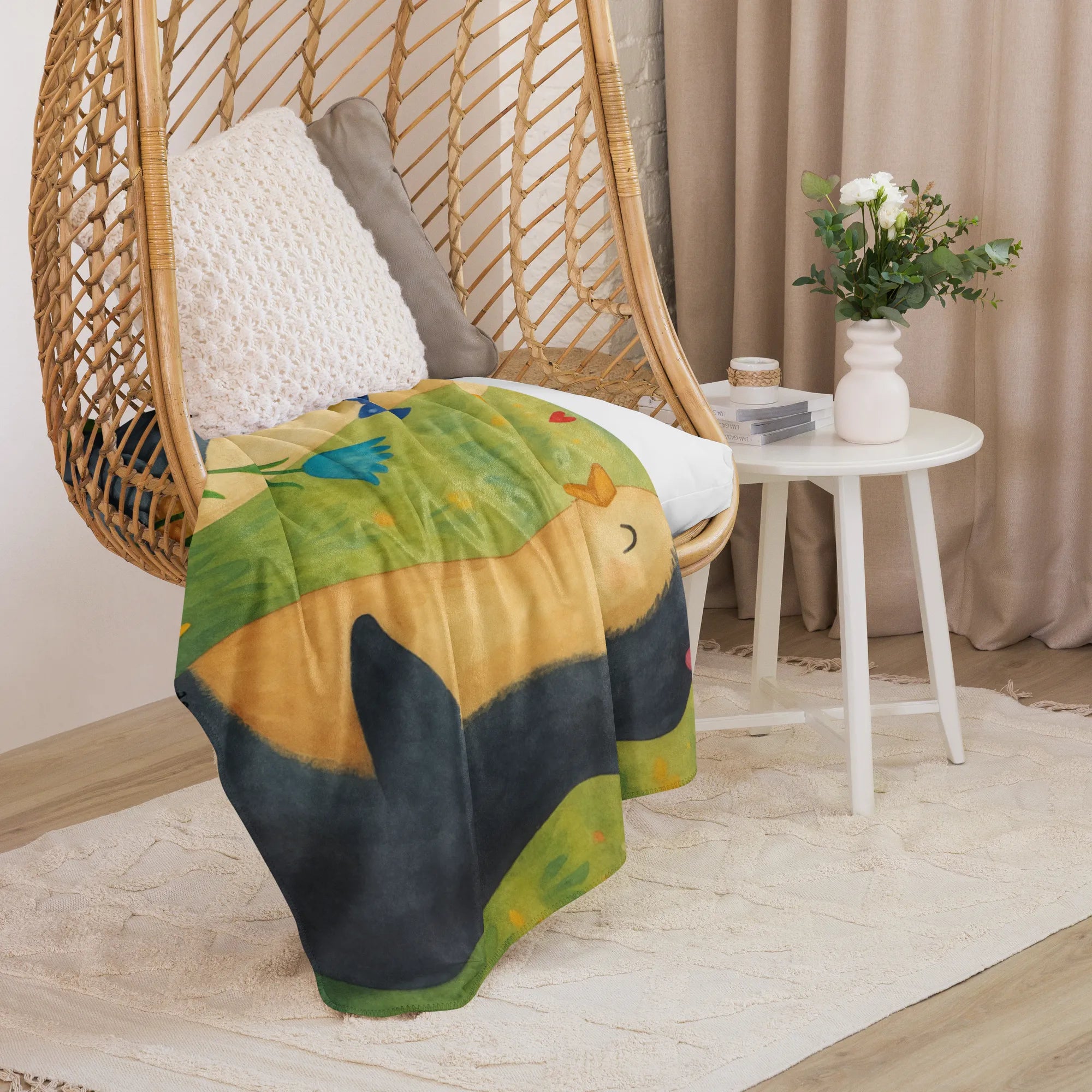 Hol dir das Beste der Kuschelmomente nach Hause mit der Sherpa Kuscheldecke von Mr. & Mrs. Panda! Diese Decke misst 1300 mm x 1550 mm und besteht aus 100 % ultreweichen Polyesterfasern, die dich an kalten Tagen warmhalten. Der Glattstoff hat eine Dichte von 220g/m², während das angenehme Sherpa-Gewebe mit 240g/m² für zusätzlichen Komfort sorgt. Bedruckt mit fröhlichen Sprüchen und niedlichen Motiven, ist diese Decke nicht nur praktisch, sondern auch ein echter Eyecatcher für jeden Raum. Perfekt zum Relaxen auf der Couch oder als hübscher Überwurf im Wohnzimmer. Vergiss nicht, sie vor der ersten Nutzung zu waschen und achte auf die Pflegehinweise: Verwende schonende Reinigungsmittel für die Langlebigkeit der Farben. Gönn dir und deinem Zuhause diese kuschelige Umarmung!