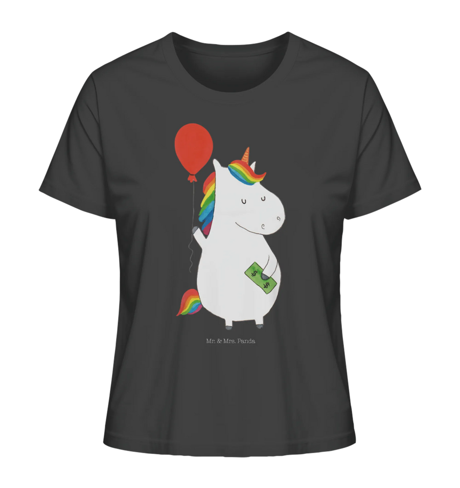 Zauberhaft, fröhlich und handgemacht: Unser Shirt Damen „Einhorn Luftballon“ aus der Einhorn - Kollektion von Mr. & Mrs. Panda ist das perfekte Geschenk für alle Einhorn-Liebhaberinnen. Das süße, handgezeichnete Einhorn hält einen bunten Luftballon und ein paar Geldscheine — ein Motiv, das Lebenslust und Freude ausstrahlt. Gedruckt in unserer Manufaktur in Hannover, kommt das Design besonders leuchtend auf dem schwarzen Hintergrund zur Geltung.