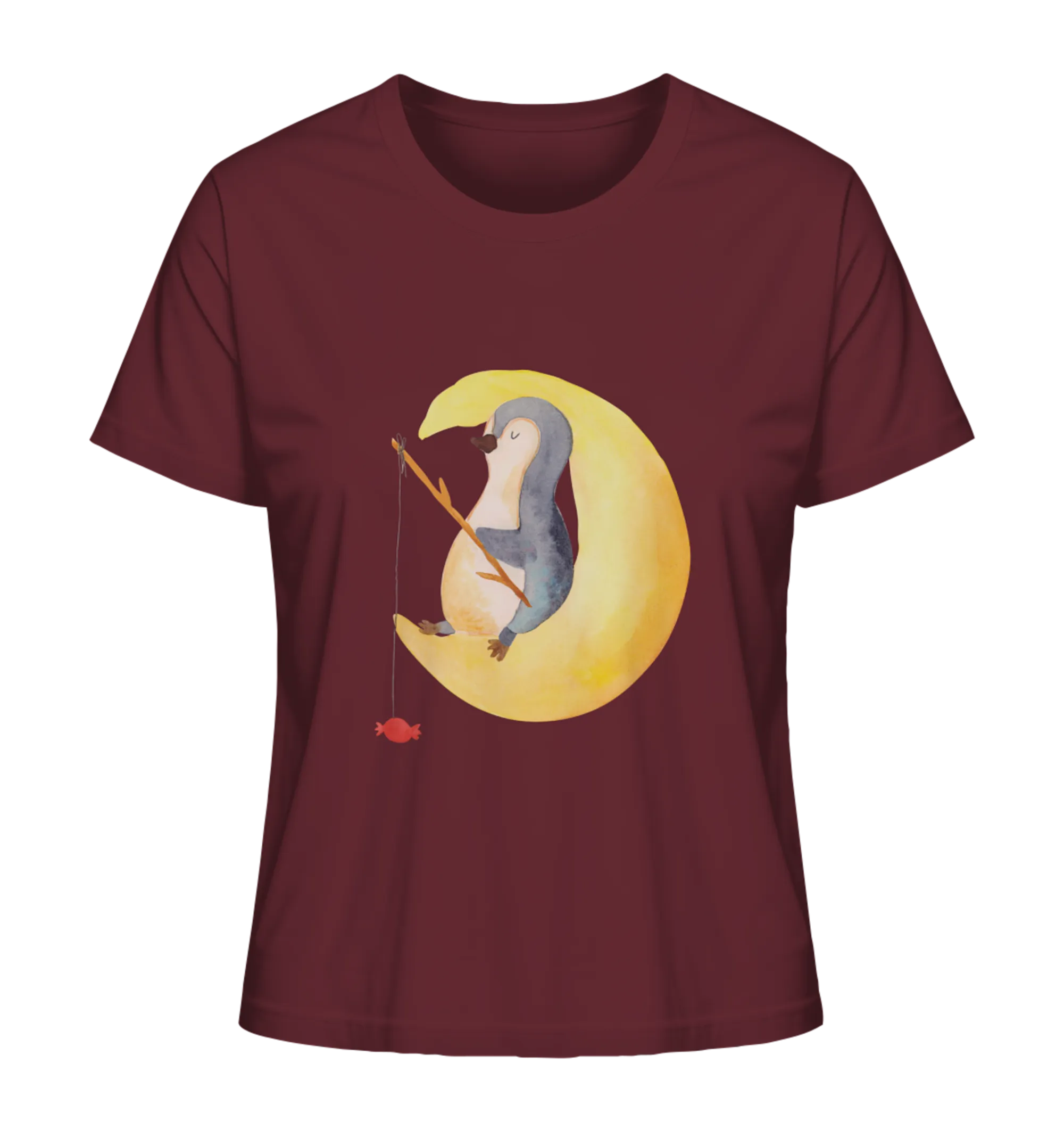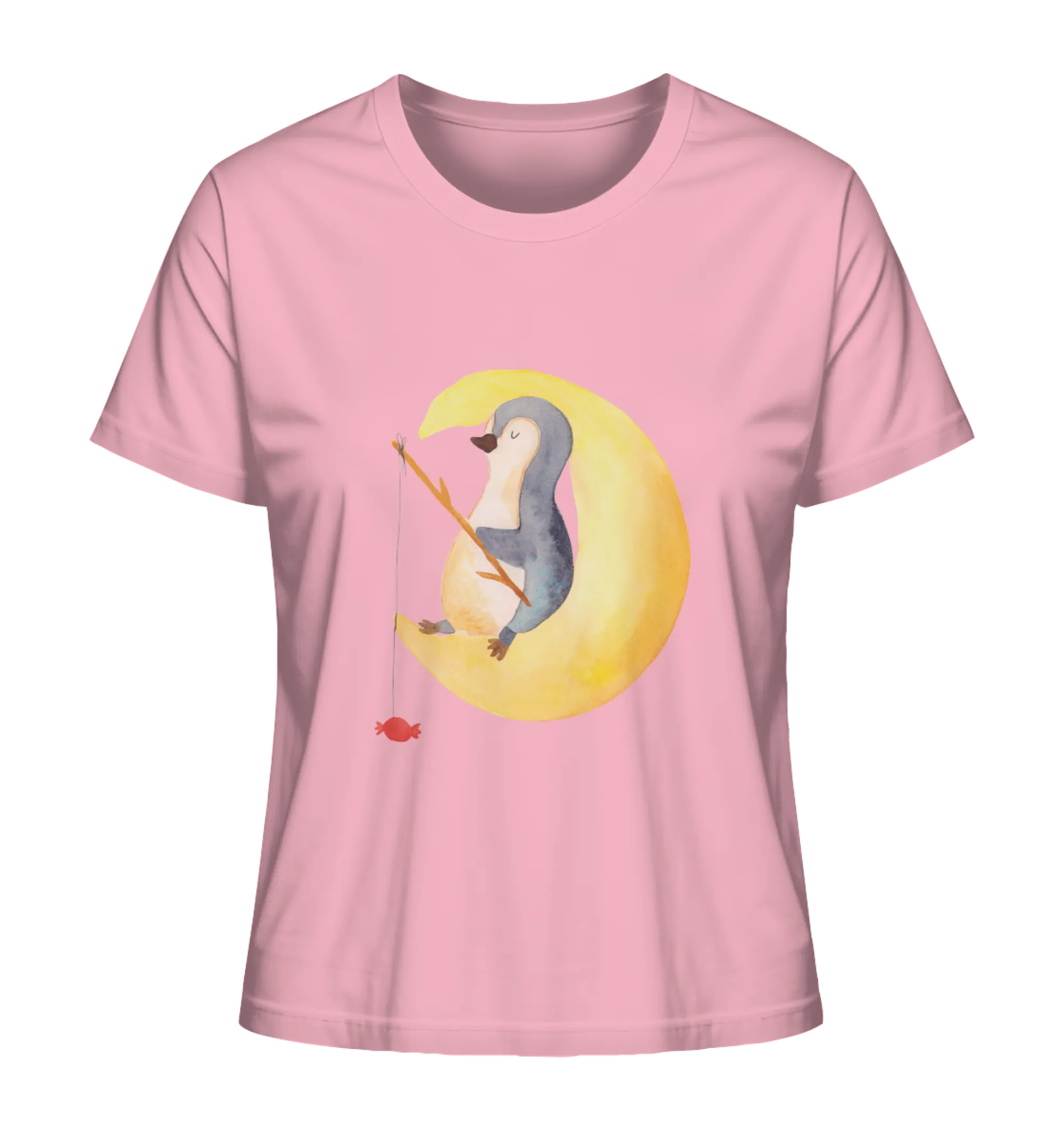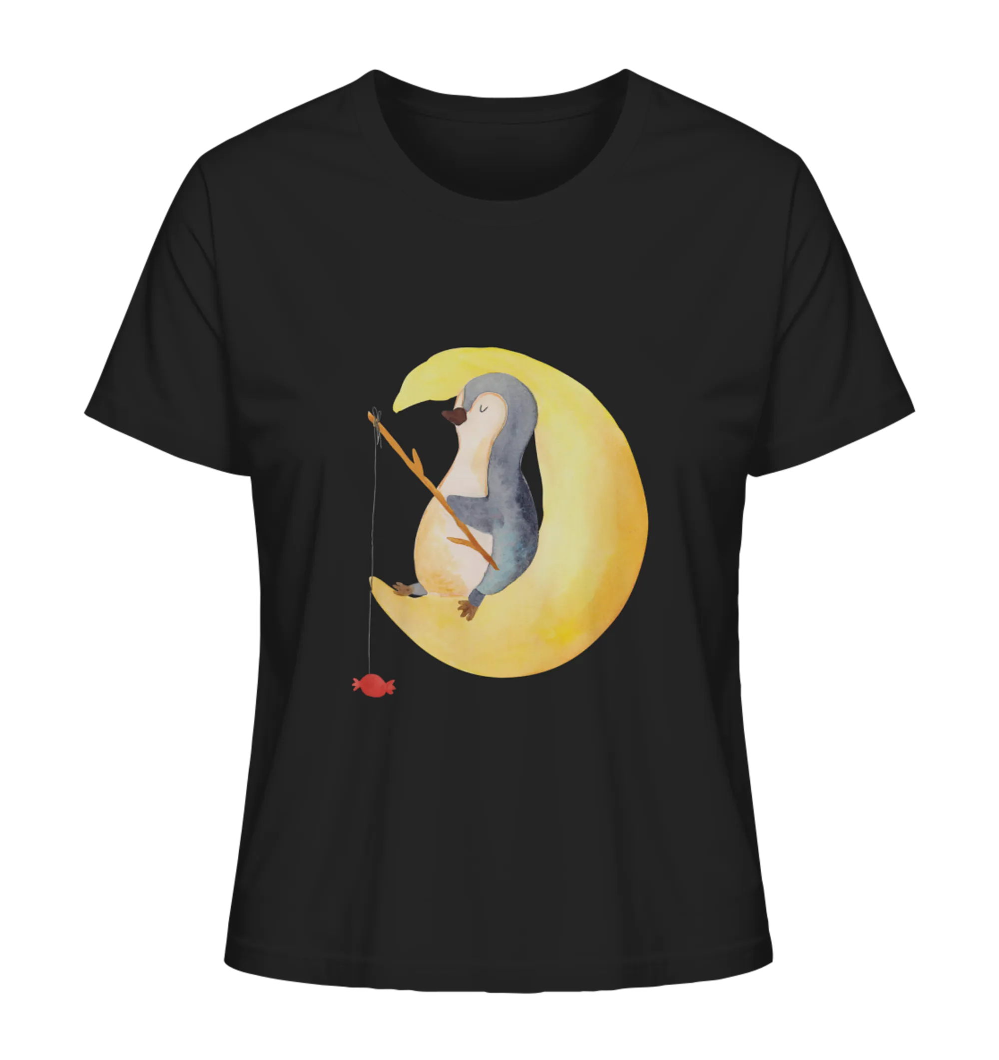 Unser bezauberndes Damenshirt zeigt einen süßen Pinguin, der es sich auf einer Mondsichel gemütlich gemacht hat und mit einer Angel nach Sternen angelt. An der Angel hängt ein kleines Bonbon – ein liebevolles, handgezeichnetes Motiv, das jedem Outfit eine zarte, fröhliche Note verleiht. 🌙🐧