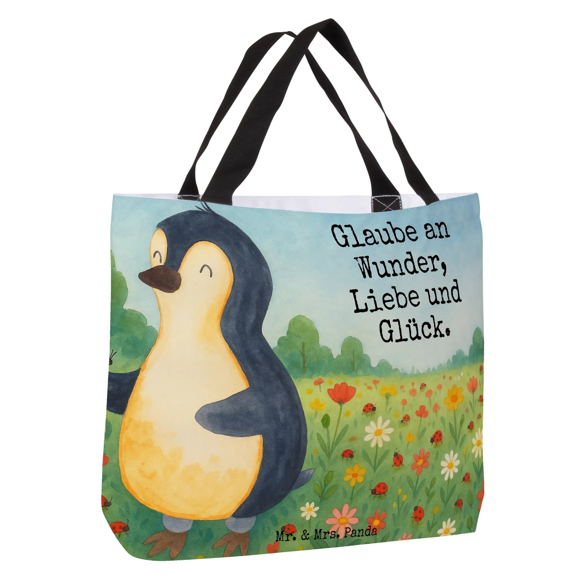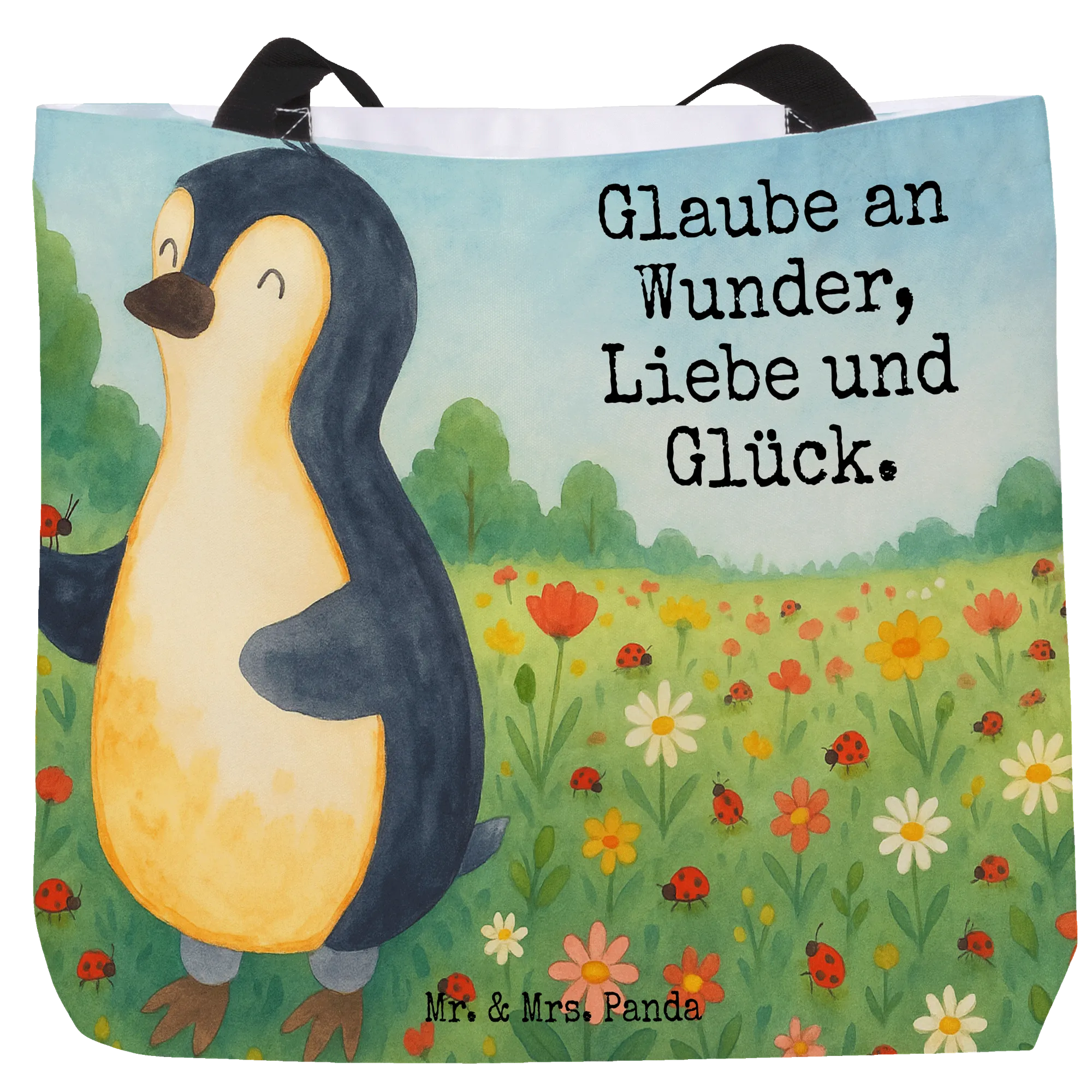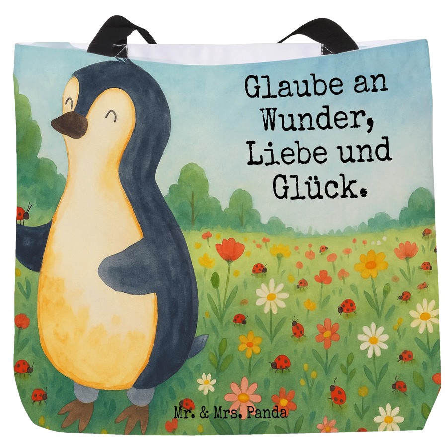 Vorstellen, wie ein kleiner Pinguin, gefüllt mit kindlicher Neugier und einem riesigen Herz, einen winzigen Marienkäfer behutsam auf seiner Flosse wiegt. Dieses entzückende Motiv von Mr. & Mrs. Panda symbolisiert die unendliche Kapazität unseres Herzens, Liebe zu geben und Wunder im Alltag zu finden. Der Spruch 'Glaube an Wunder, Liebe und Glück' ermutigt uns, den Zauber in alltäglichen Begegnungen zu erkennen und unsere Lebensfreude zu steigern. Es ist eine Ode an die Freude, das Glück und die Liebe, die uns umgeben, selbst in den einfachsten Dingen wie der Beziehung zwischen einem Pinguin und einem Marienkäfer.