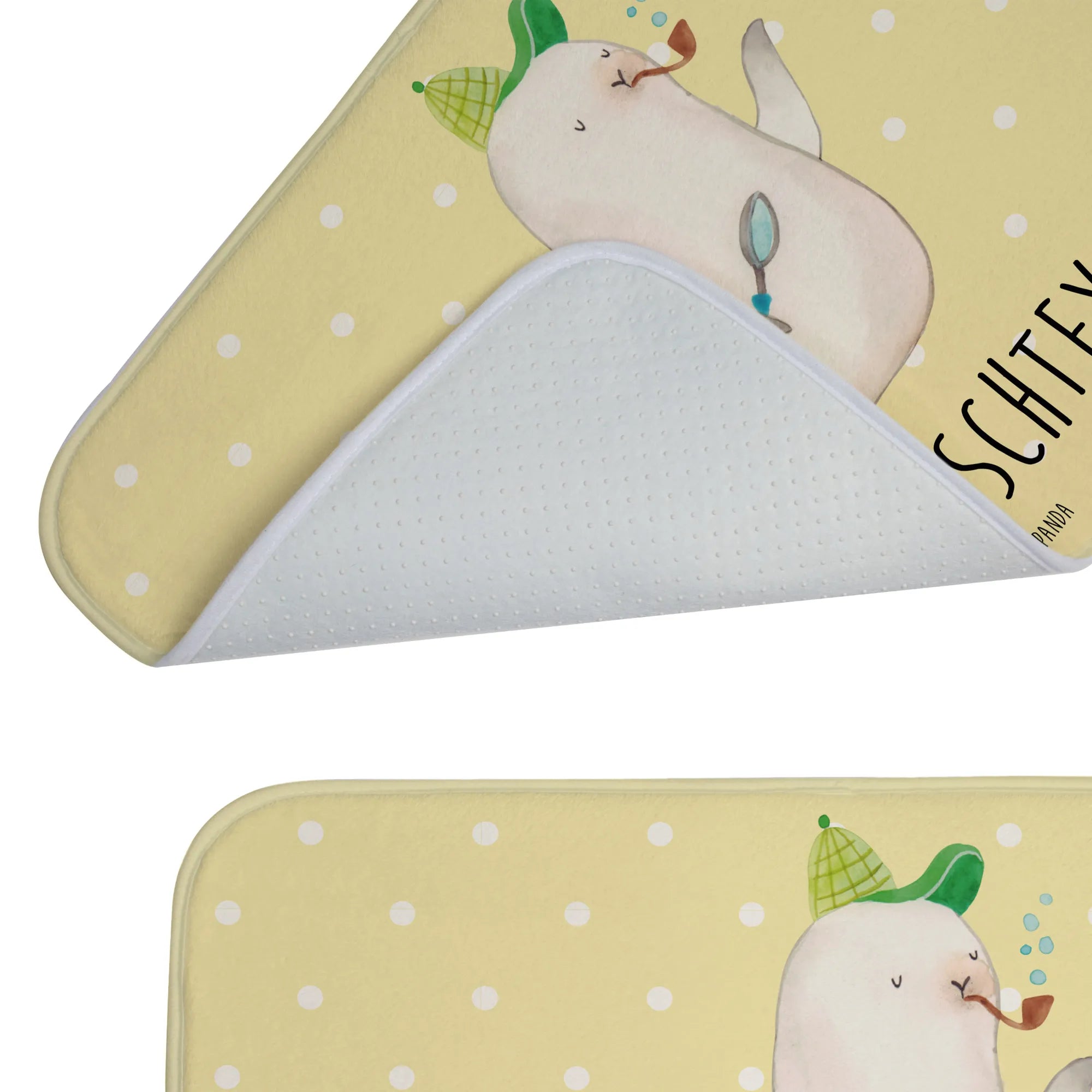Hol dir mit unserem personalisierten Badvorleger von Mr. & Mrs. Panda ein Stück Persönlichkeit in dein Badezimmer! Er hat die perfekten Maße von 590 mm x 400 mm und wird mit zauberhaften Motiven und deinem gewünschten Text bedruckt. Der Badteppich aus flauschiger Premium Kunstfaser gibt deinem Badezimmer nicht nur eine tolle Optik, sondern sorgt durch die rutschfeste Gummibeschichtung auch für Sicherheit. Ideal für den Einsatz nach einem entspannenden Bad oder einer erfrischenden Dusche. Unsere liebevolle Gestaltung macht den Badvorleger zu einem ganz besonderen Geschenk, das für Freude sorgt. Zudem ist er besonders saugstark und pflegeleicht: Einfach bei 30°C in der Waschmaschine waschen und schon erstrahlt er wieder in neuem Glanz!