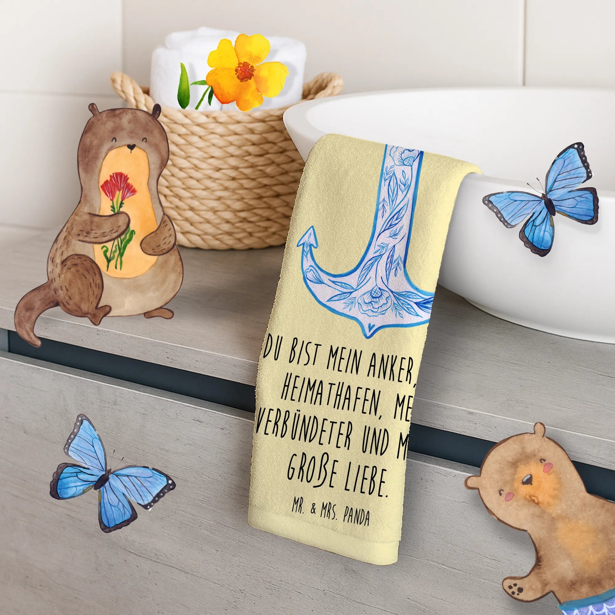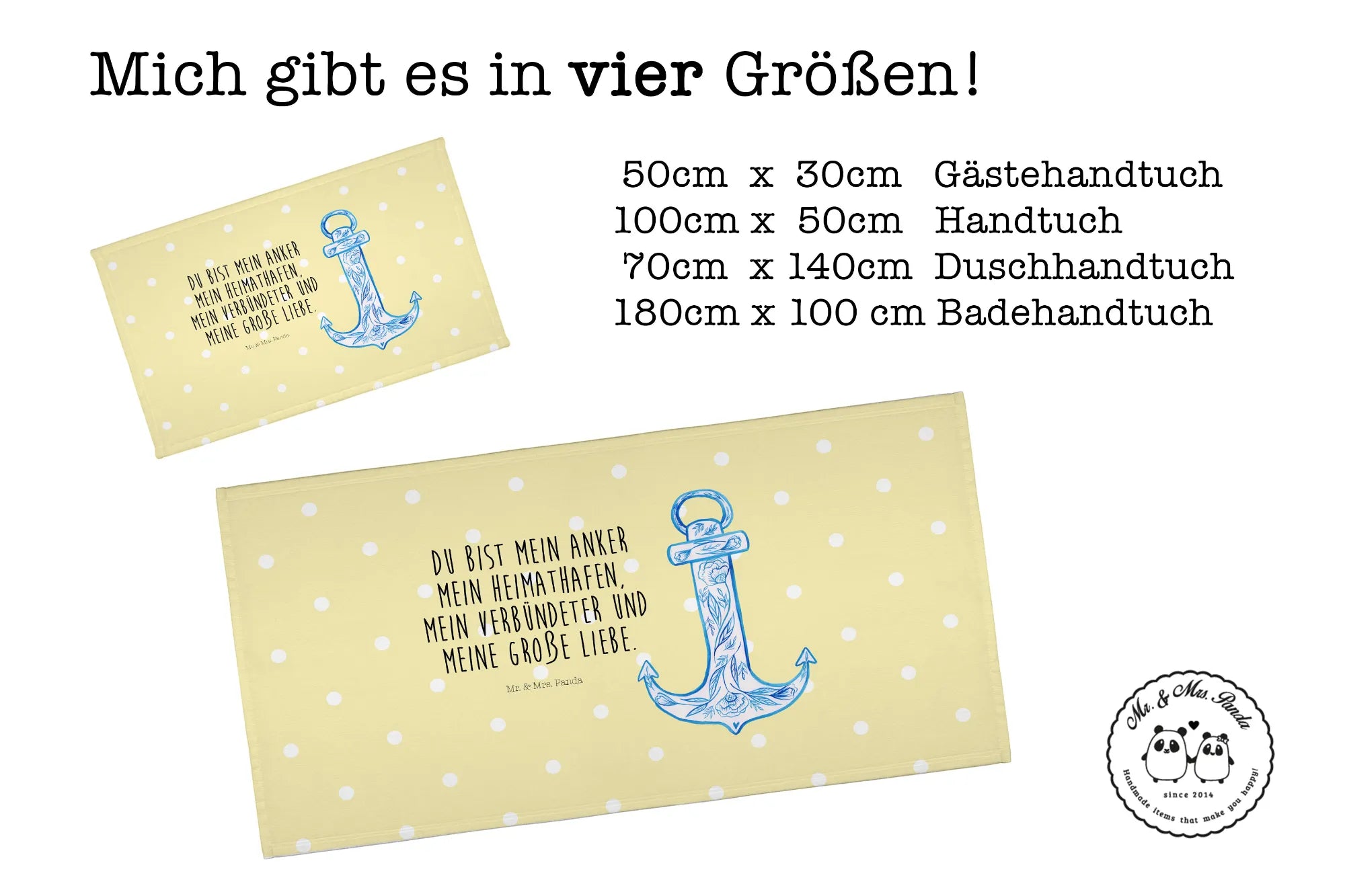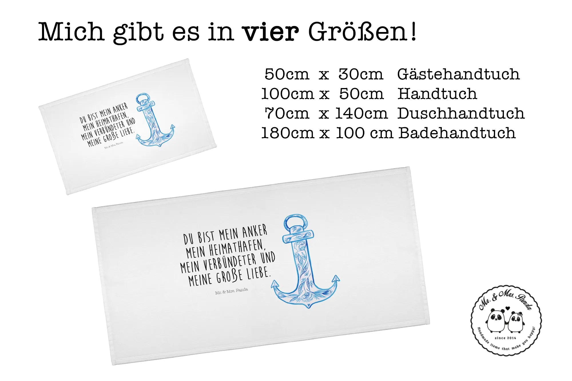Das liebevoll gestaltete Gästehandtuch Anker Blau von Mr. & Mrs. Panda bringt nicht nur Farbe, sondern auch eine Portion Lebensfreude in jedes Badezimmer! Mit seinem maritimen Motiv und dem inspirierenden Slogan "Du bist mein Anker, mein Heimathafen, mein Verbündeter und meine große Liebe" verwandelt dieses Handtuch dein Gäste- oder Badezimmer in eine Wohlfühloase.