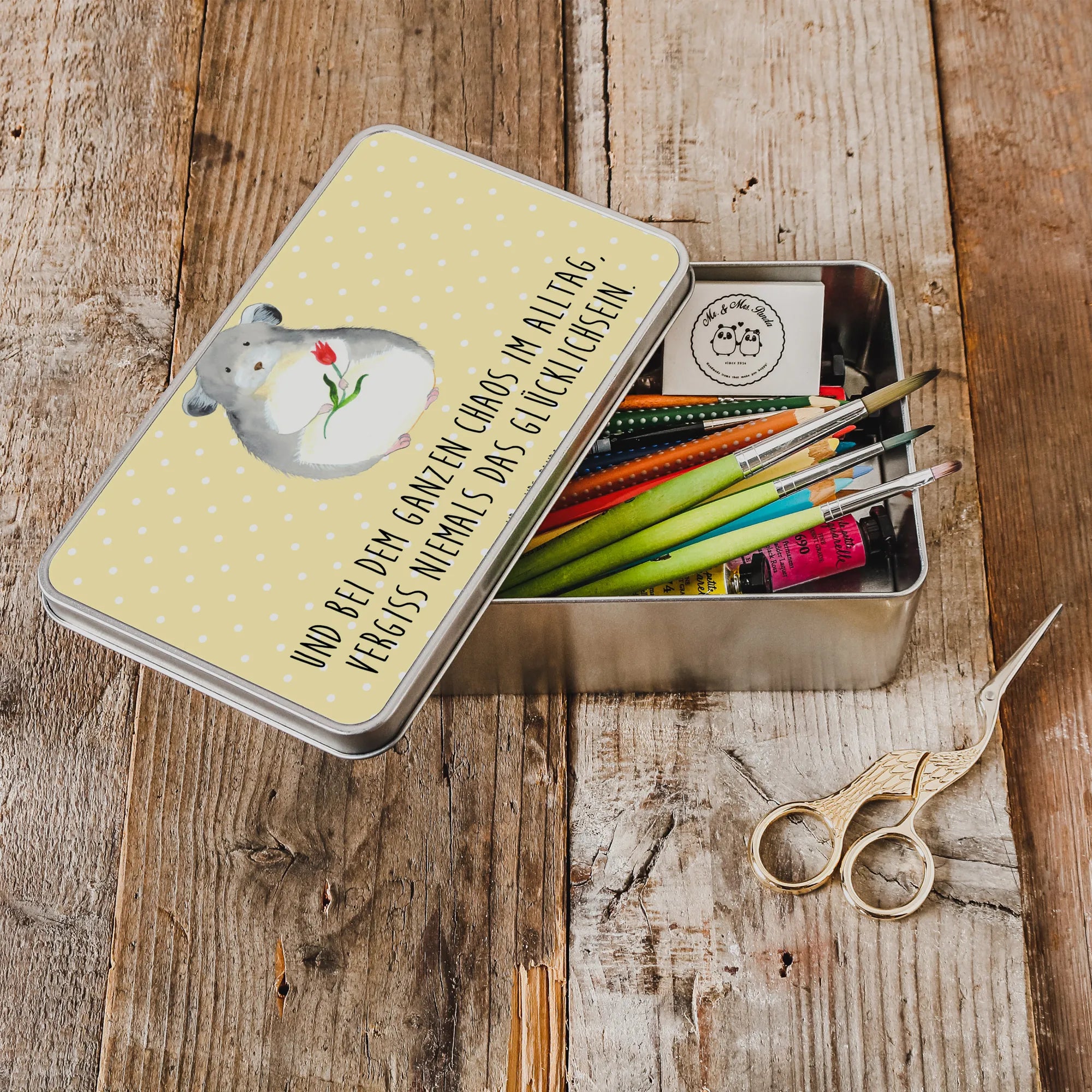 Die wunderschöne Metalldose rechteckig mit dem niedlichen Chinchilla-Motiv von Mr. & Mrs. Panda ist das perfekte Geschenk für jeden, der Freude und gute Laune in seinen Alltag bringen möchte. Diese edle Dose strahlt nicht nur mit ihrem besonderen Glanz, sondern trägt auch die liebevolle Botschaft: "Und bei dem ganzen Chaos im Alltag, vergiss niemals das Glücklichsein."