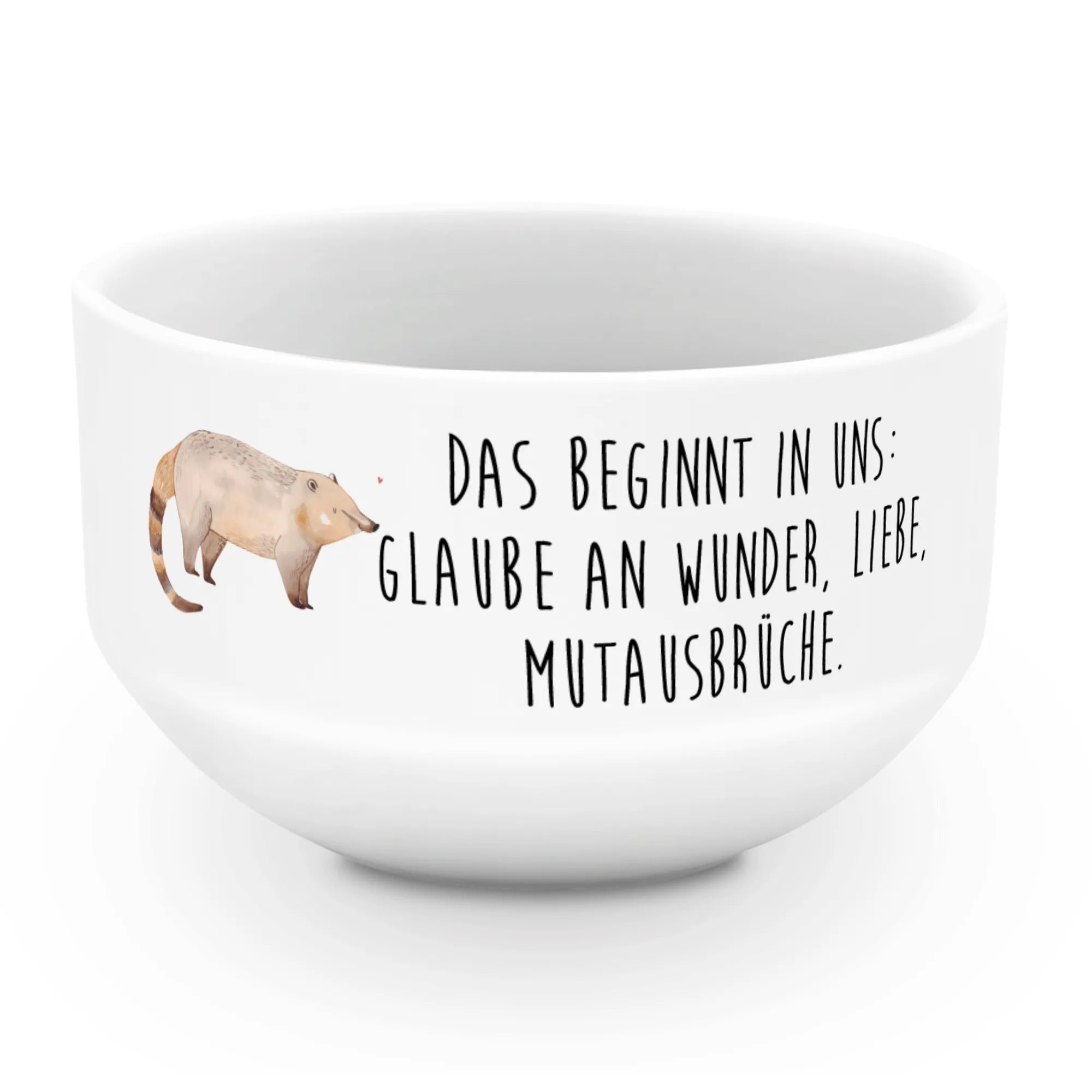 Das fröhliche Tiermotiv und der unterhaltsame Spruch "Das beginnt in uns: Glaube an Wunder, Liebe, Mutausbrüche" werden sicher jeden begeistern, der sie sieht. Ob du also ein Geschenk für einen Freund, ein Familienmitglied oder einfach nur eine kleine Aufmerksamkeit für dich selbst suchst, die Müslischale mit dem Nasenbär ist die Antwort!