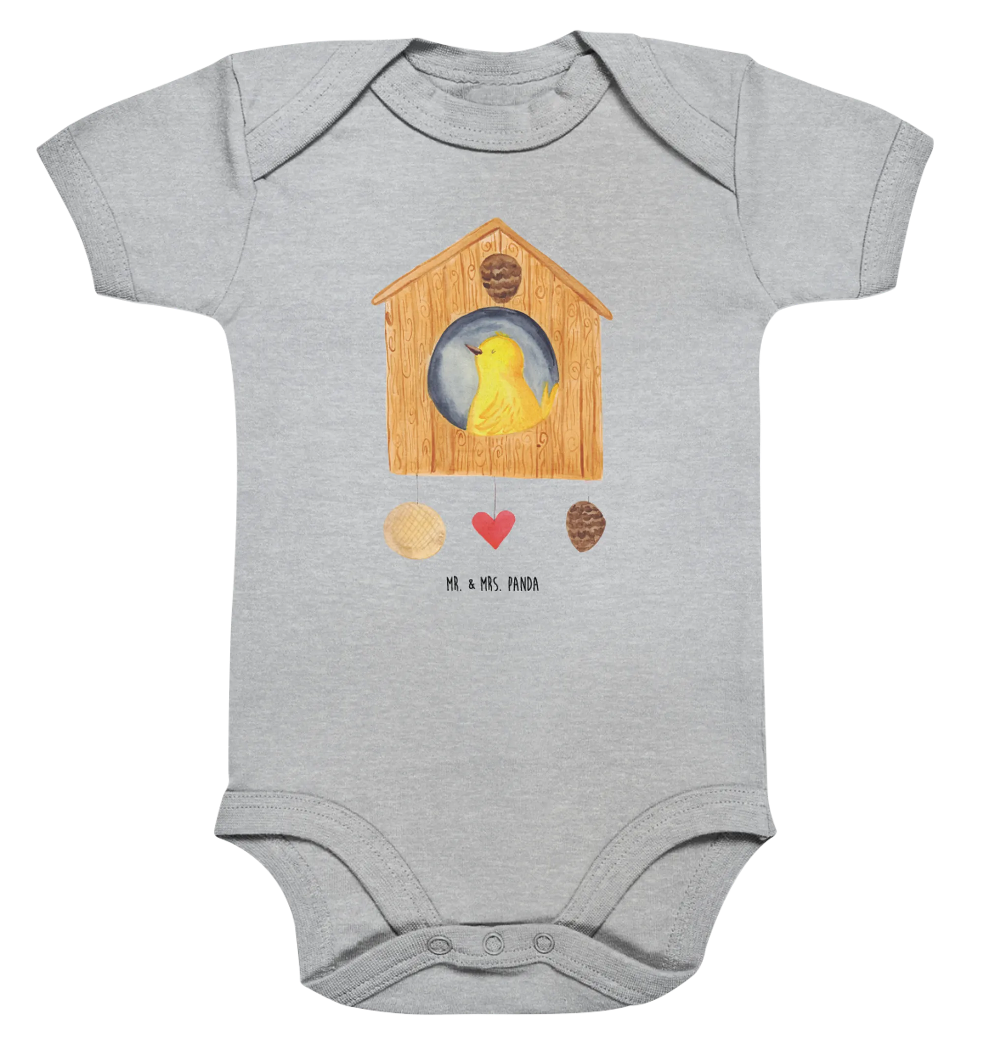 Mit dem schönen Vogelhaus-Motiv ist der Baby Body ein echter Hingucker und sorgt gleichzeitig für gute Laune. Jeder Babystrampler wird mit viel Liebe von Mr. & Mrs. Panda entworfen und in liebevoller Handarbeit gefertigt.