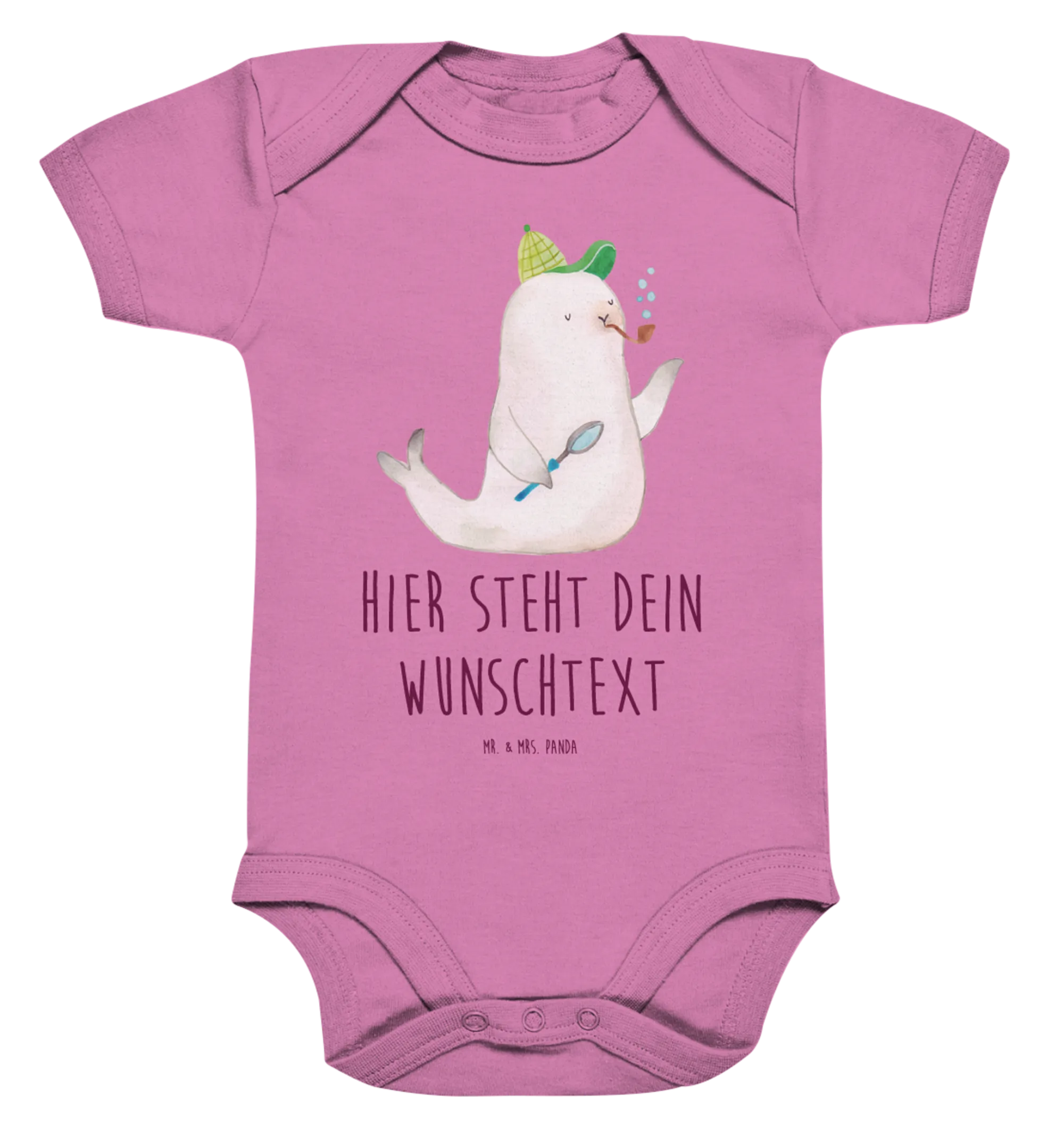 Die Robbe Sherlock ist auf heißer Spur und braucht Deine Hilfe! Ob als persönliches Geschenk zur Geburt, zur Babyparty oder einfach mal so – dieser Body begeistert nicht nur die Kleinen, sondern auch die frischgebackenen Eltern. Egal ob Junge oder Mädchen, dieser personalisierte Wickelbody ist ein tolles und praktisches Kleidungsstück für die Erstausstattung. Hergestellt aus 100% hochwertiger Öko-Baumwolle ist er besonders sanft zur zarten Babyhaut und bietet höchsten Tragekomfort.