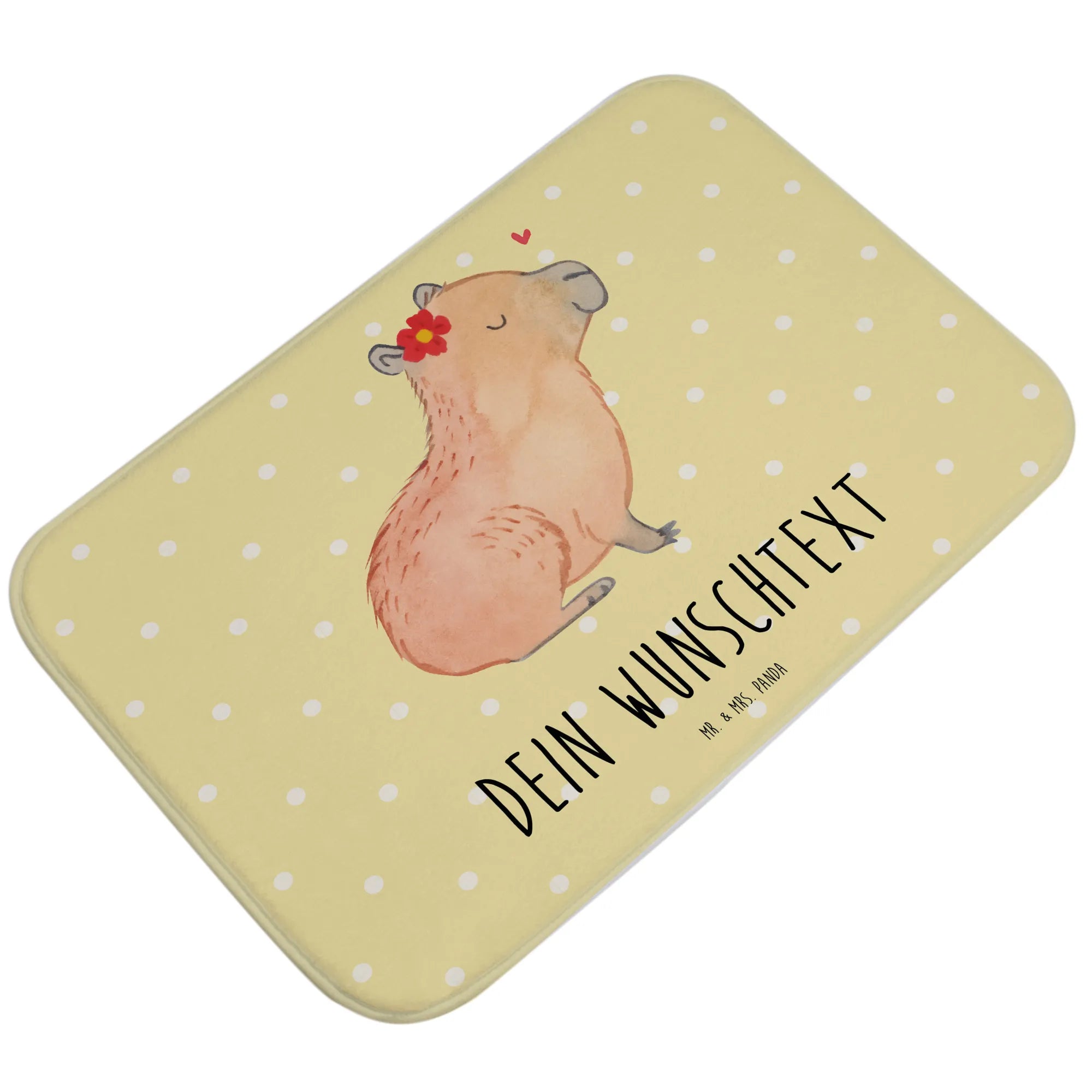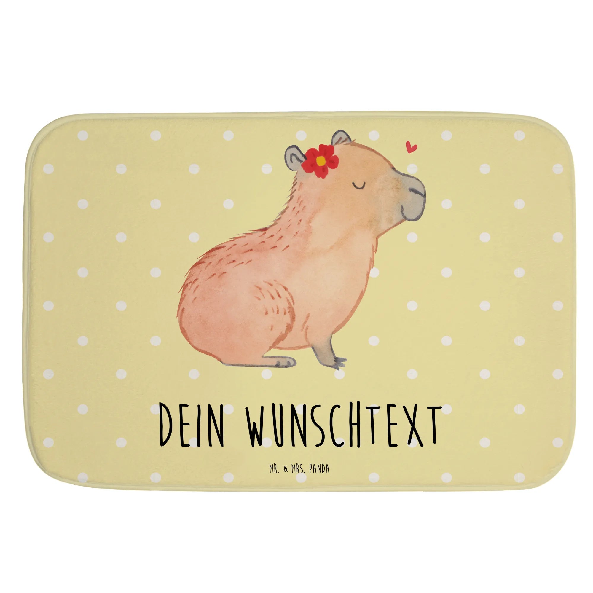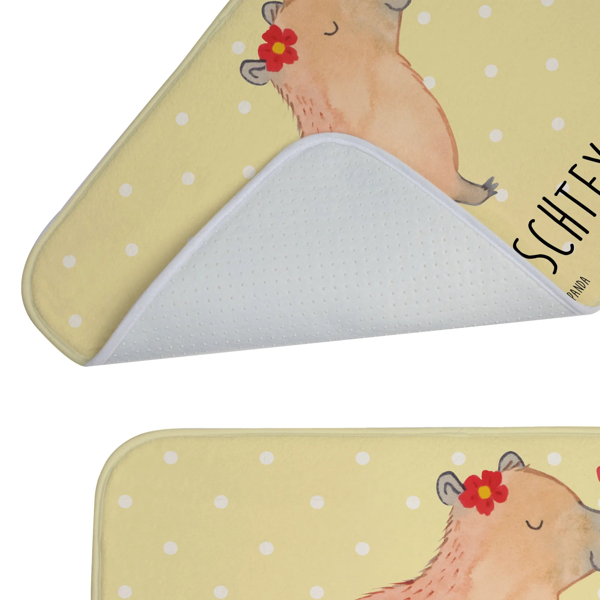 Du suchst nach einem perfekten Geschenk, das sowohl deinen persönlichen Stil unterstreicht als auch für gute Laune sorgt? Dann ist unser wunderschöner personalisierter Badvorleger mit dem niedlichen Capybara Blume Motiv aus der Small World Kollektion genau das Richtige für dich!