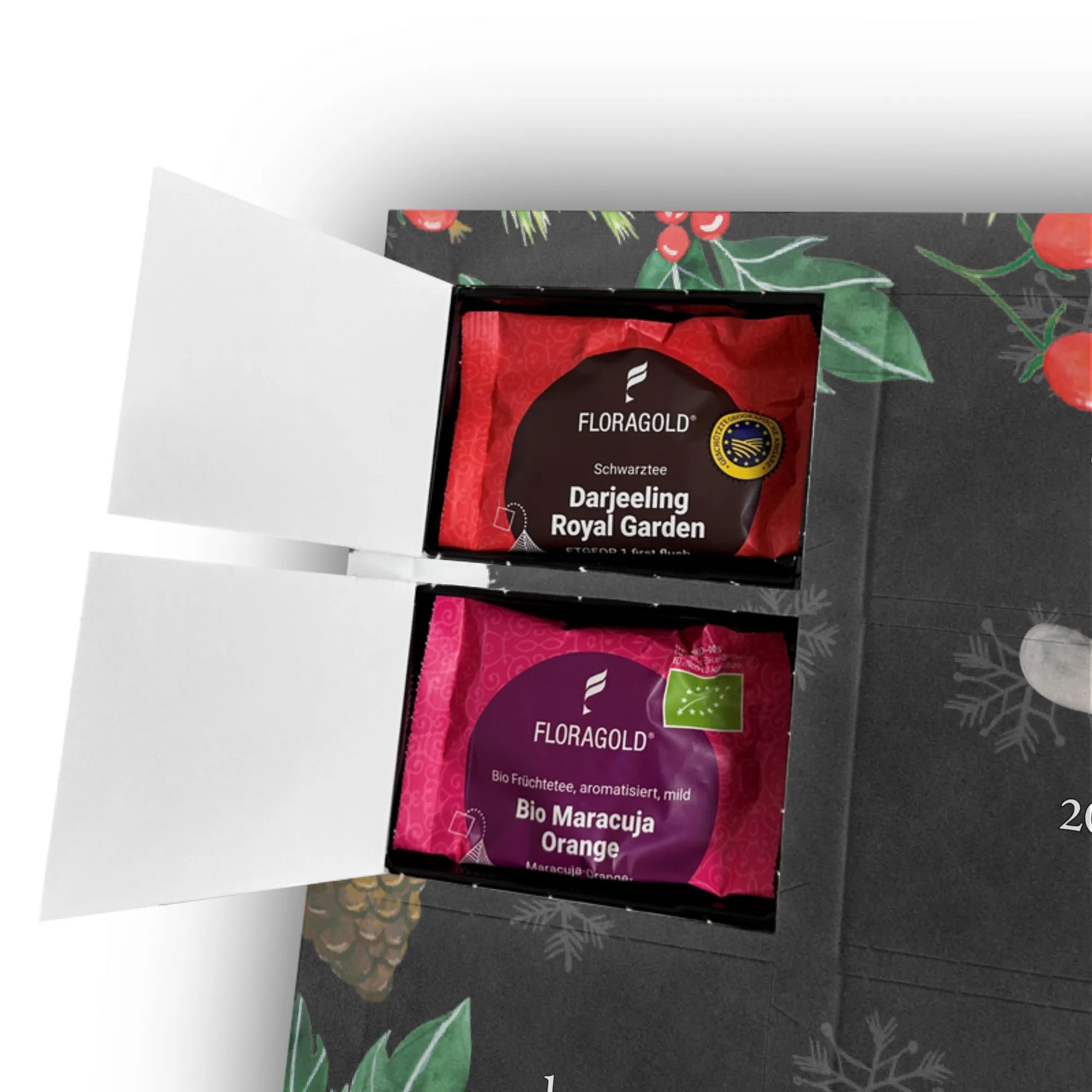 Der Kalender besteht aus hochwertigem, 300 Gramm schwerem Karton, der mit einem brillanten, matt glänzenden Druck versehen ist. Mit 24 einzeln verpackten Teesorten – darunter Früchtetees, Schwarztees und Kräutertees – ist jede Tür eine kleine Überraschung. Du kannst ihn personalisieren, was ihn zu einem ganz besonderen und einzigartigen Geschenk für Freunde oder den Partner macht.