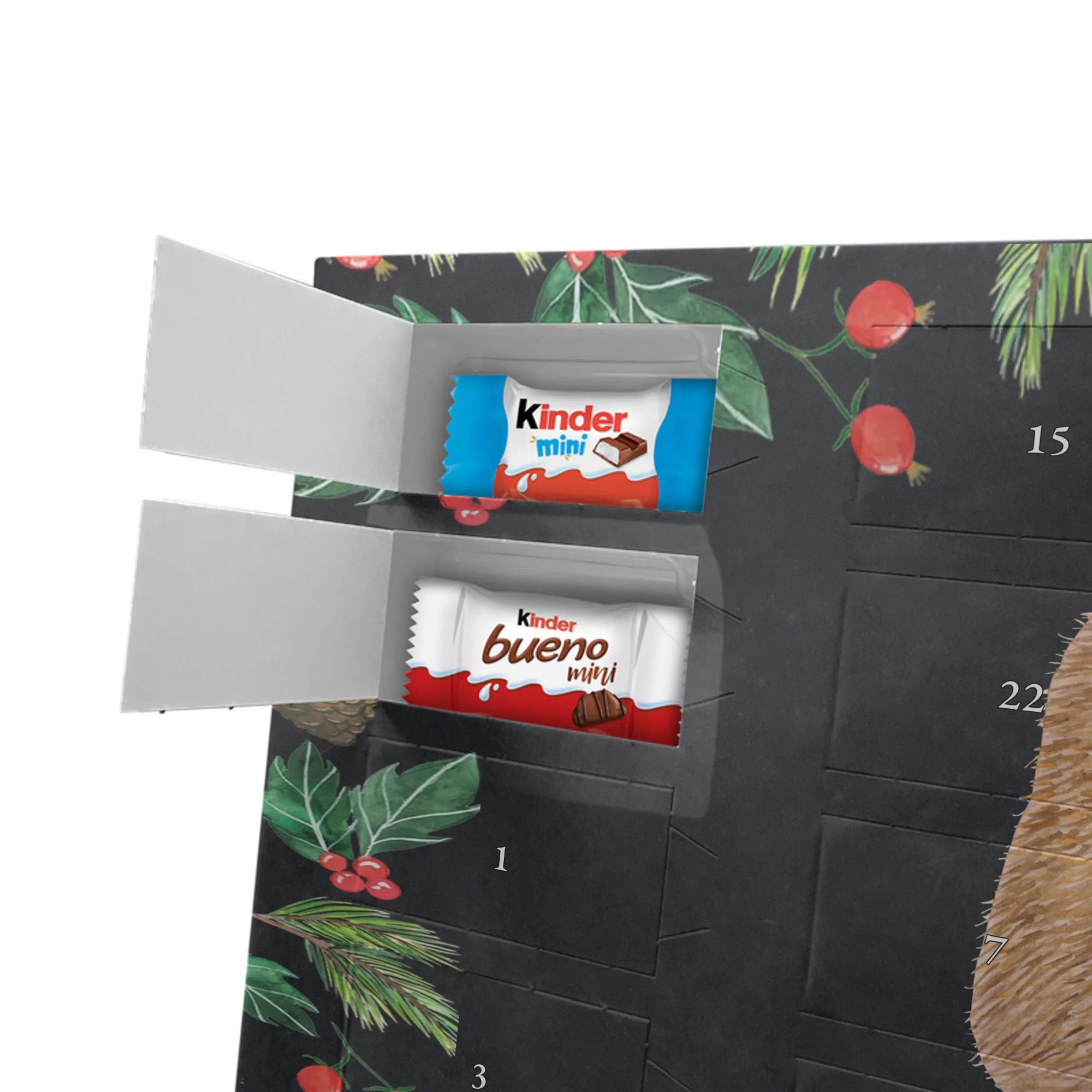 Wunderschöner Schoko Adventskalender von Mr. & Mrs. Panda – perfekt, wenn du die Vorweihnachtszeit mit einem liebevoll gestalteten Kalender versüßen möchtest. Unser Kalender ist bedruckt mit wunderschönen Motiven & Sprüchen von Mr. & Mrs. Panda und eignet sich hervorragend als Geschenk für Freunde, Familie oder einfach für dich selbst. Er ist nicht personalisierbar, dafür aber mit viel Liebe zum Detail gestaltet. Die brillante Druckqualität mit seidenmatter Oberflächenveredelung sorgt für edles Aussehen, und die bedruckten Seitenflächen geben dem Kalender einen wertigen Gesamteindruck. Maße: 355 mm x 245 mm x 11 mm. Besonderheit: kann aufgehängt oder aufgestellt werden – so findest du immer den perfekten Platz bei dir zuhause. Gefüllt mit Markenname Schokolade: Adventskalender gefüllt mit kinder® Schokolade. Inhalt: kinder® Schoko-Bons, kinder® Bueno mini und kinder® Schokolade mini. Der Kalender bietet 24 Türchen mit kleinen Überraschungen, die Kinderherzen höherschlagen lassen und Erwachsene schmunzeln. Er ist robust verarbeitet und ideal für den täglichen Genuss in der Adventszeit. Ob dekorativ auf der Kommode oder an der Wand aufgehängt – er bringt Freude und süße Momente in die Vorweihnachtszeit. Bestelle jetzt und mach dir oder deinen Lieben die Adventszeit ein bisschen süßer!