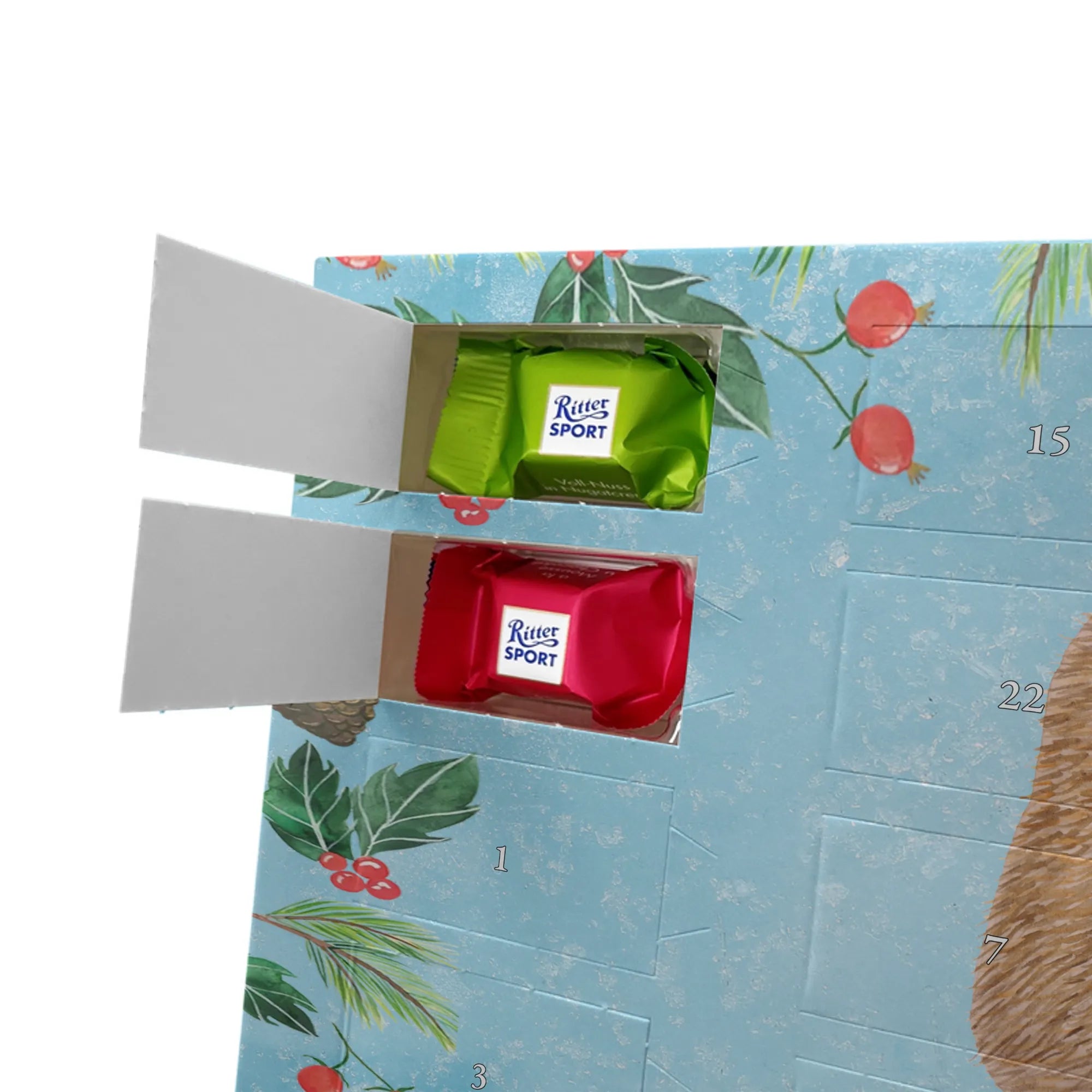 Adventskalender mit Schokolade – so schmeckt Vorfreude! Unser Mr. & Mrs. Panda Adventskalender ist liebevoll gestaltet und bedruckt mit wunderschönen Motiven & Sprüchen, die jeden Tag versüßen. Die brillante Druckqualität mit seidenmatter Oberflächenveredelung sorgt für ein edles Finish, und auch die Seitenflächen sind hübsch bedruckt. Der Kalender ist nicht personalisierbar, dafür aber vielseitig einsetzbar: Maße: 325 mm x 225 mm x 27 mm und die besondere Eigenschaft, dass du ihn aufgehängt oder aufgestellt verwenden kannst, geben dir Flexibilität bei der Dekoration. Gefüllt ist der Kalender mit Ritter Sport Schokowürfeln in beliebten Geschmacksrichtungen wie Mousse au Chocolat, Schoko Crisp, Voll-Nuss in Nougatcreme, Karamell Duo, Joghurt und Erdbeer-Joghurt. Wichtig: Es handelt sich um einen Kalender gefüllt mit Ritter Sport Schokolade, nicht um einen Kalender der Marke Ritter Sport. Ideal als Geschenk oder als Adventsdeko für dein Zuhause – kleine Schokofreuden warten hinter jedem Türchen.