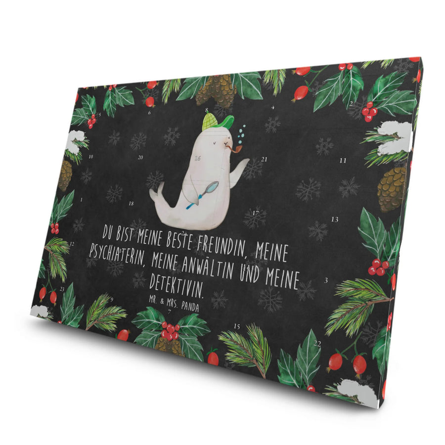 Die Kombination aus dem niedlichen Robbenmotiv und dem charmanten Spruch "Du bist meine beste Freundin, meine Psychiaterin, meine Anwältin und meine Detektivin." macht diesen Adventskalender zu einem perfekten Geschenk für besondere Anlässe wie Freunde treffen, Adventsfeiern oder einfach als kleine Aufmerksamkeit.