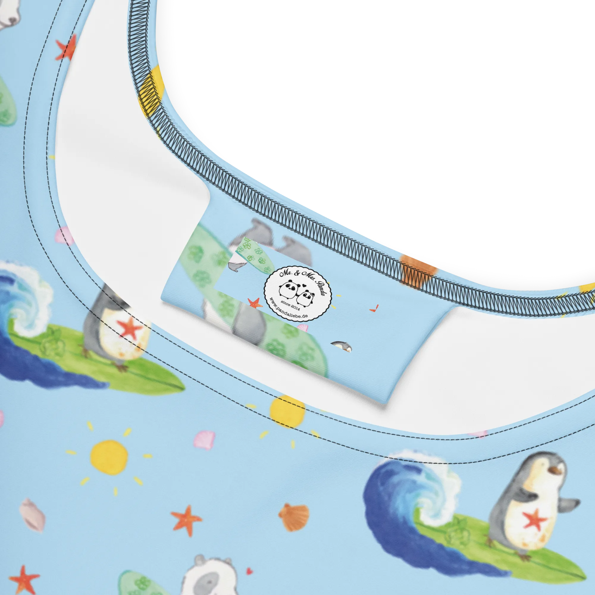 Das wunderschöne Sommerkleid mit dem niedlichen Pinguin Surfer Motiv von Mr. & Mrs. Panda ist der perfekte Begleiter für alle, die den Sommer in vollen Zügen genießen möchten! Mit seinem farbenfrohen Design bringt dieses Kleid Lebensfreude und lässt dich von Urlaub am Strand träumen. Der süße Pinguin, der mit seinem Surfbrett über die Wellen reitet, inspirierte nicht nur Surfbegeisterte, sondern auch all jene, die das stürmische Leben meistern möchten. Der Slogan 'Du kannst das stürmische Leben nicht stoppen, aber du kannst lernen, wie man surft.' erinnert uns daran, dass das Leben voller Überraschungen steckt, die mit einer Portion Mut und Spaß gemeistert werden wollen.