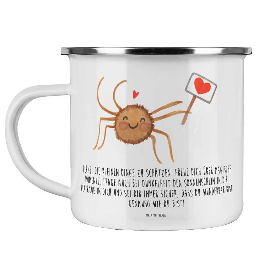 Die Camping Emaille Tasse mit dem Motiv Spinne Agathe Motivation von Mr. & Mrs. Panda ist dein perfekter Begleiter für alle Outdoor-Abenteuer! Ob beim Camping, Wandern oder einfach beim Picknick im Park, diese Tasse kombiniert Funktionalität mit einer großen Portion guter Laune. Die Tasse hat die ideale Füllmenge von 300 ml und ist aus kratzfester Emaille gefertigt, sodass sie gegen die Herausforderungen der Natur bestens gewappnet ist.