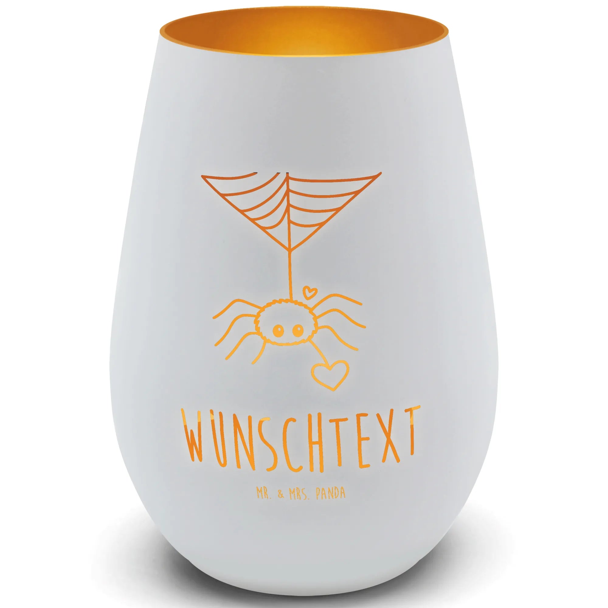 Entdecke das goldene Windlicht personalisiert mit der niedlichen Spinne Agathe aus der Kollektion Spinne Agathe, ein perfektes Geschenk für Liebende! Dieses wunderschöne Windlicht ist nicht nur ein Blickfang, sondern auch ein Ausdruck Deiner Zuneigung. Agathe, die süße Spinne, symbolisiert die schönen Facetten der Liebe und bringt mit ihrem Spruch 'Du bist mir ins Netz gegangen...' ein Lächeln auf jedes Gesicht.