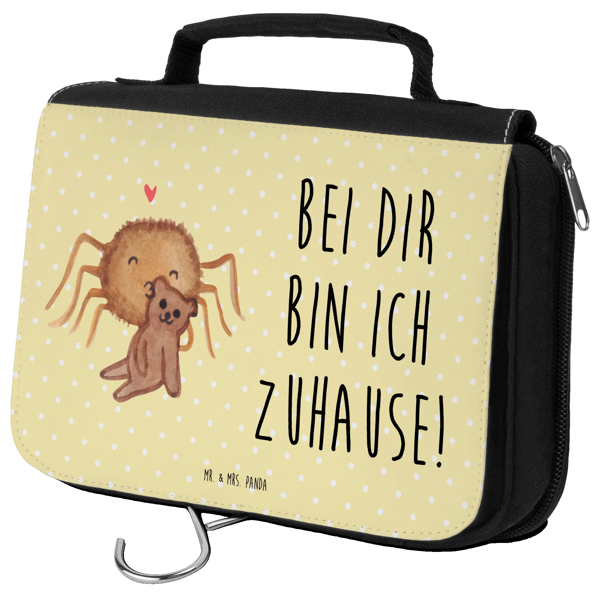 Das niedliche Motiv der Spinne Agathe, die ihren kleinen Teddy mit leuchtenden Augen hält, verbreitet Freude und Verliebtheit - es ist ein echter Liebesbeweis! Die Spinne Agathe ist nicht nur ein herziges Design, sondern auch Teil der beliebten Kollektion, die durch die sozialen Medien von Mr. & Mrs. Panda berühmt wurde. Die kreative Schöpfung von Mrs. Panda ist mit viel Liebe zum Detail handgezeichnet und bringt eine besondere Note in Deinen Alltag. Der Slogan „Bei dir bin ich zuhause!“ ergänzt das Gesamtkonzept und macht diesen Kulturbeutel zu einem perfekten Geschenk für Freunde und Familie.