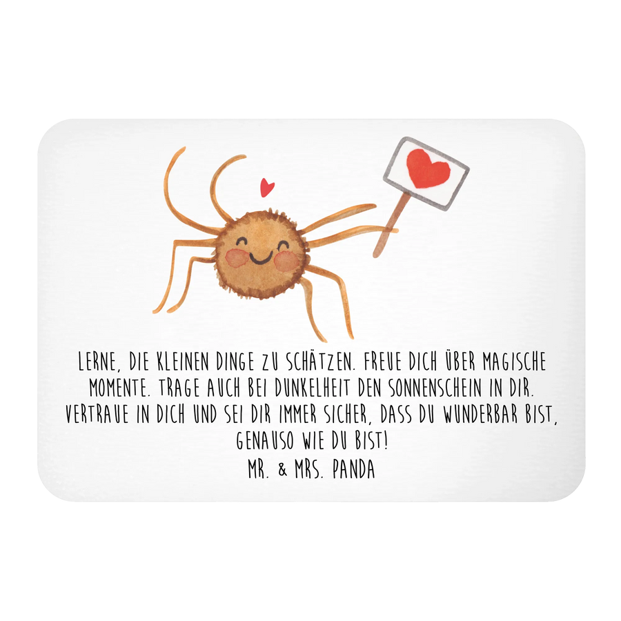 Die liebevoll handgezeichnete Spinne Agathe, die ein Herz in ihren Armen hält, strahlt Vertrauen und Freude aus. Ihre beschwingte Haltung wird garantiert jeden Morgen ein Lächeln auf dein Gesicht zaubern. Ob als Geschenk für Freunde oder Familie oder für dich selbst, dieser Magnet mit dem Motiv der Spinne Agathe soll dich daran erinnern, die kleinen Dinge im Leben zu schätzen.