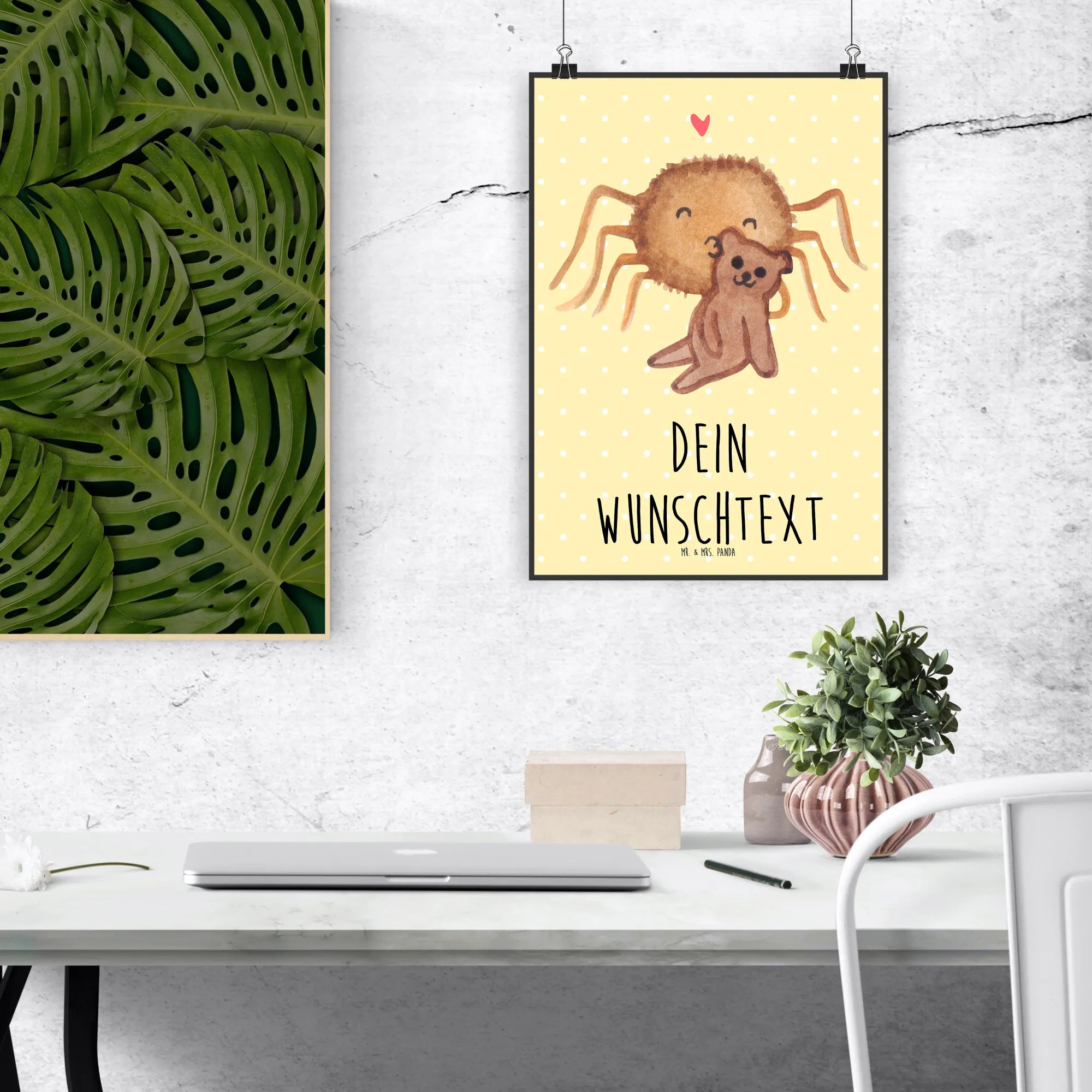 Die niedliche Spinne Agathe umarmt ihren kleinen Teddy mit strahlenden Augen und einem herzlichen Lächeln. Dieses handgezeichnete Motiv von Mrs. Panda ist ein echter Hingucker und erzählt eine herzerwärmende Geschichte von Treue und Miteinander. Jedes Poster ist personalisierbar mit deinem Wunschtext oder Namen und macht es zu einem ganz besonderen Geschenk, sei es für deinen Partner, deine beste Freundin oder dein Kind.