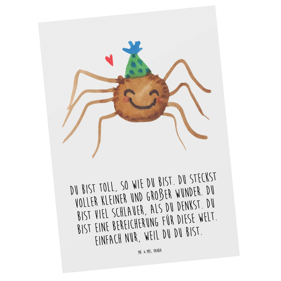 Die Postkarte "Spinne Agathe Party" aus der bezaubernden Kollektion von Mr. & Mrs. Panda ist das perfekte Geschenk für liebe Freunde, Familie oder auch für Dich selbst! In einer Welt, in der Selbstliebe, Glück und Motivation immer wichtiger werden, bringt diese Karte ein Stück Freude und Lebensbejahung in jeden Alltag.