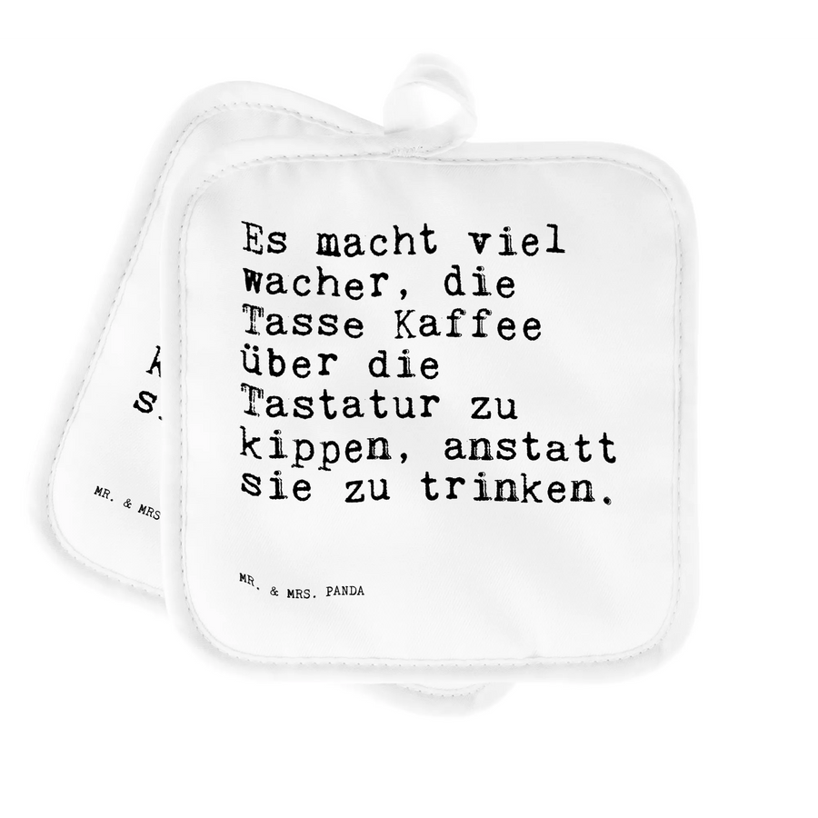 Die Mr. & Mrs. Panda Topflappen sind das perfekte Geschenk für jeden, der gerne in der Küche experimentiert oder einfach nur stilvoll backen und kochen möchte. Diese zwei wunderschönen Topflappen sind nicht nur praktisch, sie bringen auch ein Lächeln auf die Lippen! Mit dem lustigen Spruch 'Es macht viel wacher, die Tasse Kaffee über die Tastatur zu kippen, anstatt sie zu trinken.' sind sie besonders für alle geeignet, die viel Zeit am PC verbringen – sei es im Büro, beim Homeoffice oder beim kreativen Arbeiten. Sie sind die ideale Geschenkidee für Kollegen, Kolleginnen, den Chef oder die Chefin!