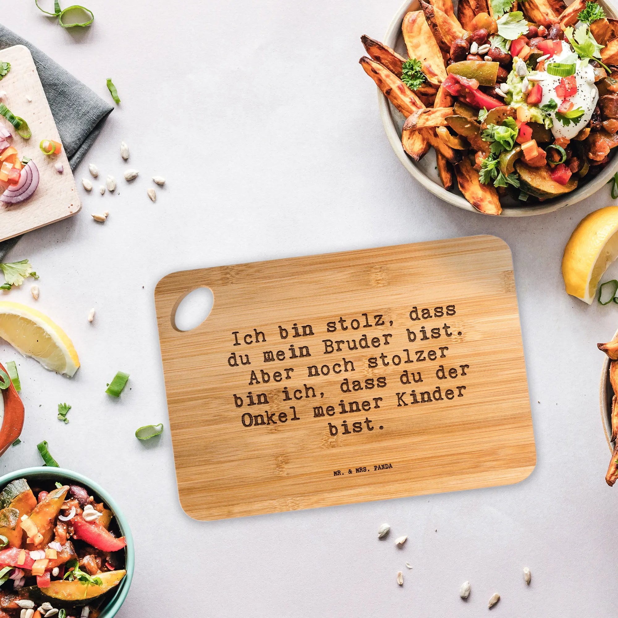 Praktisch und schön – das Bambus-Schneidebrett von Mr. & Mrs. Panda misst 225 mm x 145 mm x 10 mm und ist perfekt für deine Küchenabenteuer. Aus hochwertigem Bambusholz gefertigt, vereint es Funktionalität und Stil. Die langlebige Lasergravur mit liebevollen Motiven und Sprüchen macht das Kochen zum Vergnügen. Ob als Frühstücksbrett oder zum Vorbereiten schmackhafter Speisen, dieses Brett wird dein neuer Küchenliebling! Achte darauf, das Schneidebrett sanft mit der Hand zu reinigen, da es nicht für die Spülmaschine geeignet ist. Mach deiner Familie oder Freunden mit diesem schönen Brett eine Freude!