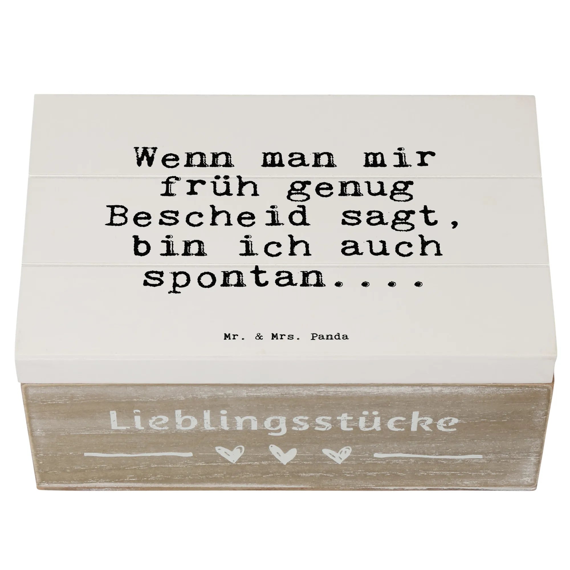 Die Holzkiste "Wenn man mir früh genug Bescheid sagt, bin ich auch spontan...." von Mr. & Mrs. Panda ist das perfekte Geschenk für alle, die spontane Abenteuer und unvergessliche Momente lieben. Diese wunderschöne Holzkiste ist nicht nur ein echter Hingucker, sondern auch ein praktischer Aufbewahrungsort für all deine Schätze.