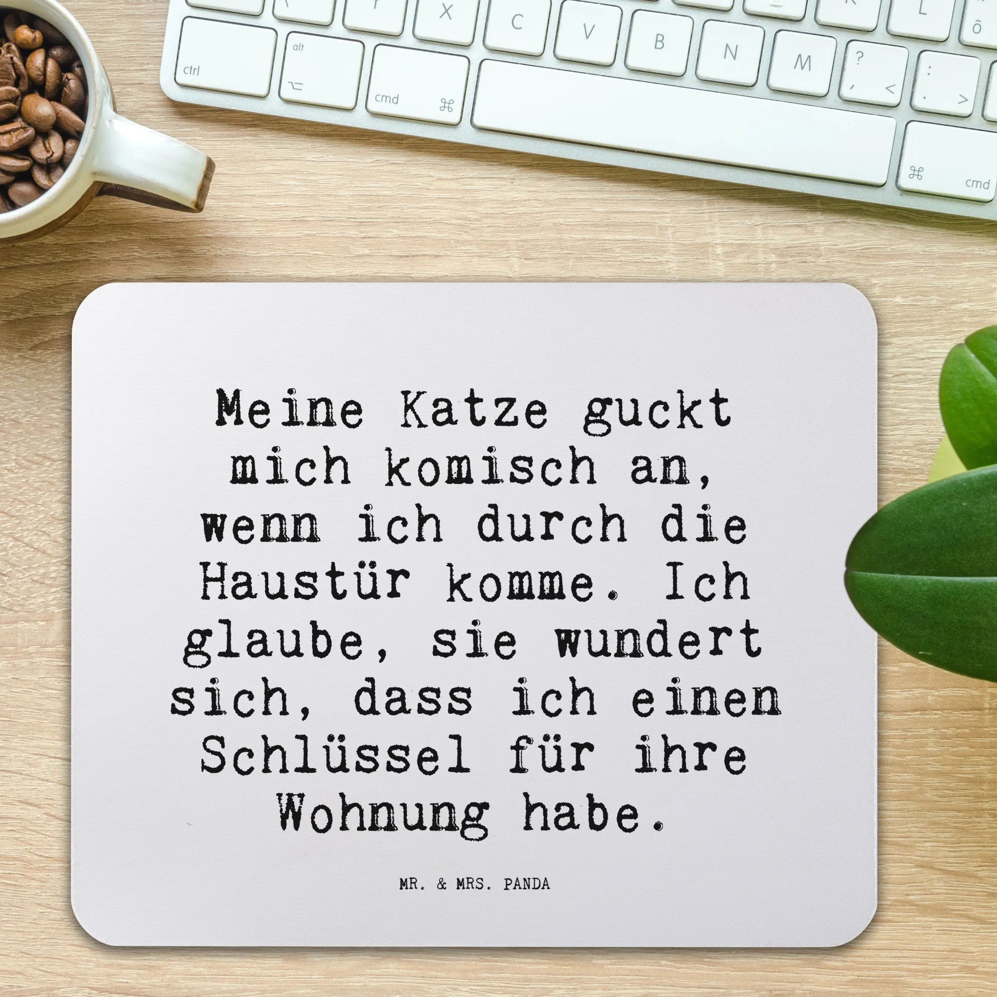Entdecke das perfekte Mauspad von Mr. & Mrs. Panda mit dem einzigartigen Spruch "Meine Katze guckt mich komisch an, wenn ich durch die Haustür komme. Ich glaube, sie wundert sich, dass ich einen Schlüssel für ihre Wohnung habe." Dieses wunderschöne und angenehme Mauspad ist nicht nur ein echter Blickfang in jedem Büro, sondern auch ein praktisches Accessoire für deinen Arbeitsalltag! Besonders Katzenliebhaber werden begeistert sein, denn es erinnert sie jeden Tag an ihre geliebte Miezekatze.