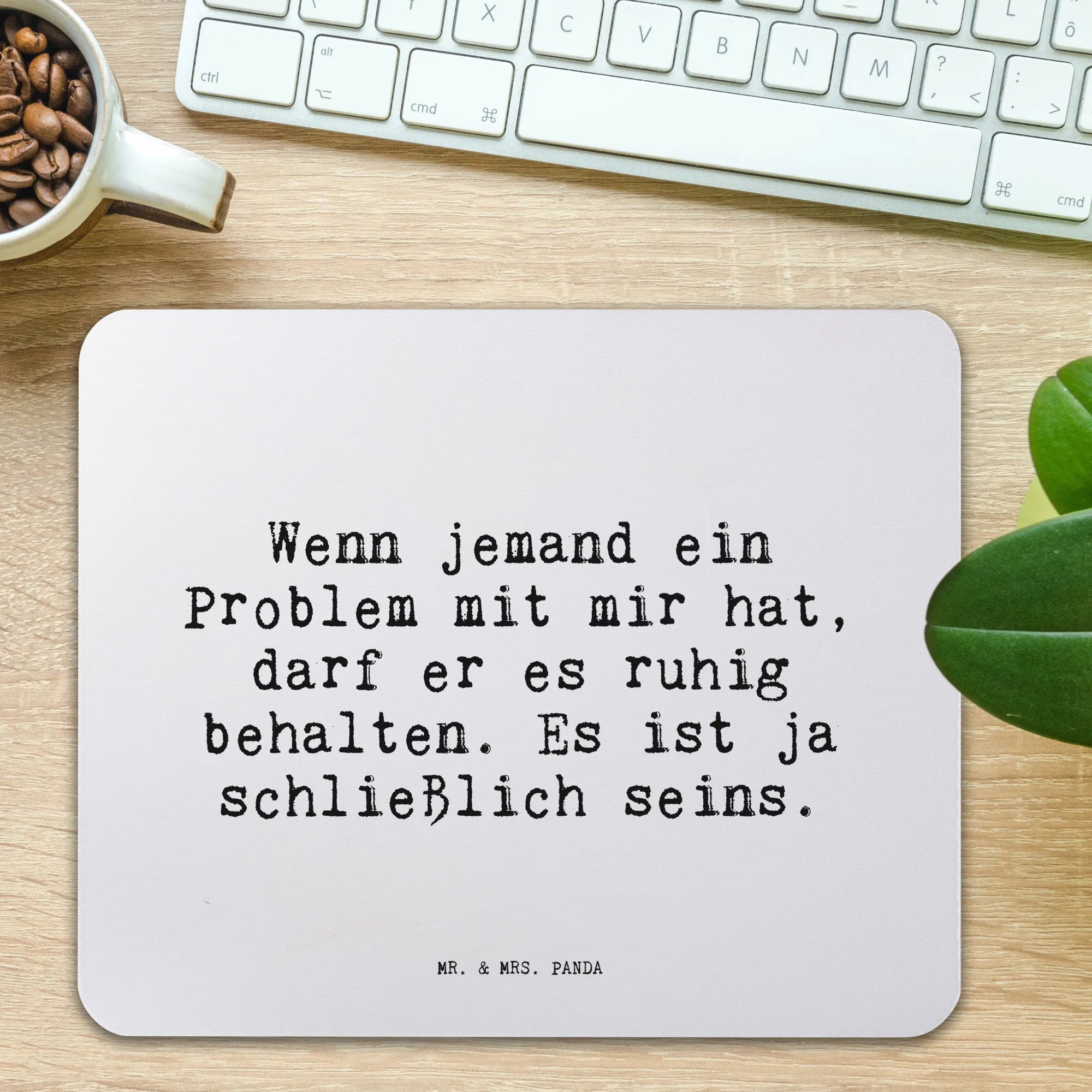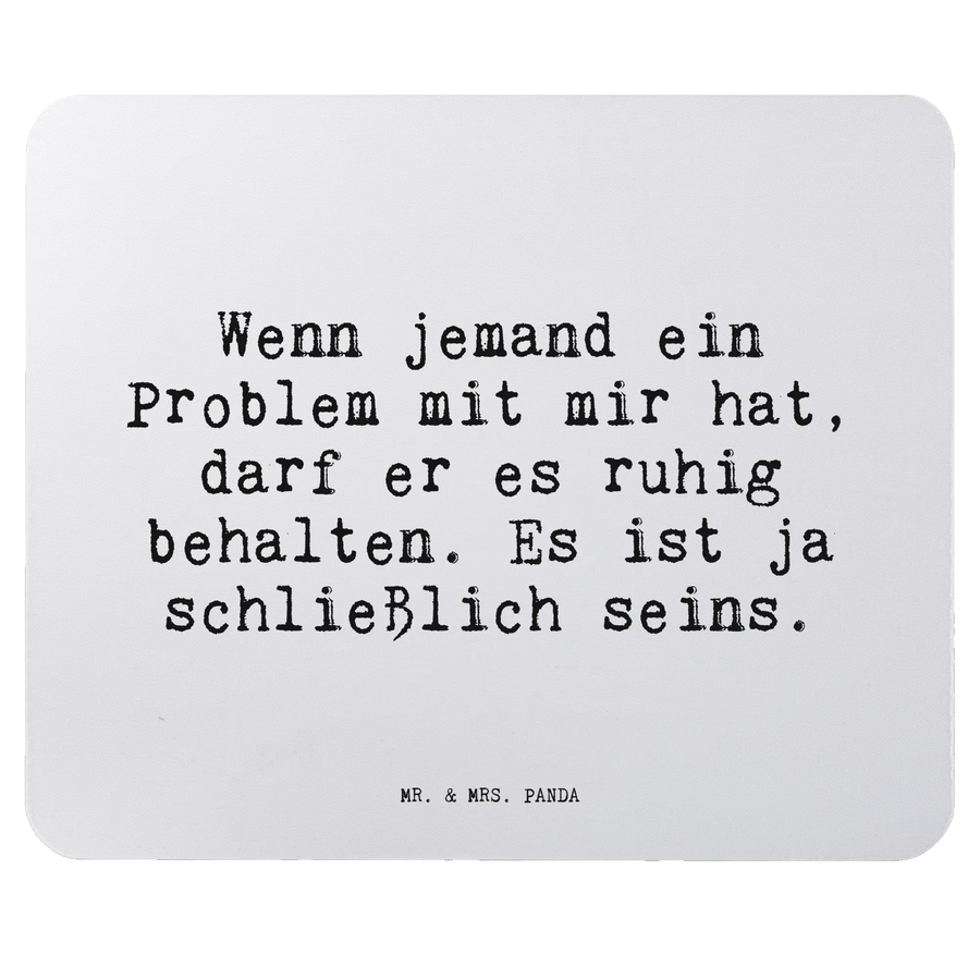 Das perfekte Mauspad für jeden, der sich in seinem Büro oder Homeoffice wohlfühlen möchte! Das wunderschöne und einzigartige Mauspad von Mr. & Mrs. Panda zeigt den witzigen Spruch: "Wenn jemand ein Problem mit mir hat, darf er es ruhig behalten. Es ist ja schließlich seins." Dieser humorvolle Spruch bringt ein Lächeln auf dein Gesicht und macht das Arbeiten gleich viel angenehmer.