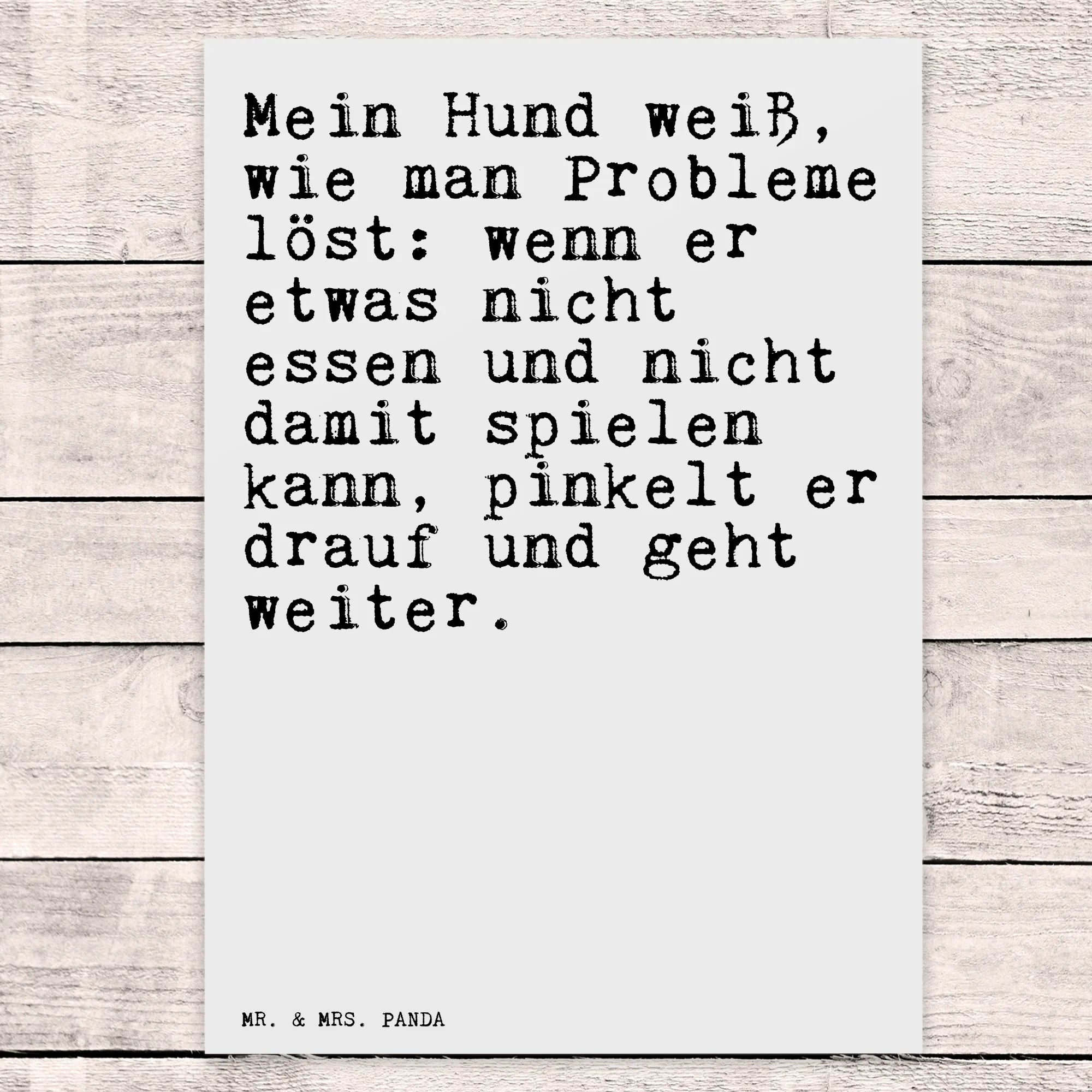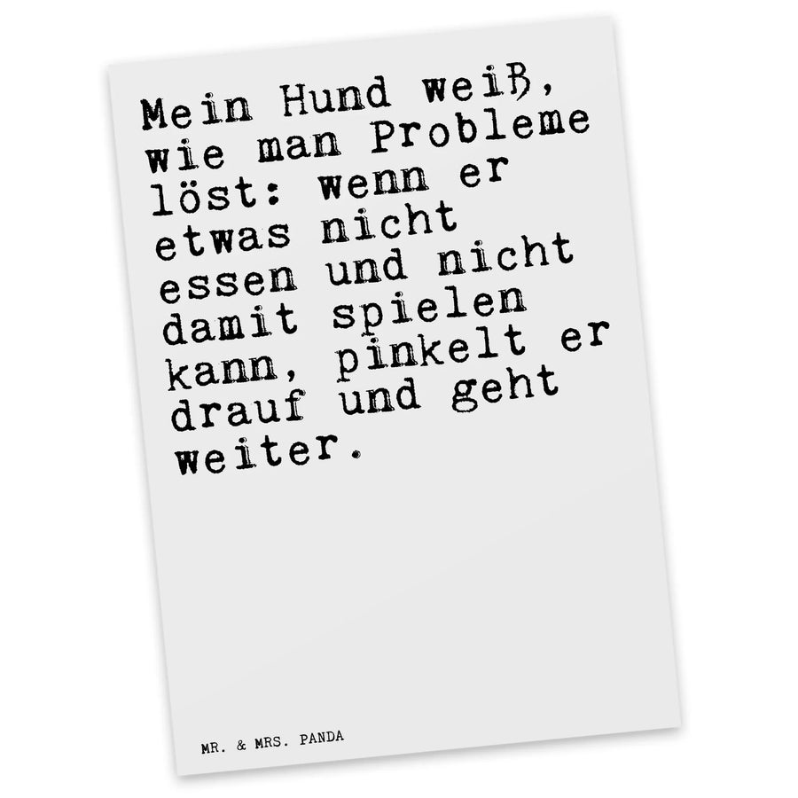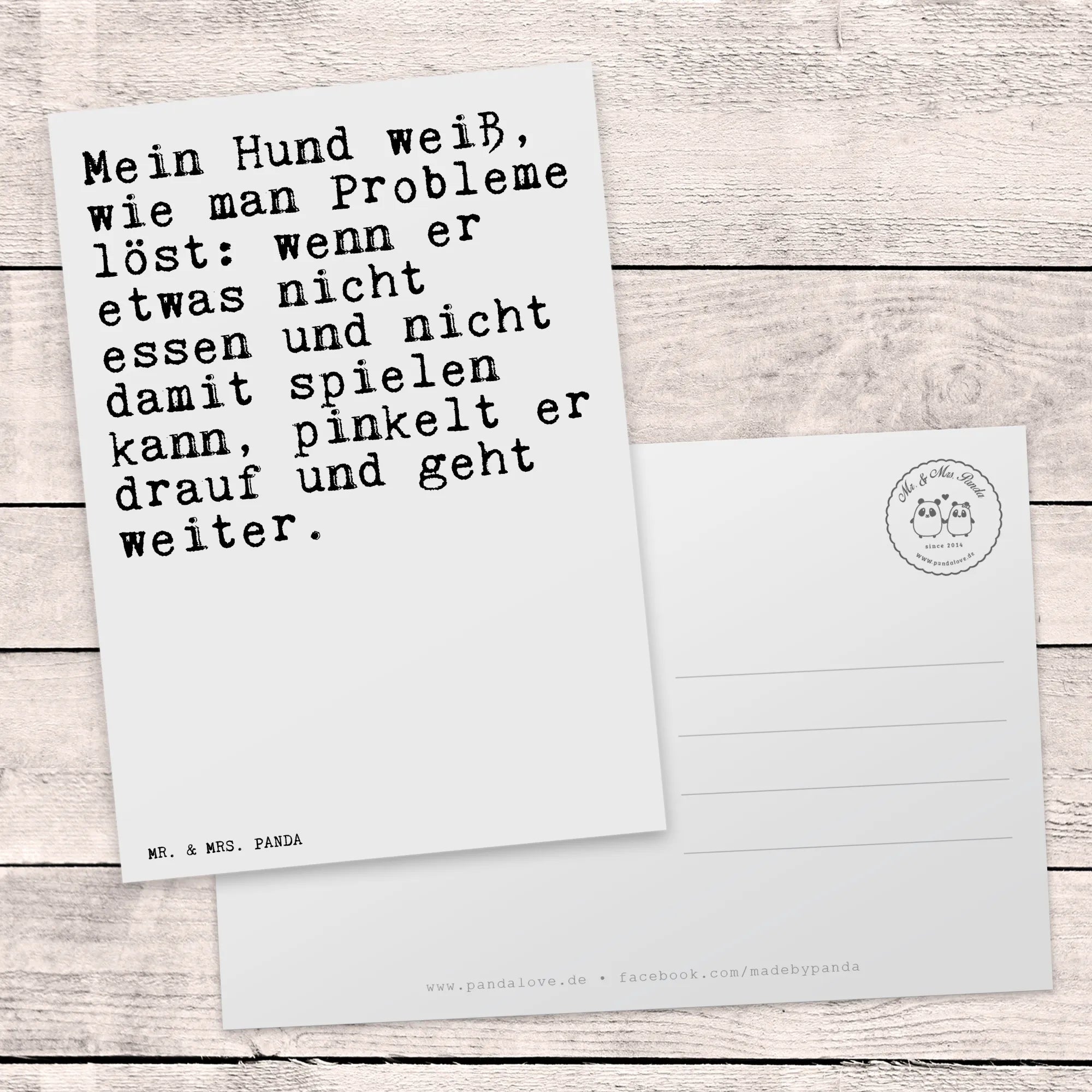 Du bist auf der Suche nach einem originellen Geschenk für Hundeliebhaber? Dann ist diese einzigartige Postkarte von Mr. & Mrs. Panda genau das Richtige für dich! Mit dem witzigen Spruch "Mein Hund weiß, wie man Probleme löst: wenn er etwas nicht essen und nicht damit spielen kann, pinkelt er drauf und geht weiter." bringt sie garantiert ein Lächeln auf die Gesichter aller Hundebesitzer.
