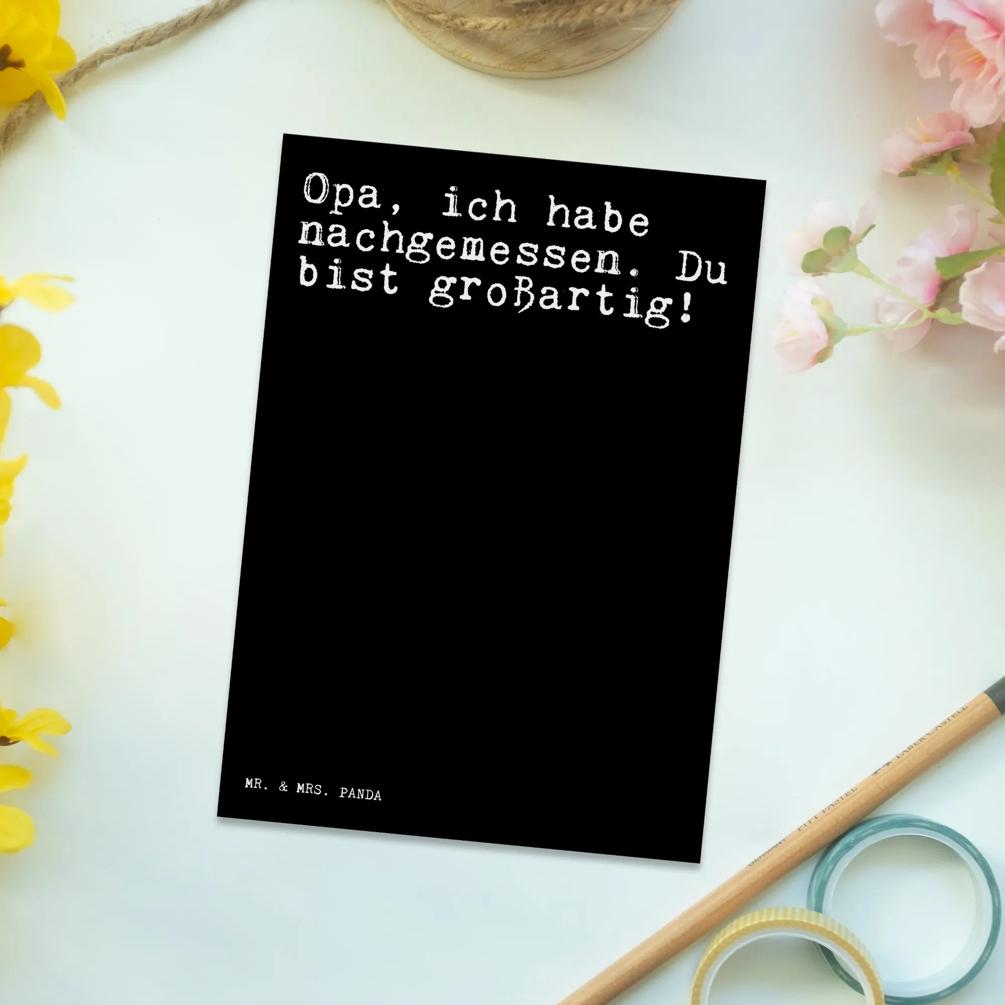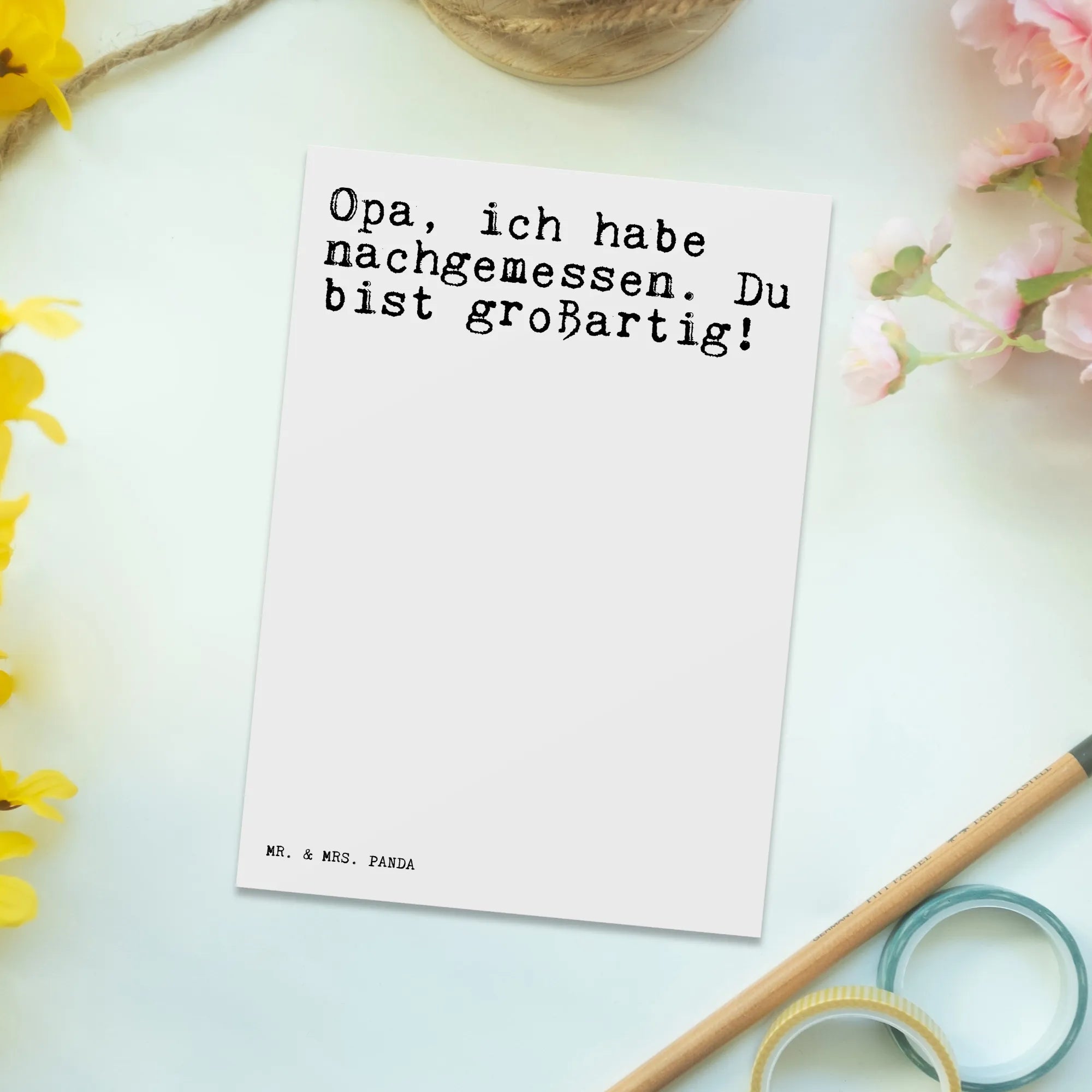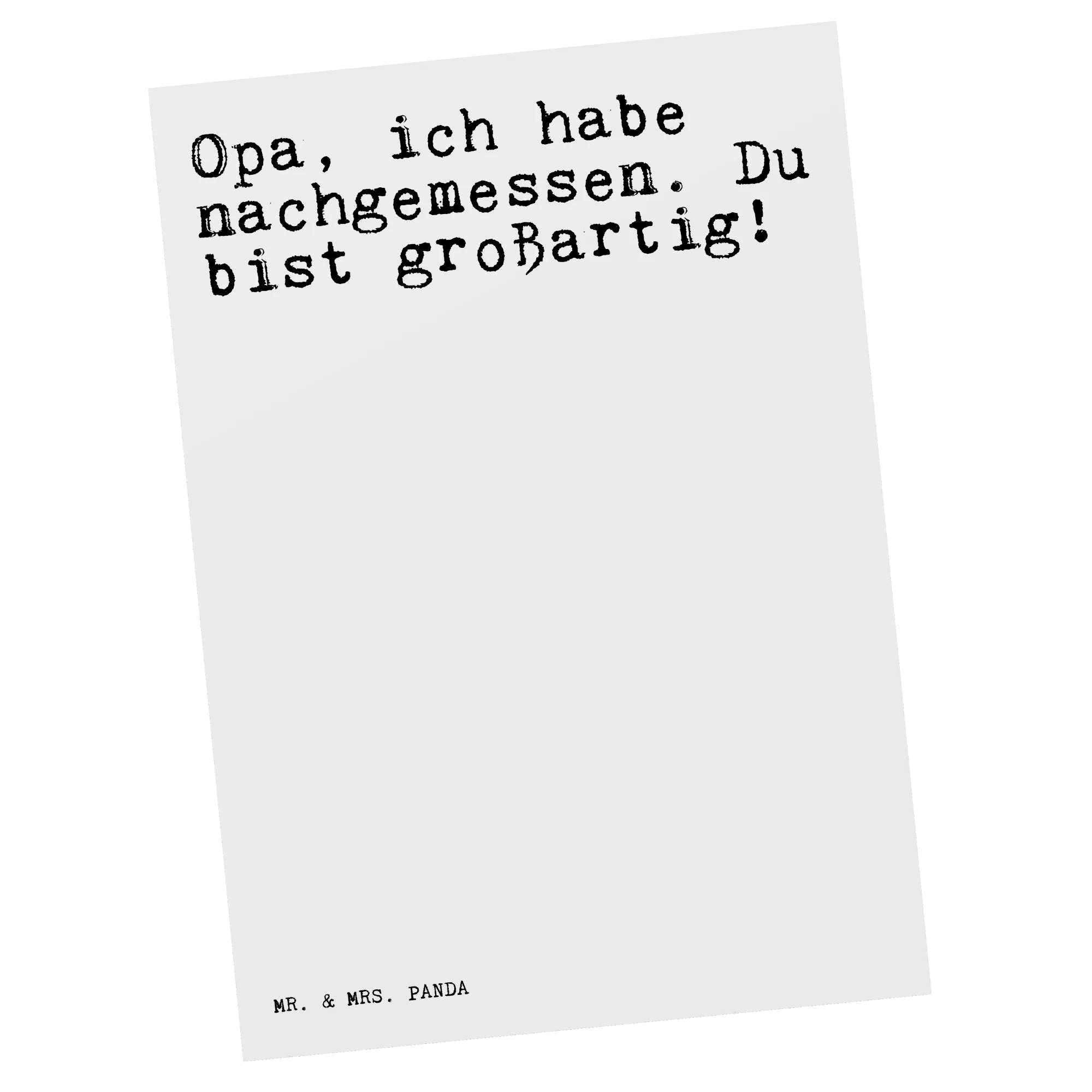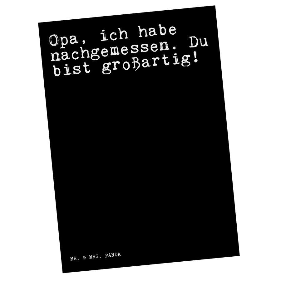 Suchst du nach einer großartigen Möglichkeit, deinem Opa zu zeigen, wie sehr du ihn schätzt? Dann ist die einzigartige Postkarte von Mr. & Mrs. Panda genau das richtige Geschenk für ihn! Mit dem lustigen Spruch "Opa, ich habe nachgemessen. Du bist großartig!" bringt diese Karte garantiert ein Lächeln auf sein Gesicht.