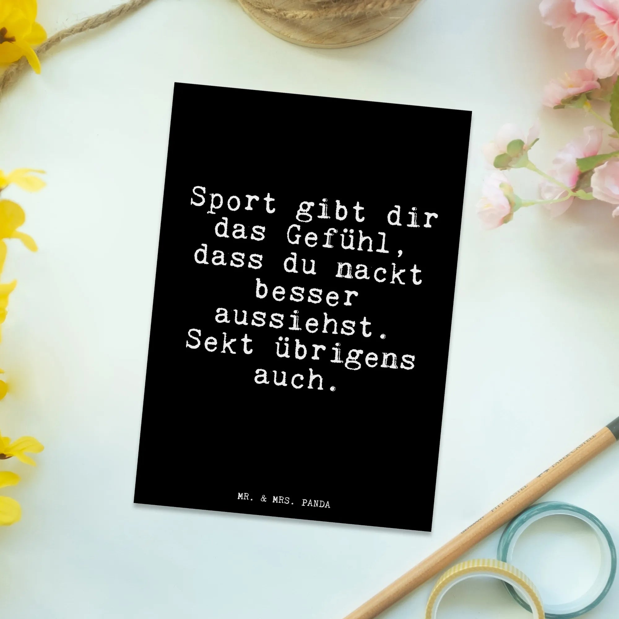 Die Postkarte mit dem witzigen Spruch "Sport gibt dir das Gefühl, dass du nackt besser aussiehst. Sekt übrigens auch." ist das perfekte Geschenk für alle, die eine humorvolle Erinnerung an den Sport suchen oder einfach nur einen Lacher bei Freunden und Familie verbreiten möchten.