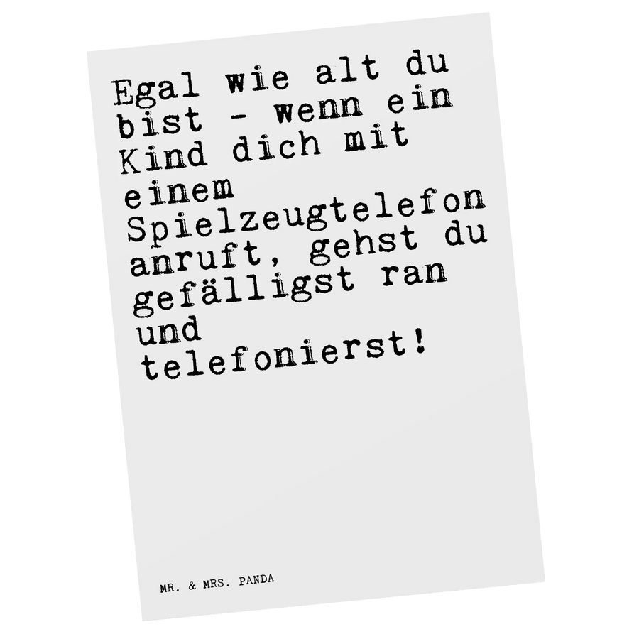 Entdecke die bezaubernde Postkarte von Mr. & Mrs. Panda, die mit einem ganz besonderen Spruch aufwartet: "Egal wie alt du bist - wenn ein Kind dich mit einem Spielzeugtelefon anruft, gehst du gefälligst ran und telefonierst!" Diese liebevoll gestaltete Karte gehört zur Spruchreif Kollektion von Mr. & Mrs. Panda und bringt garantiert ein Lächeln auf das Gesicht des Empfängers.