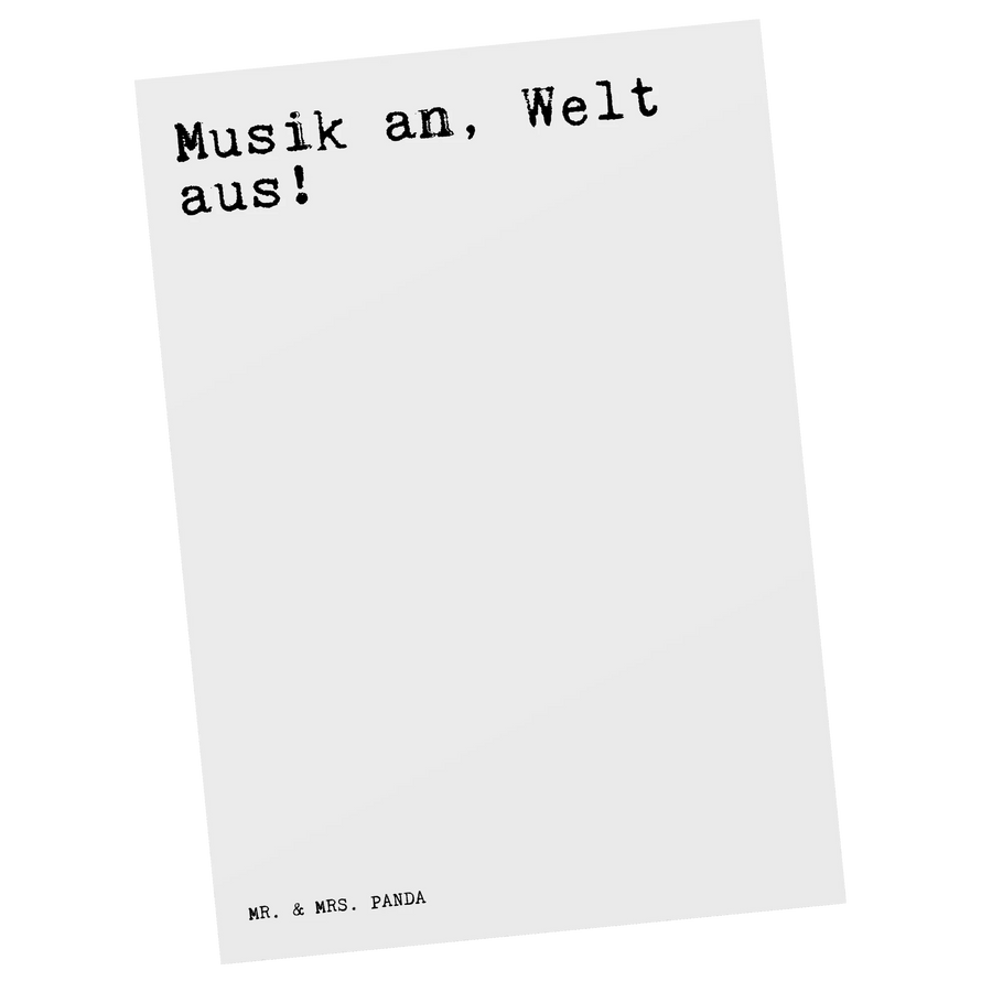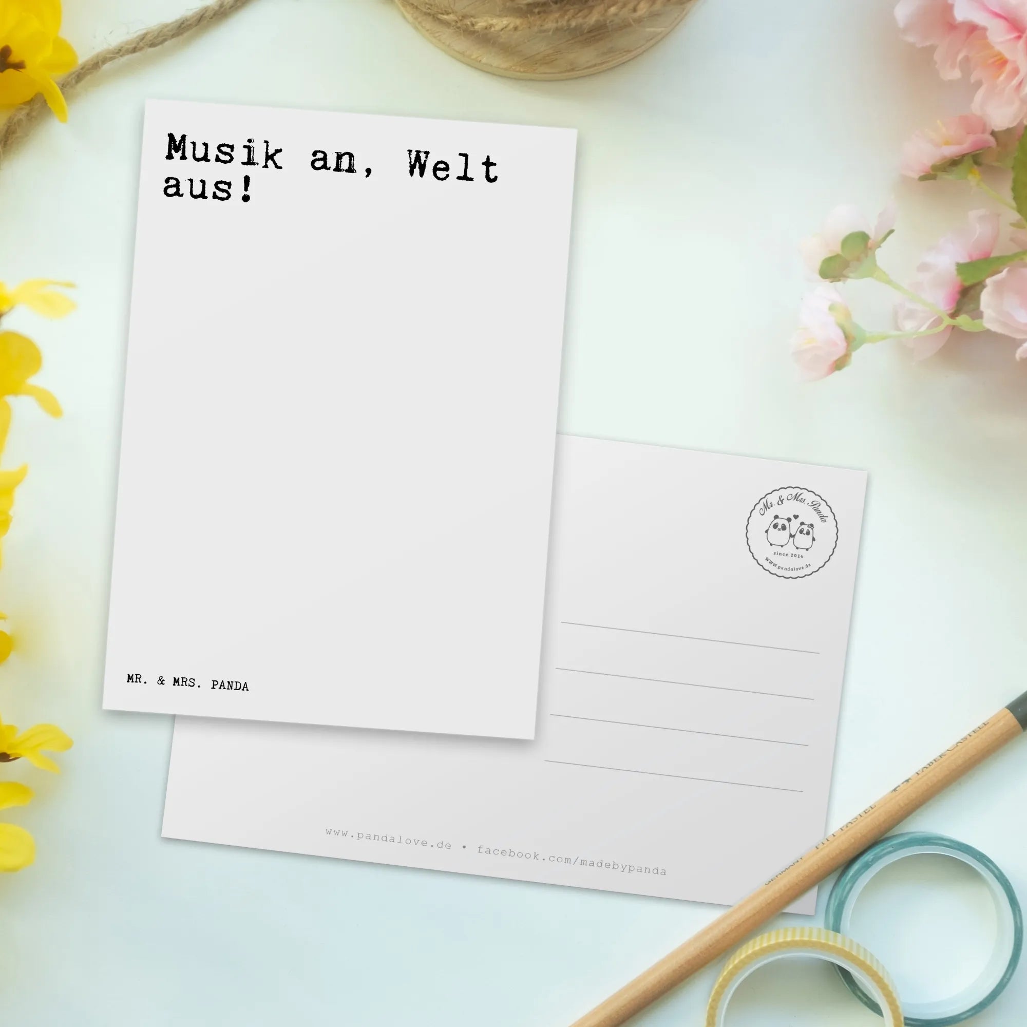 Bist du auf der Suche nach der perfekten Grußkarte für einen Musikliebhaber? Dann ist die Postkarte "Musik an, Welt aus!" von Mr. & Mrs. Panda genau das Richtige für dich!
