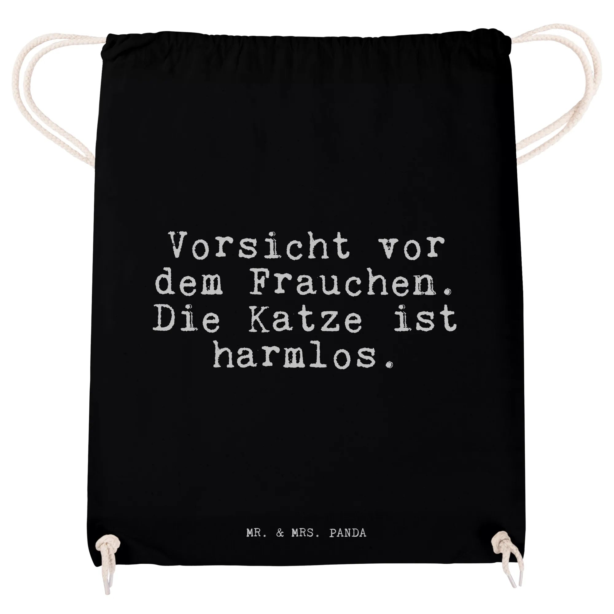 Vorsicht vor dem Frauchen. Die Katze ist harmlos. – Dieser witzige Sportbeutel aus der Spruchreif-Kollektion von Mr. & Mrs. Panda ist das ideale Geschenk für alle, die Katzen lieben und Humor schätzen. Der freche Spruch ist ein echter Hingucker und zeigt auf charmante Weise, wer da die Hosen – oder besser gesagt die Katzenregeln – an der Leine hat.