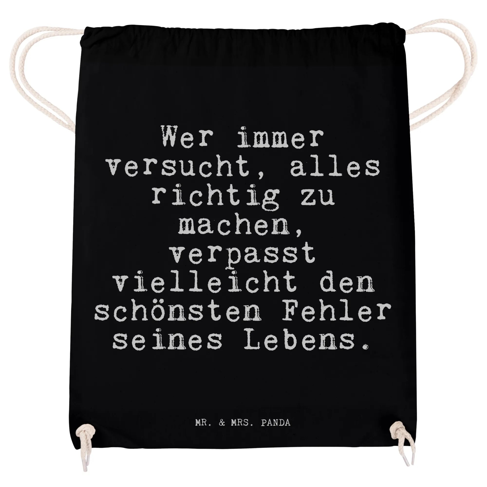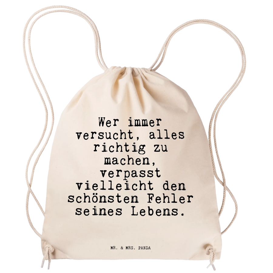 Der Sportbeutel „Wer immer versucht, alles richtig zu machen, verpasst vielleicht den schönsten Fehler seines Lebens“ von Mr. & Mrs. Panda ist nicht nur ein echter Hingucker, sondern auch das perfekte Geschenk für all diejenigen, die das Leben in vollen Zügen genießen wollen! Ideal für Sport, Freizeit oder einen Ausflug zum nächsten Festival – dieser bequeme Turnbeutel ist dein bester Begleiter.