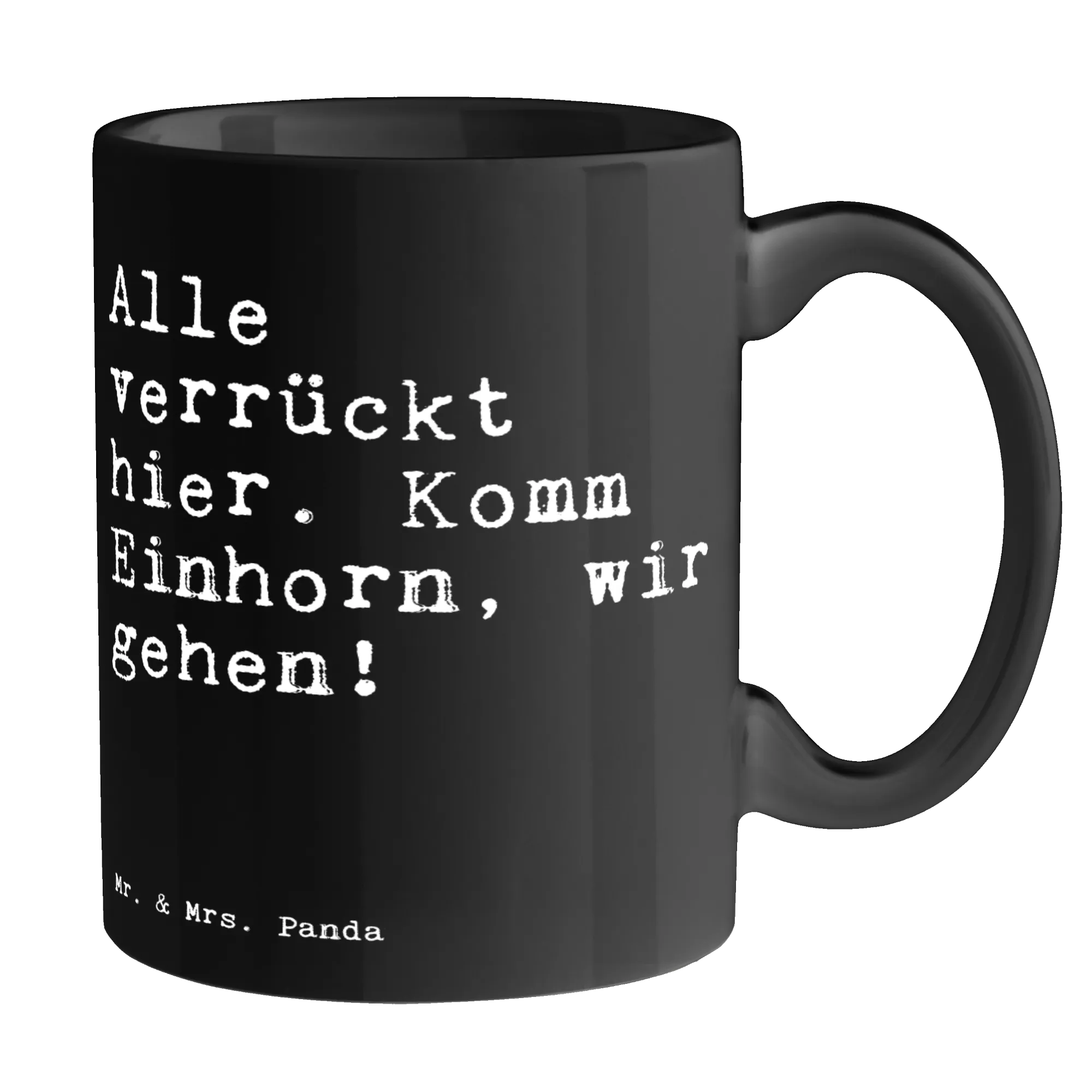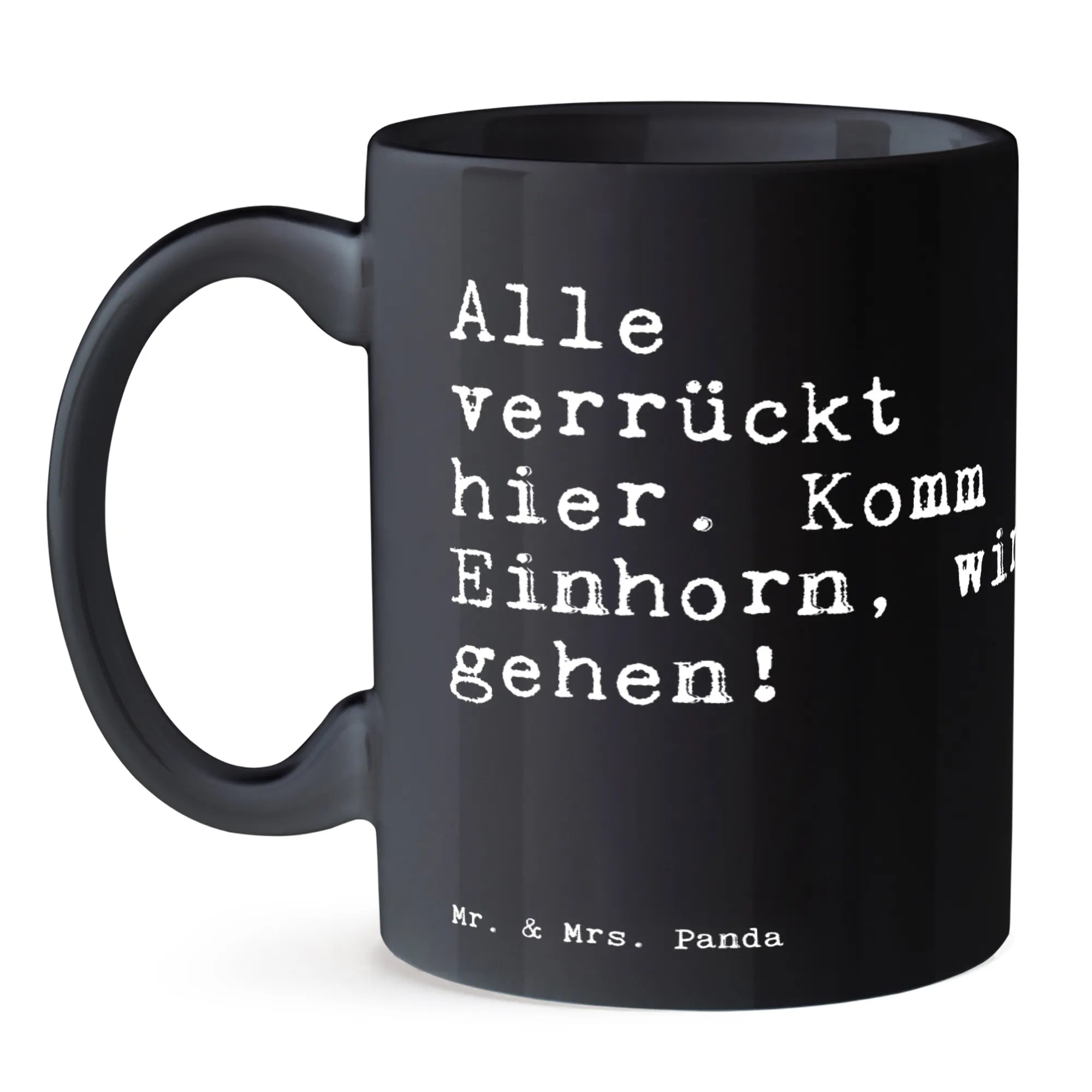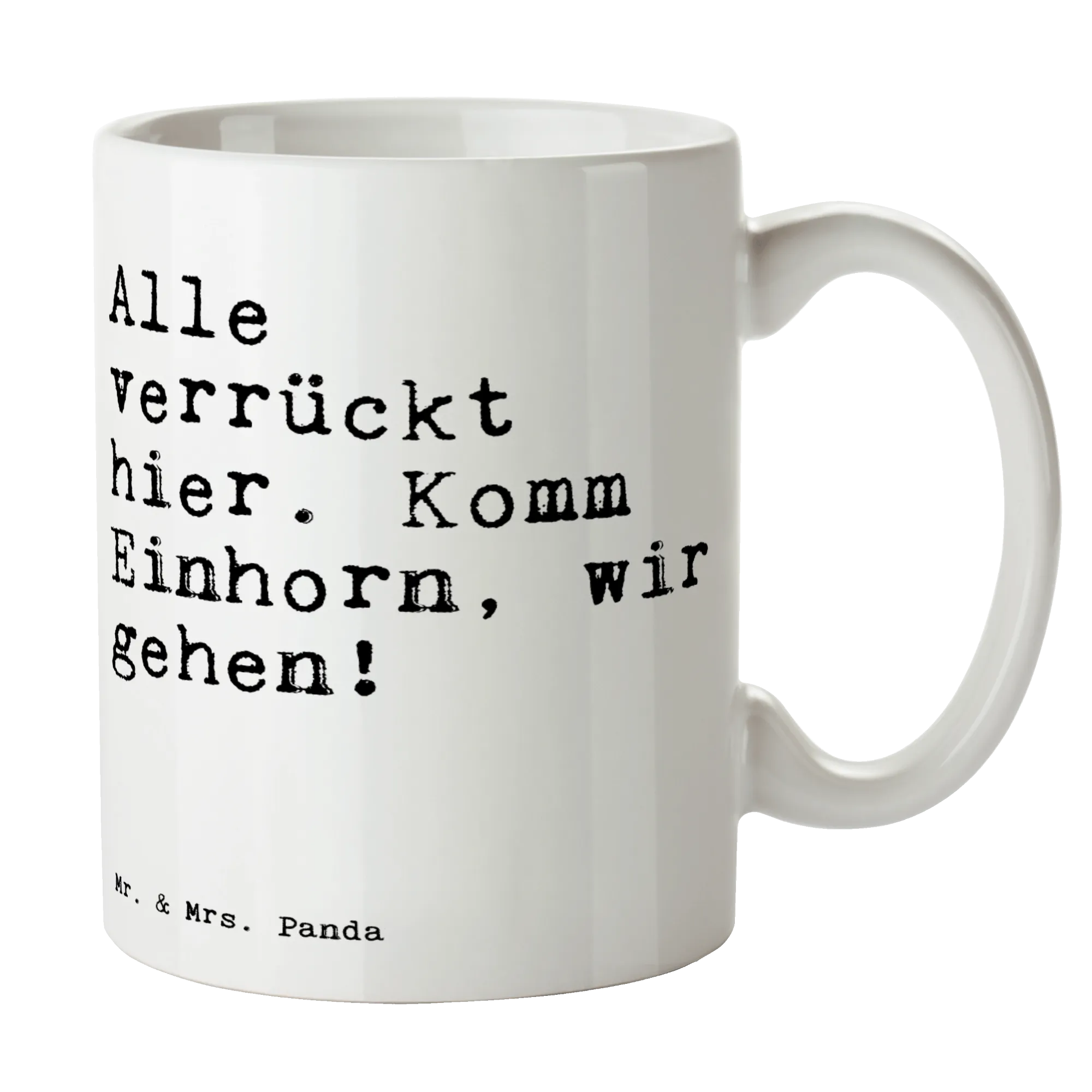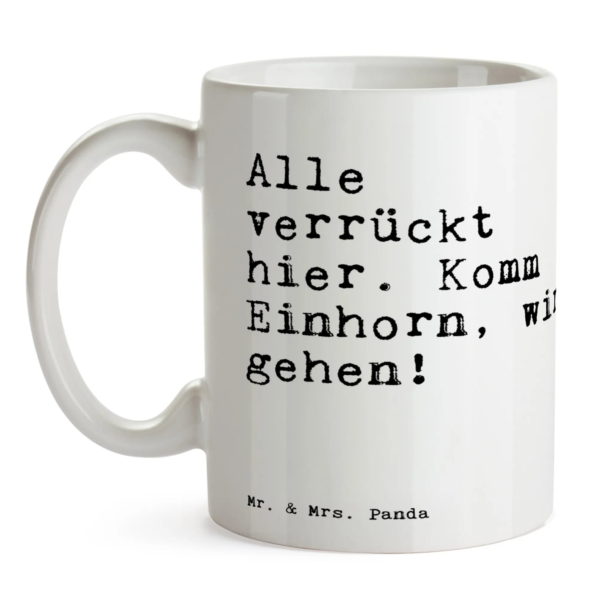 Tasse Sprüche und Zitate Alle verrückt hier. Komm Einhorn, wir gehen! – Mr. & Mrs. Panda