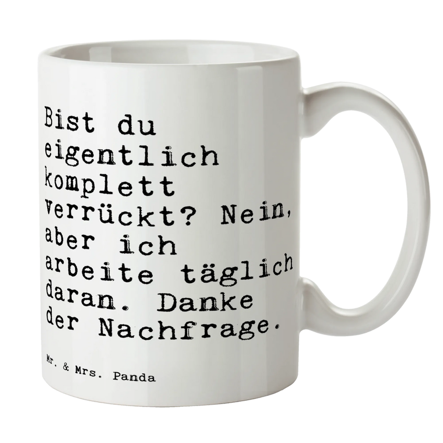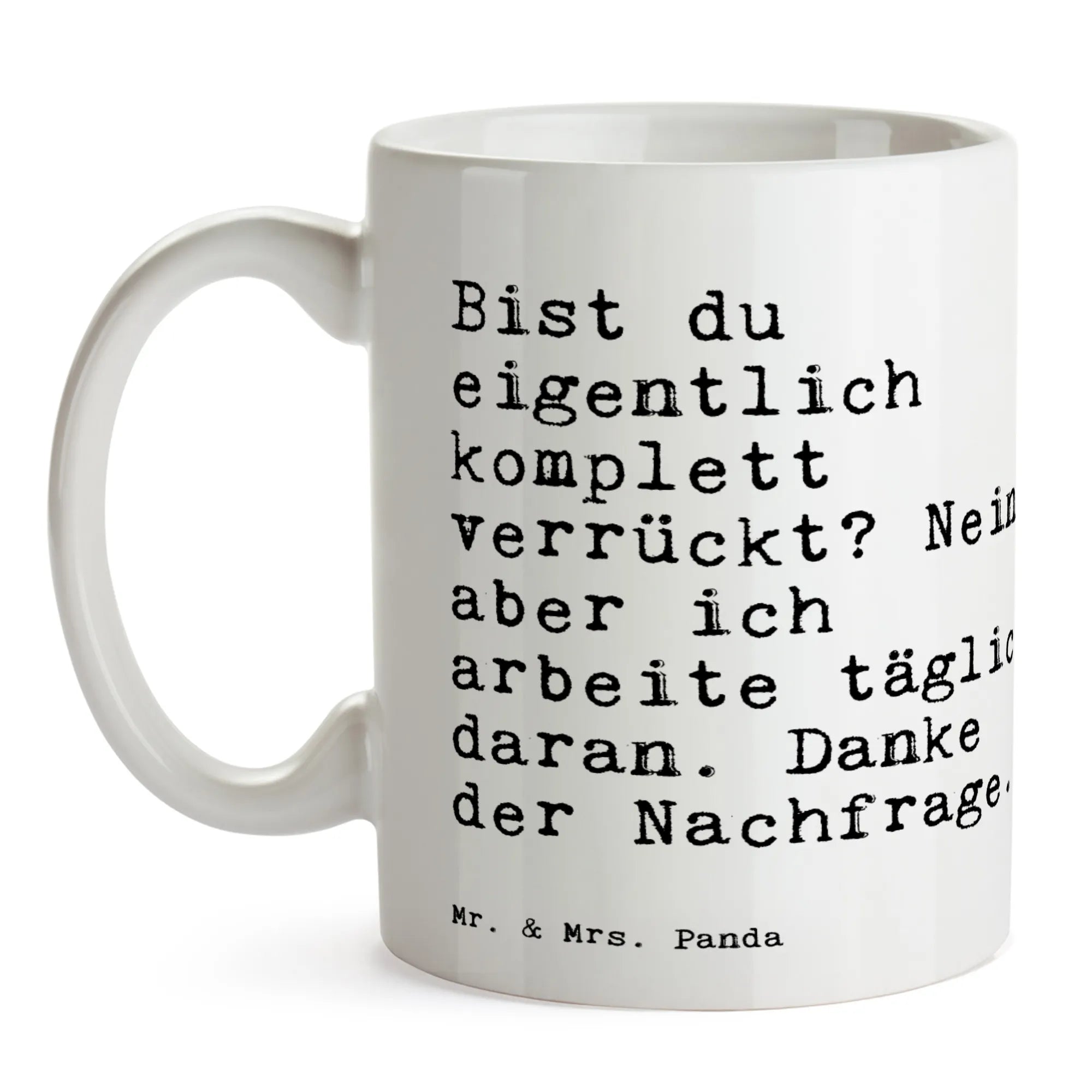 Tasse Sprüche und Zitate Bist du eigentlich komplett verrückt? Nein, aber ich arbeite täglich daran. Danke der Nachfrage. - Keramik - Weiß