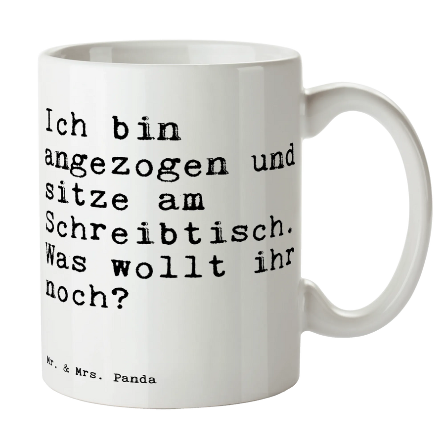 Die perfekte Tasse für alle, die im Büro sitzen und es humorvoll angehen! Mit dem Spruch "Ich bin angezogen und sitze am Schreibtisch. Was wollt ihr noch?" bringt diese Tasse nicht nur einen Hauch von Lebensfreude in deinen Arbeitsalltag, sondern ist auch ein tolles Geschenk für Kollegen, Chefs oder Freunde. Egal, ob zum Bürogeburtstag, zur Firmenfeier oder einfach so – diese Kaffeetasse aus der Kollektion von Mr. & Mrs. Panda macht immer eine gute Figur.