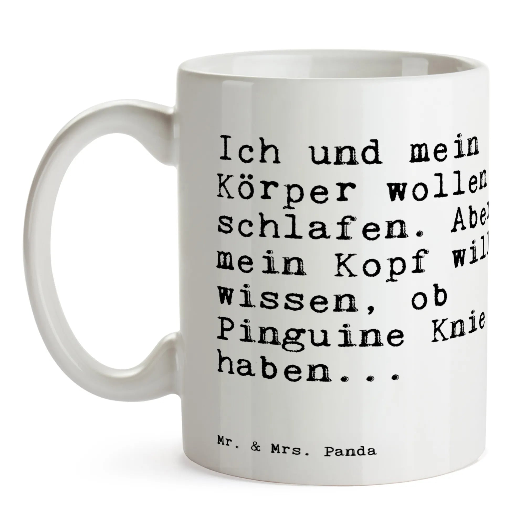 Du liegst im Bett, willst schlafen, aber Dein Kopf will unbedingt wissen, ob Pinguine Knie haben? Genau solche Momente fängt unsere Tasse mit Spruch ein: „Ich und mein Körper wollen schlafen. Aber mein Kopf will wissen, ob Pinguine Knie haben...“ Diese Kaffeetasse aus der Spruchreif Kollektion ist der ideale Begleiter für alle, die Humor in den Alltag bringen möchten.