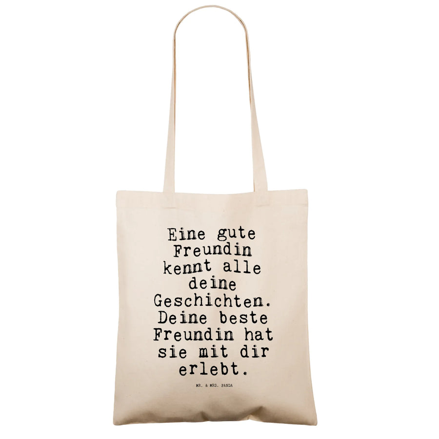 Eine kleine Liebeserklärung an die beste Freundin! 💕 Die Tragetasche von Mr. & Mrs. Panda trägt den liebevollen Spruch: „Eine gute Freundin kennt alle deine Geschichten. Deine beste Freundin hat sie mit dir erlebt.“ Sie ist das perfekte Geschenk für Deine BFF, die Ehefrau oder die Freundin, die mit dir durch dick und dünn geht.