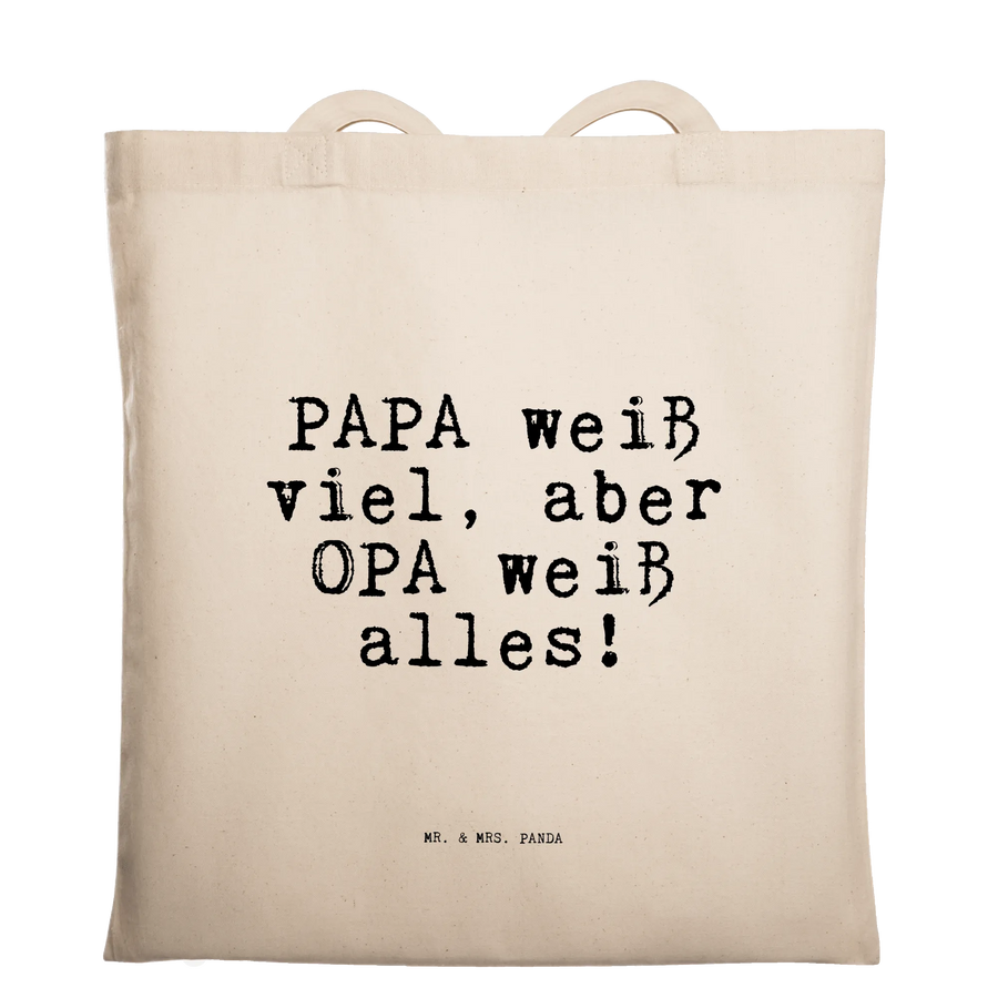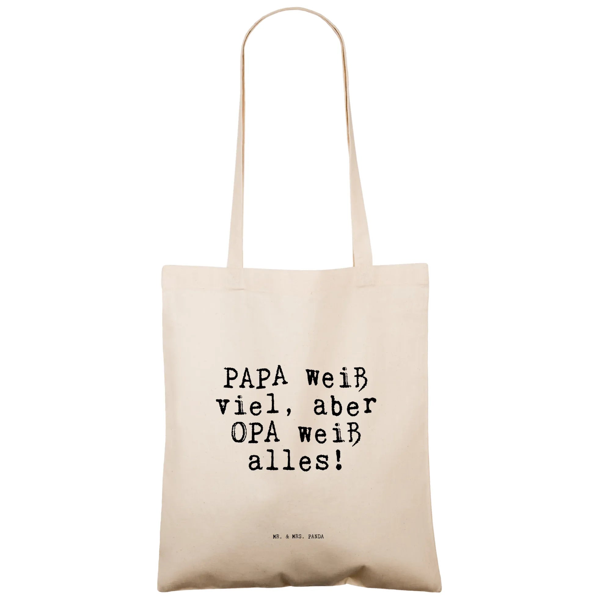 Die Tragetasche "PAPA weiß viel, aber OPA weiß alles!" von Mr. & Mrs. Panda ist das perfekte Geschenk für Väter und Großväter, die stolz auf ihre Familie sind. Mit einem humorvollen Spruch und einem ansprechenden Design wird diese Tragetasche ein treuer Begleiter bei allen Gelegenheiten.